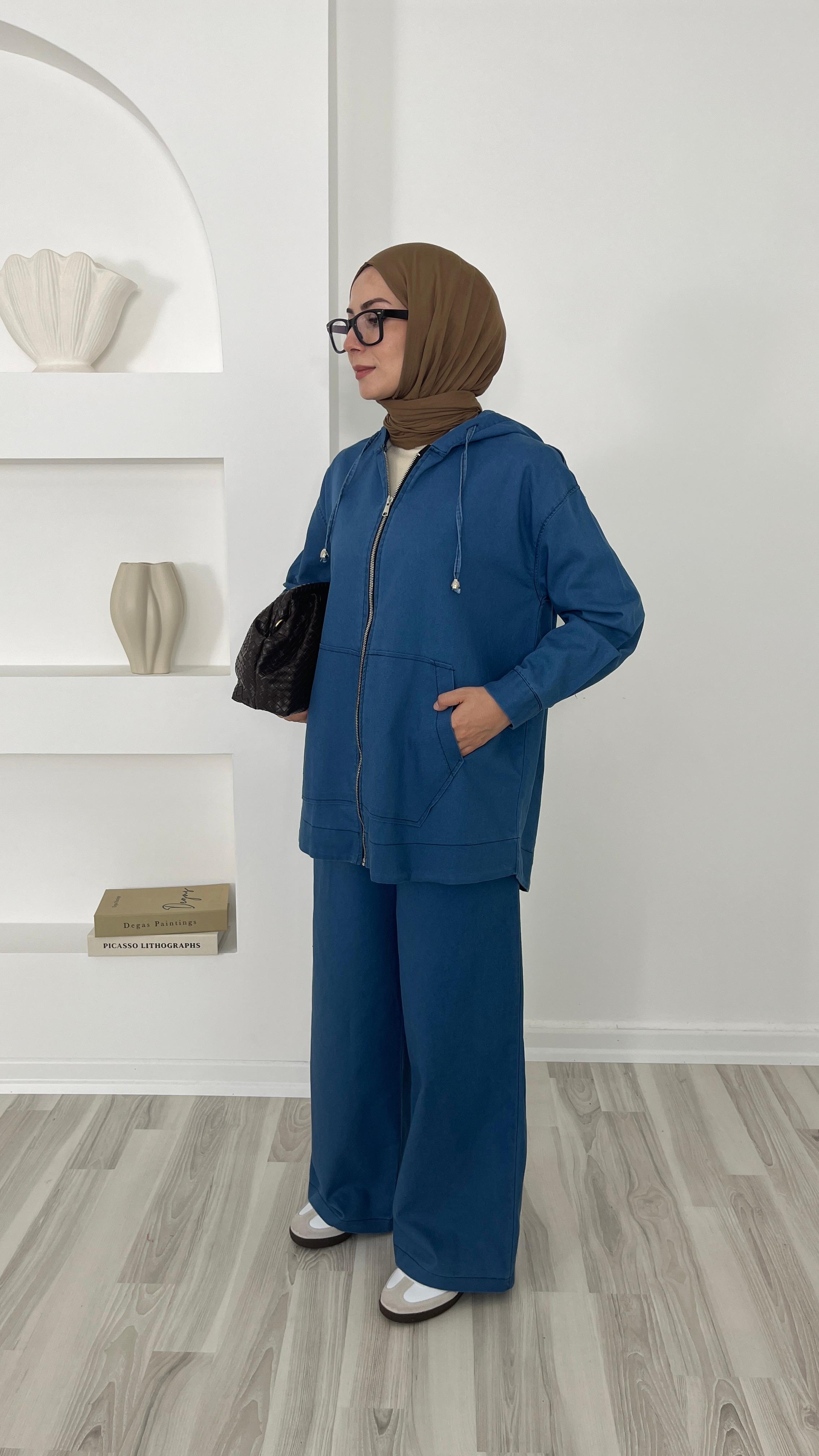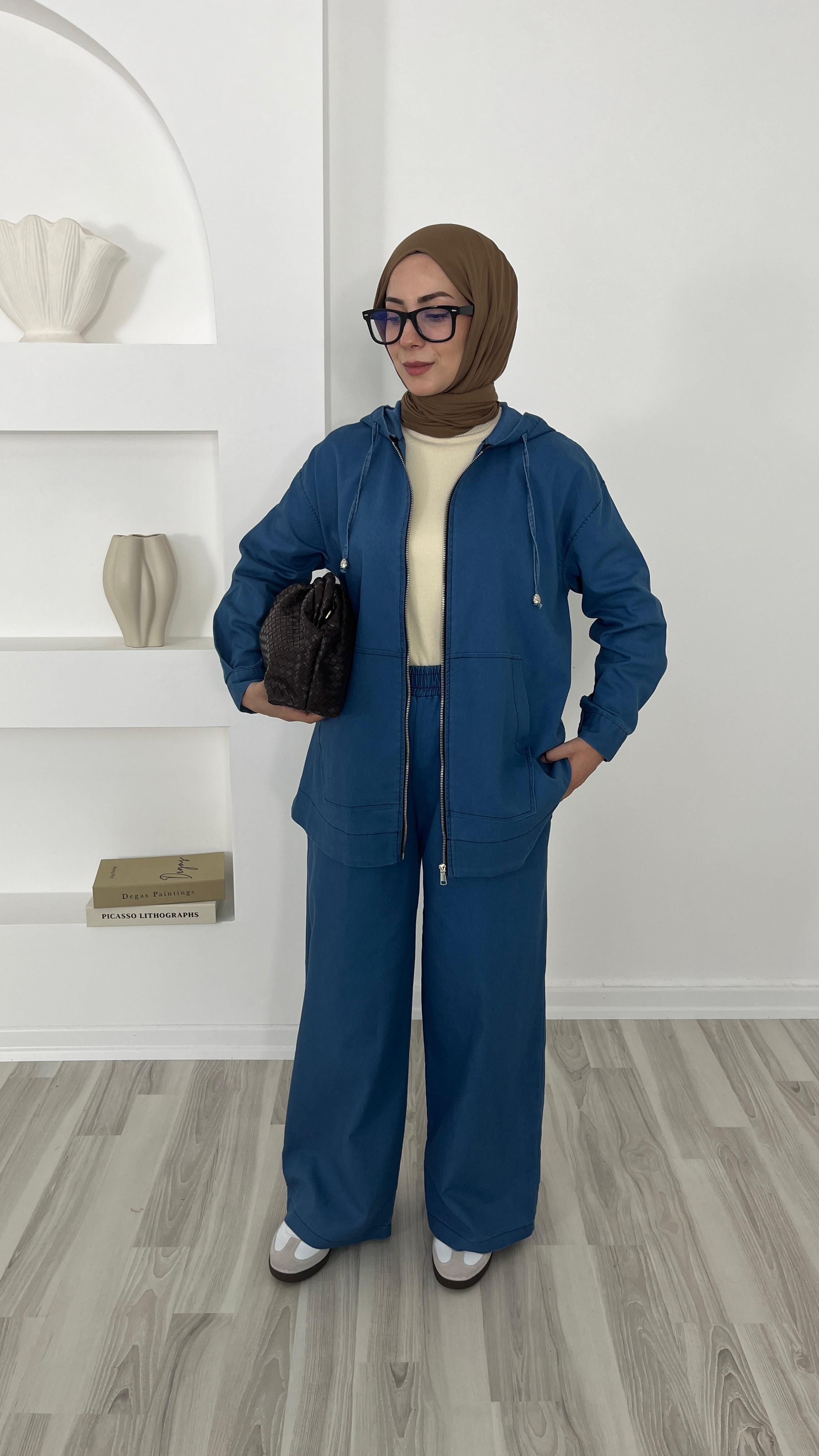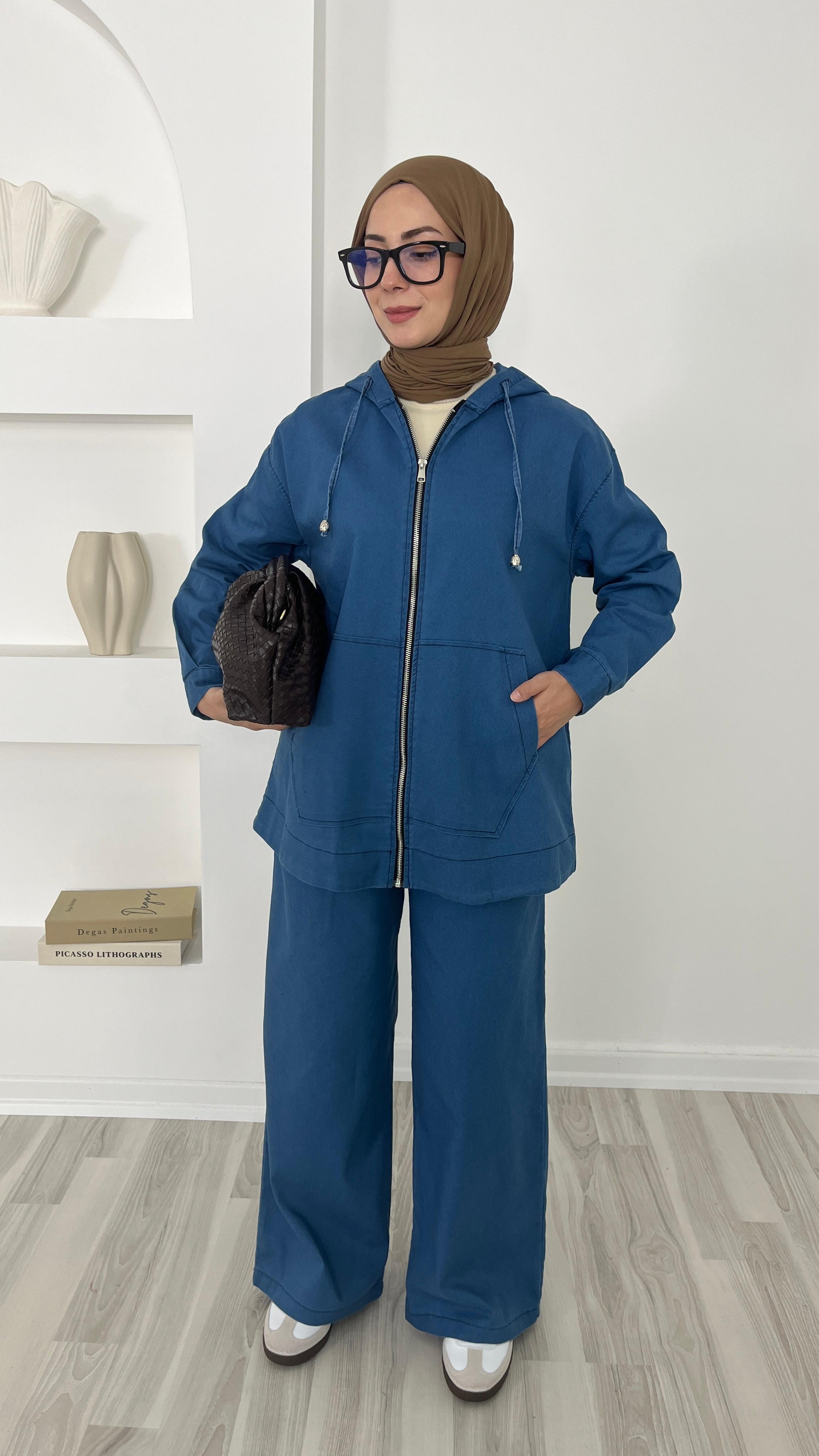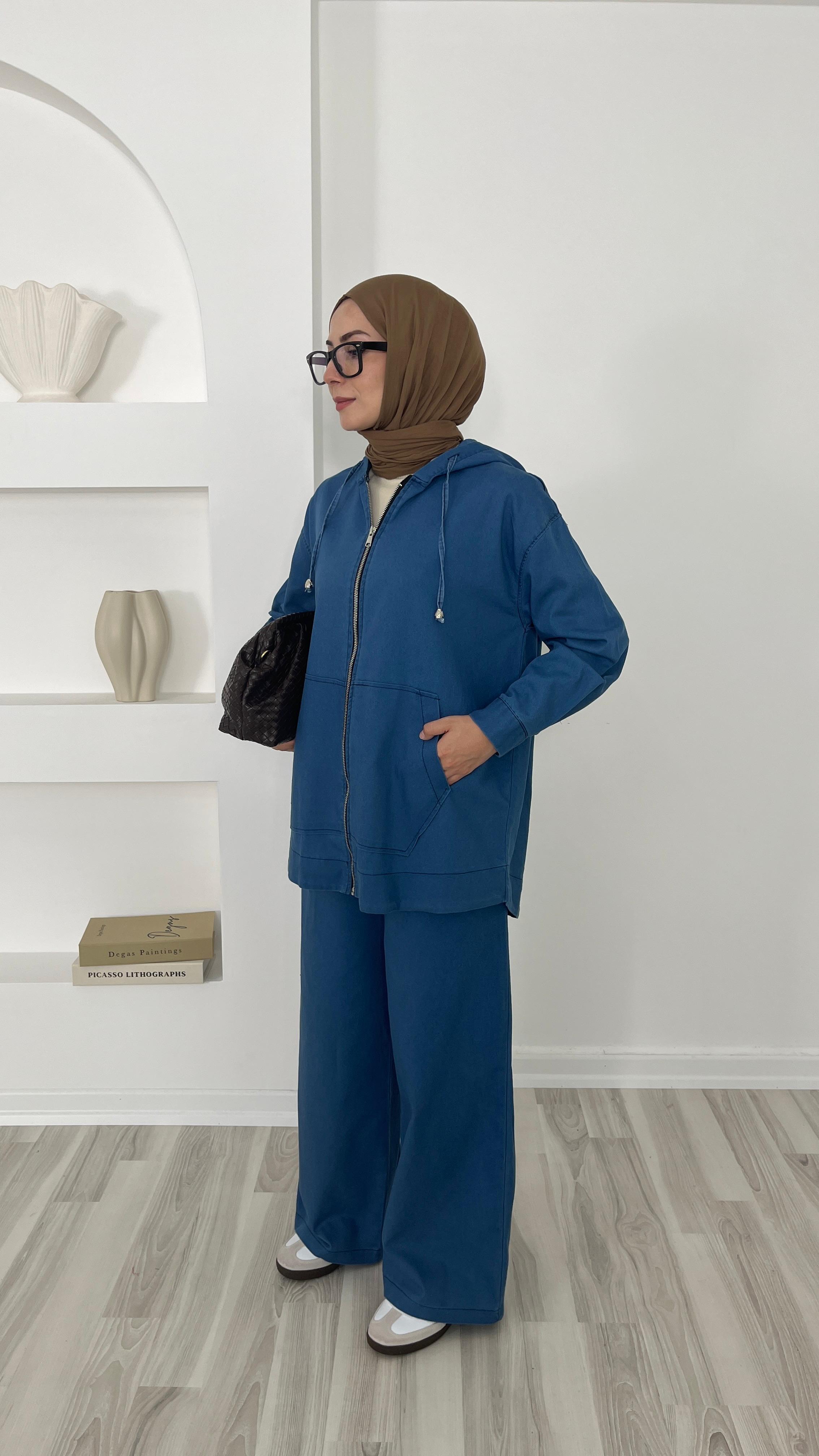 6391-ince kot kumaş kapşonlu önü cepli ceket pantolonlu takım - mavi (6391)