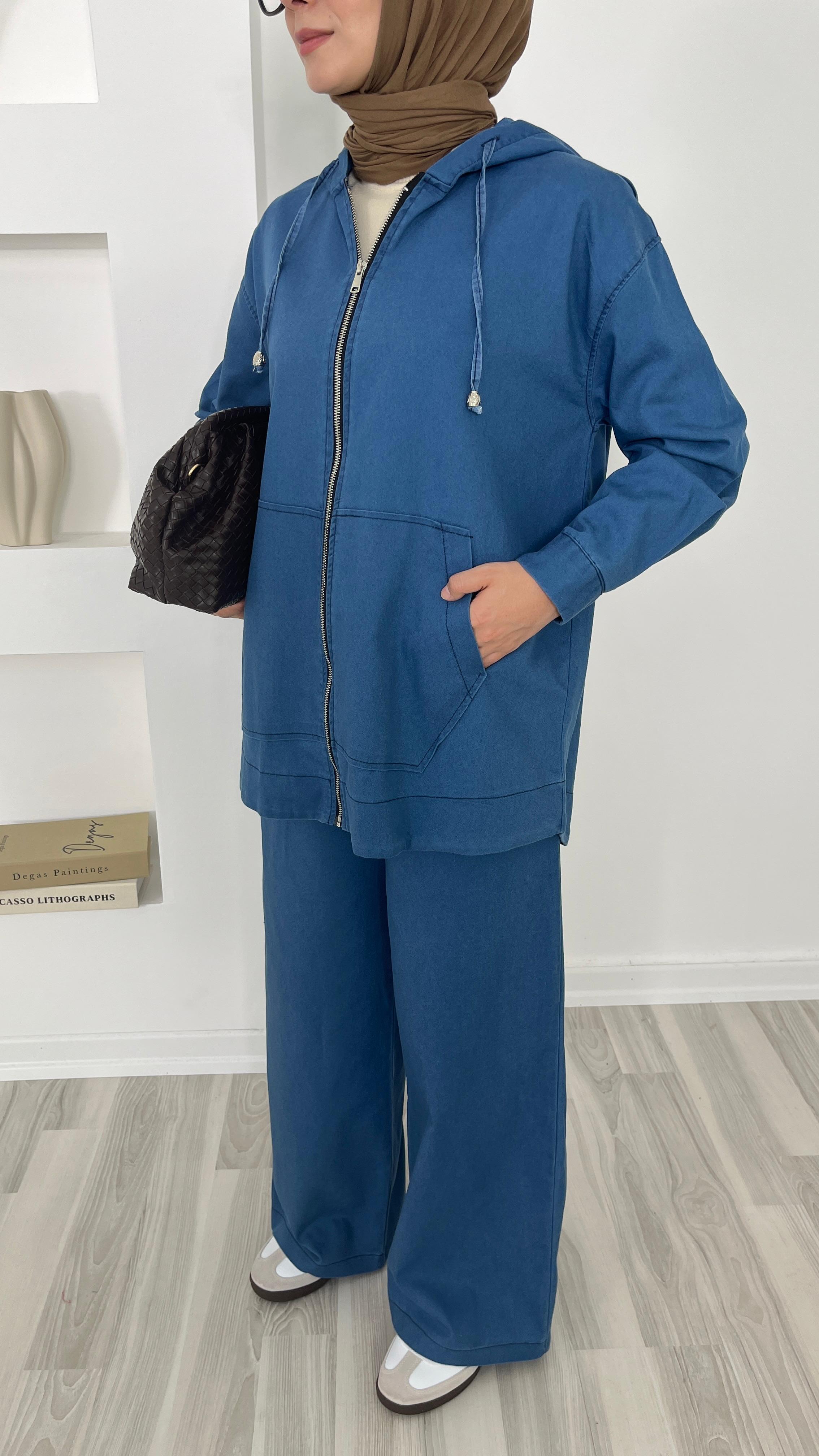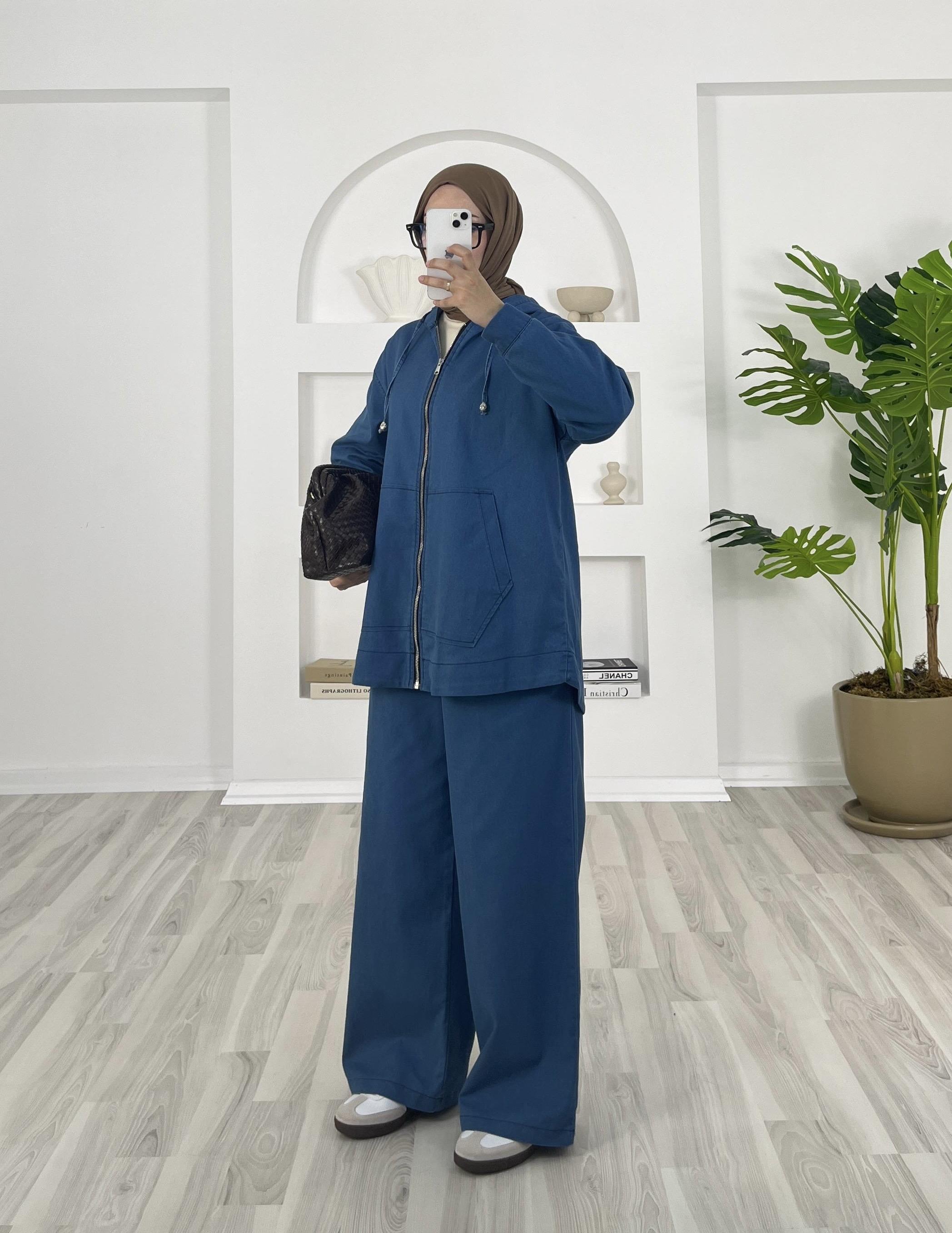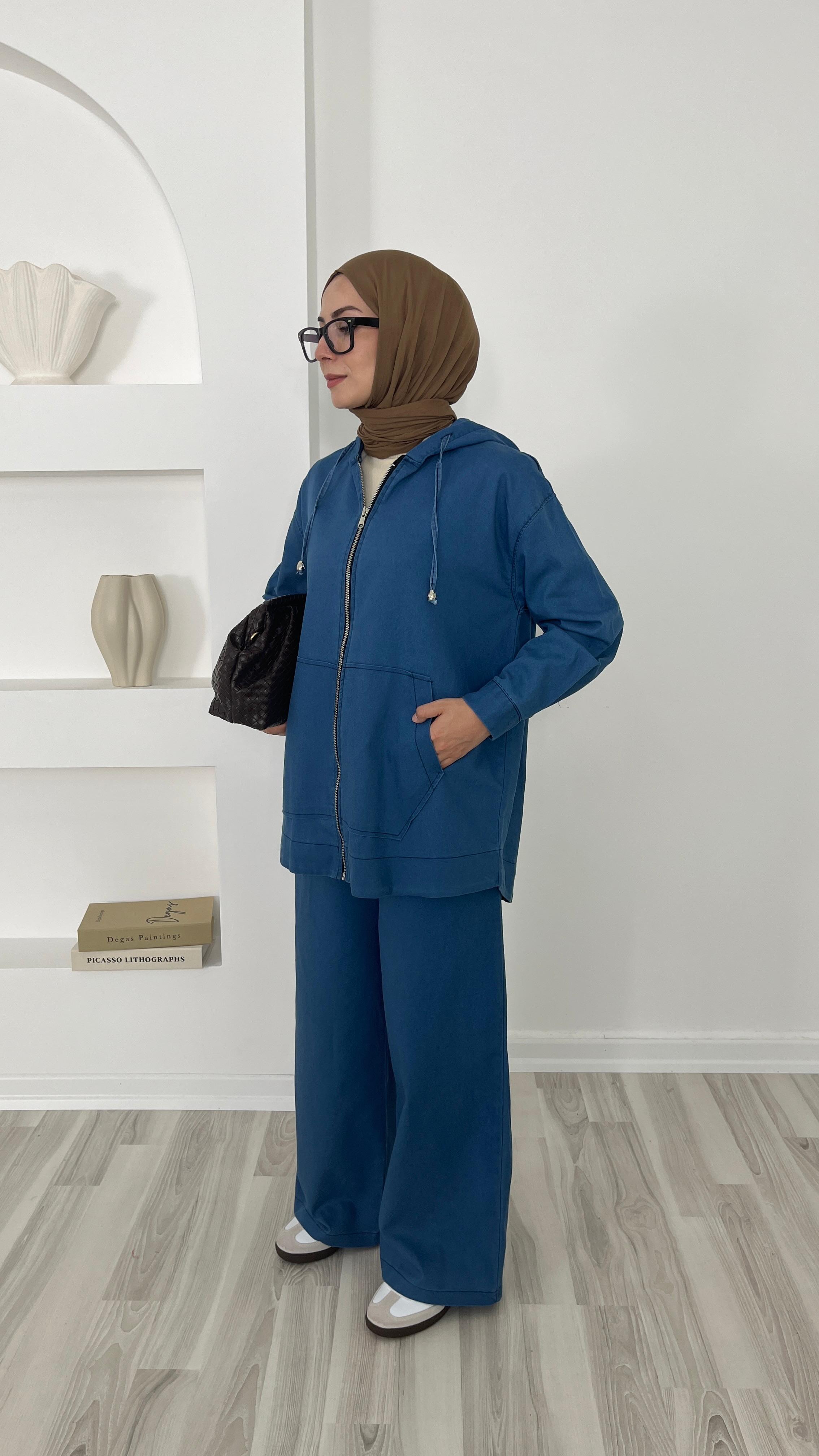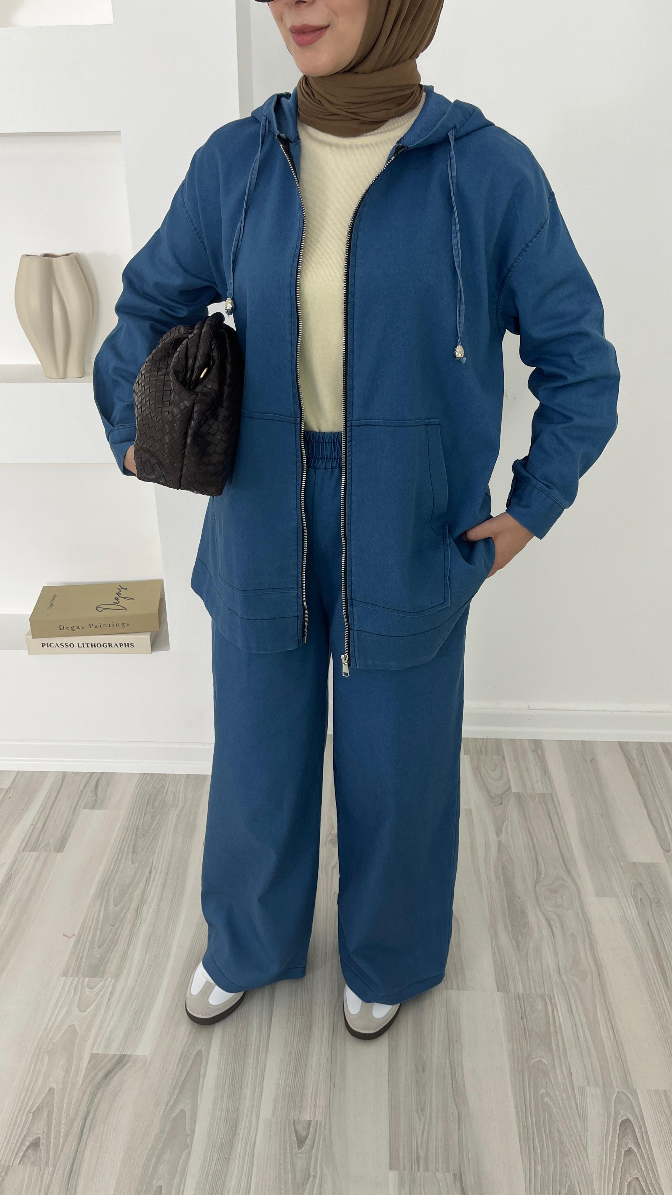 6391-ince kot kumaş kapşonlu önü cepli ceket pantolonlu takım - mavi (6391)