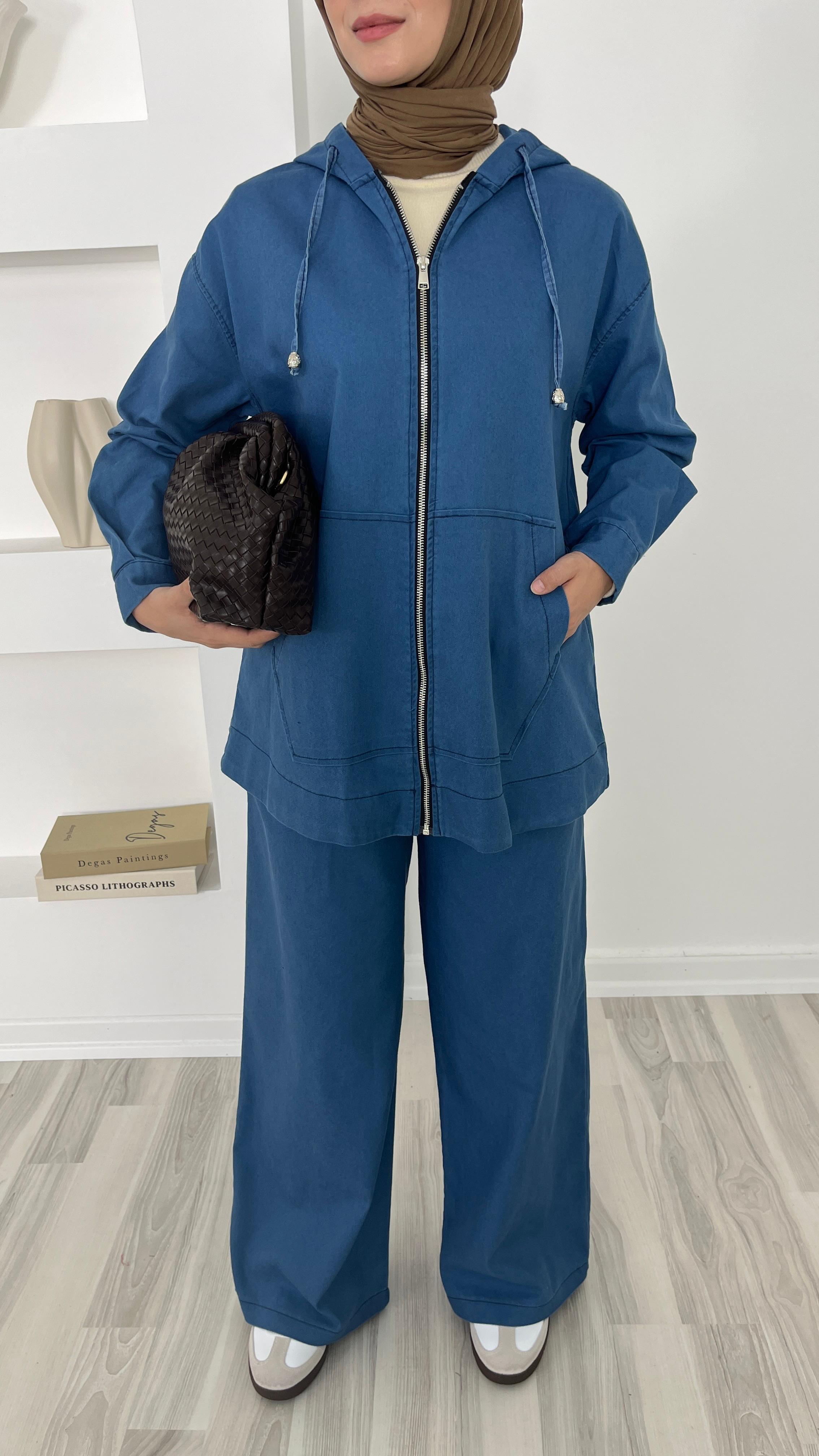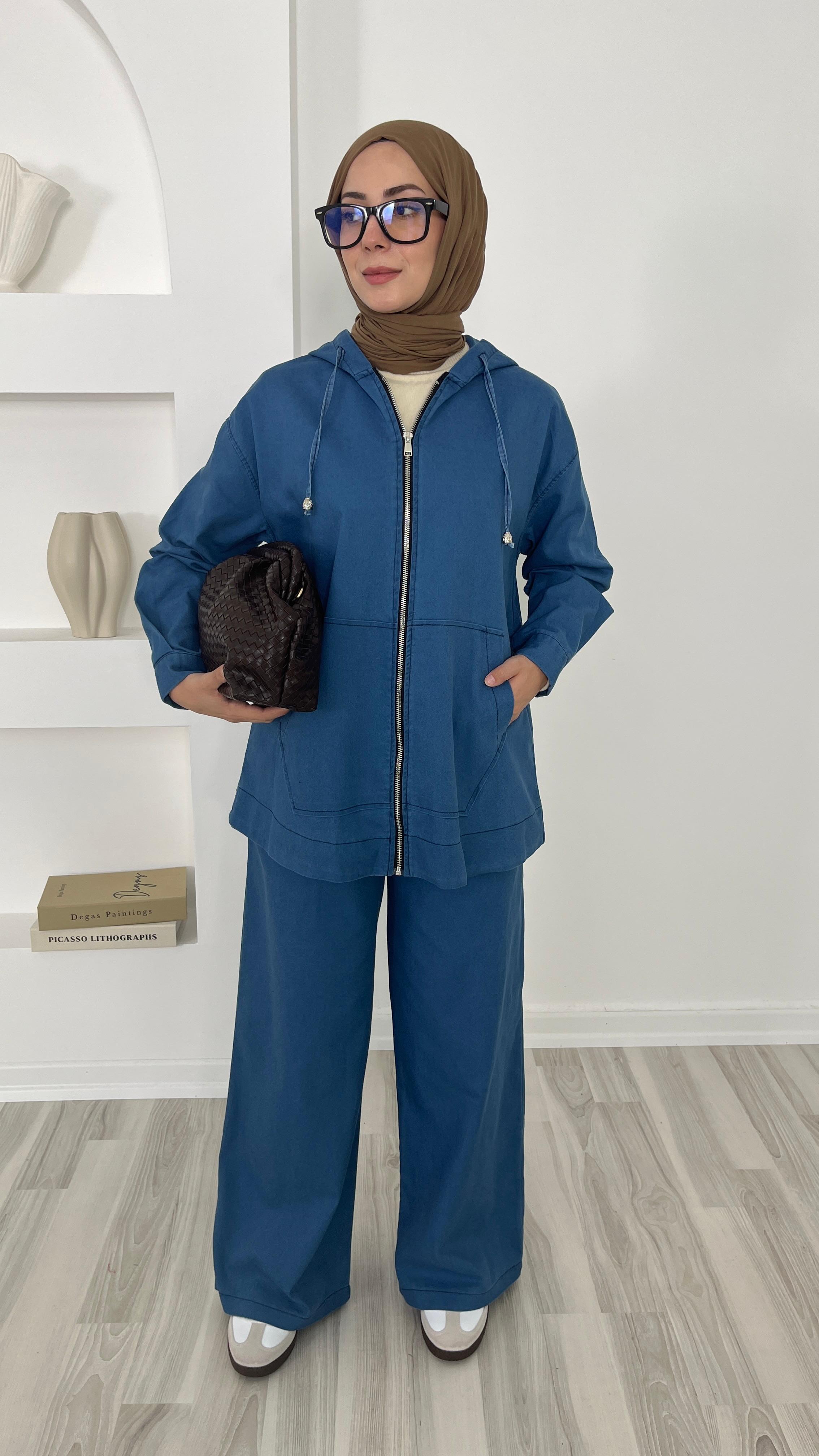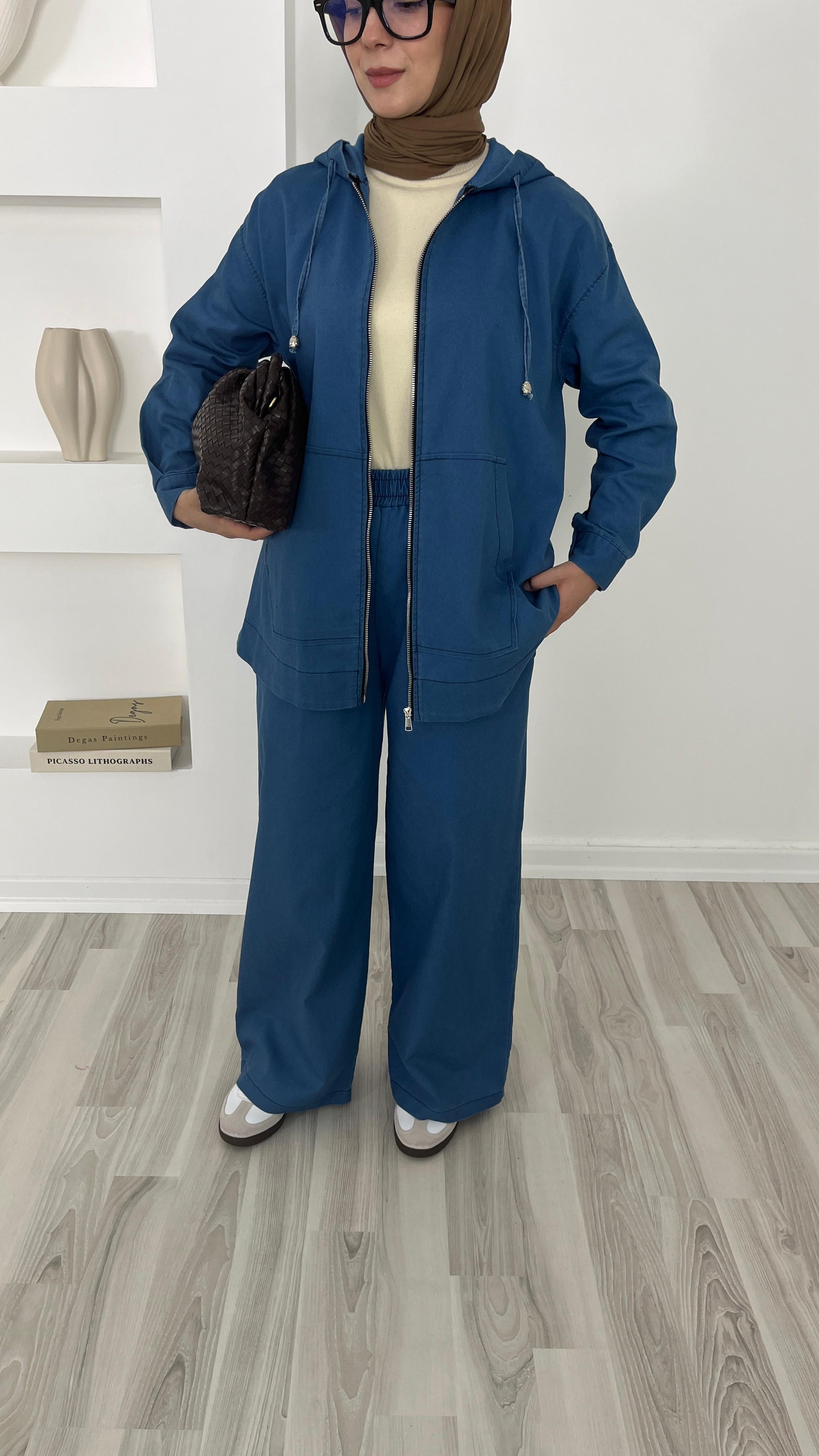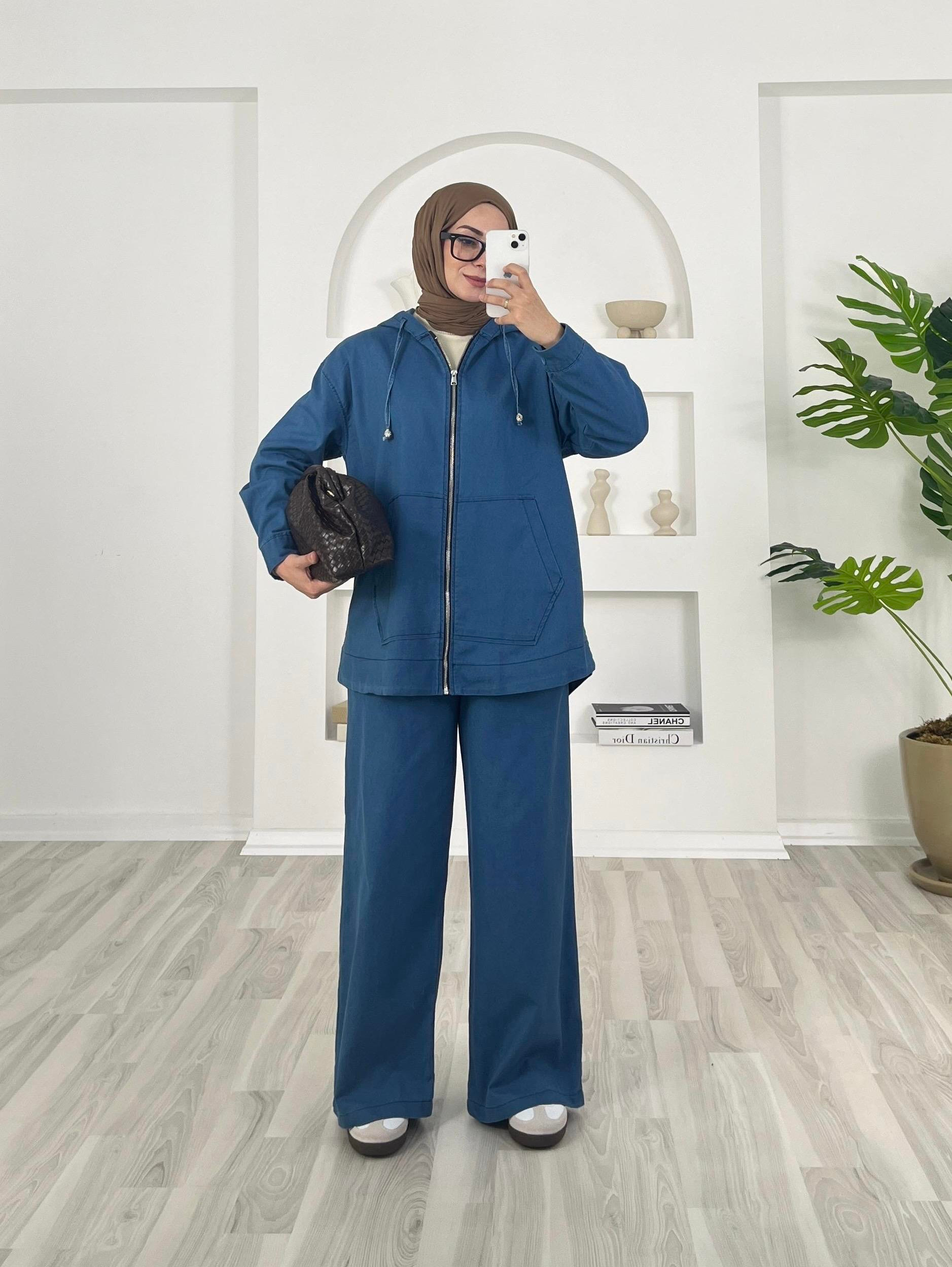 6391-ince kot kumaş kapşonlu önü cepli ceket pantolonlu takım - mavi (6391)