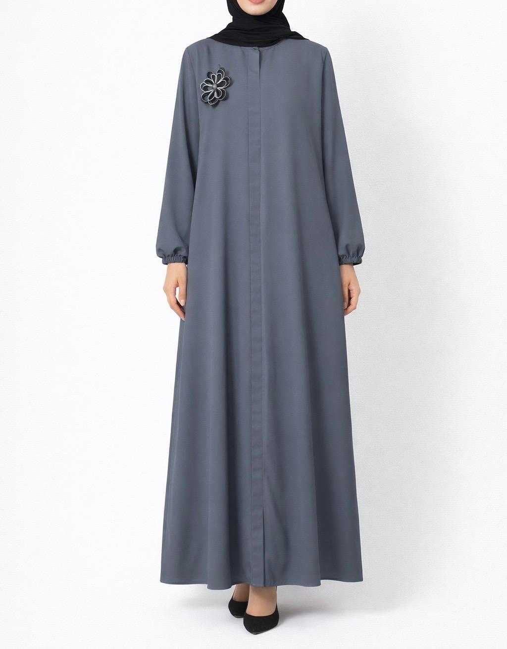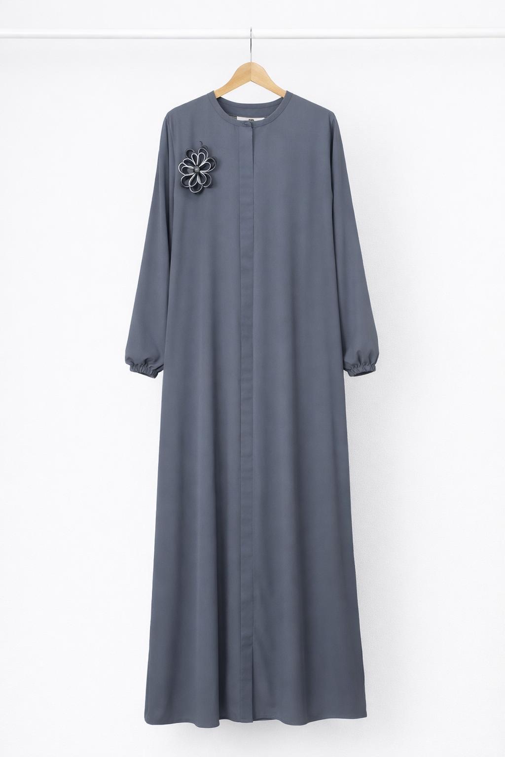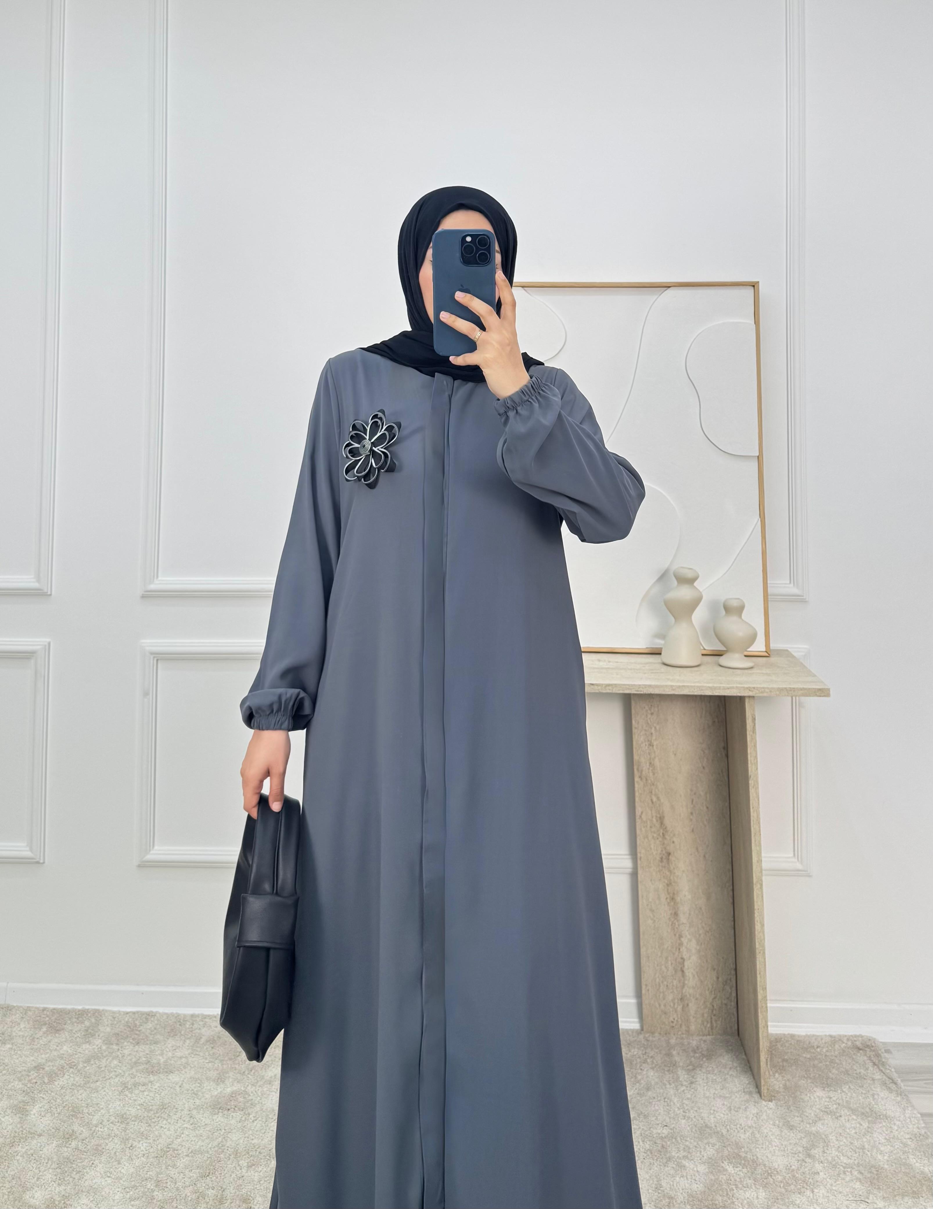 6413-medine ipeği kumaş-boydan gizli fermuarlı çiçek broş detaylı ferace-füme (6413)