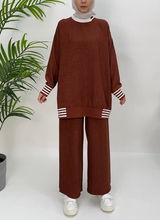 6524-melanj keten kumaş-reglan kol detaylı pantolonlu takım-acı kahve (6524)