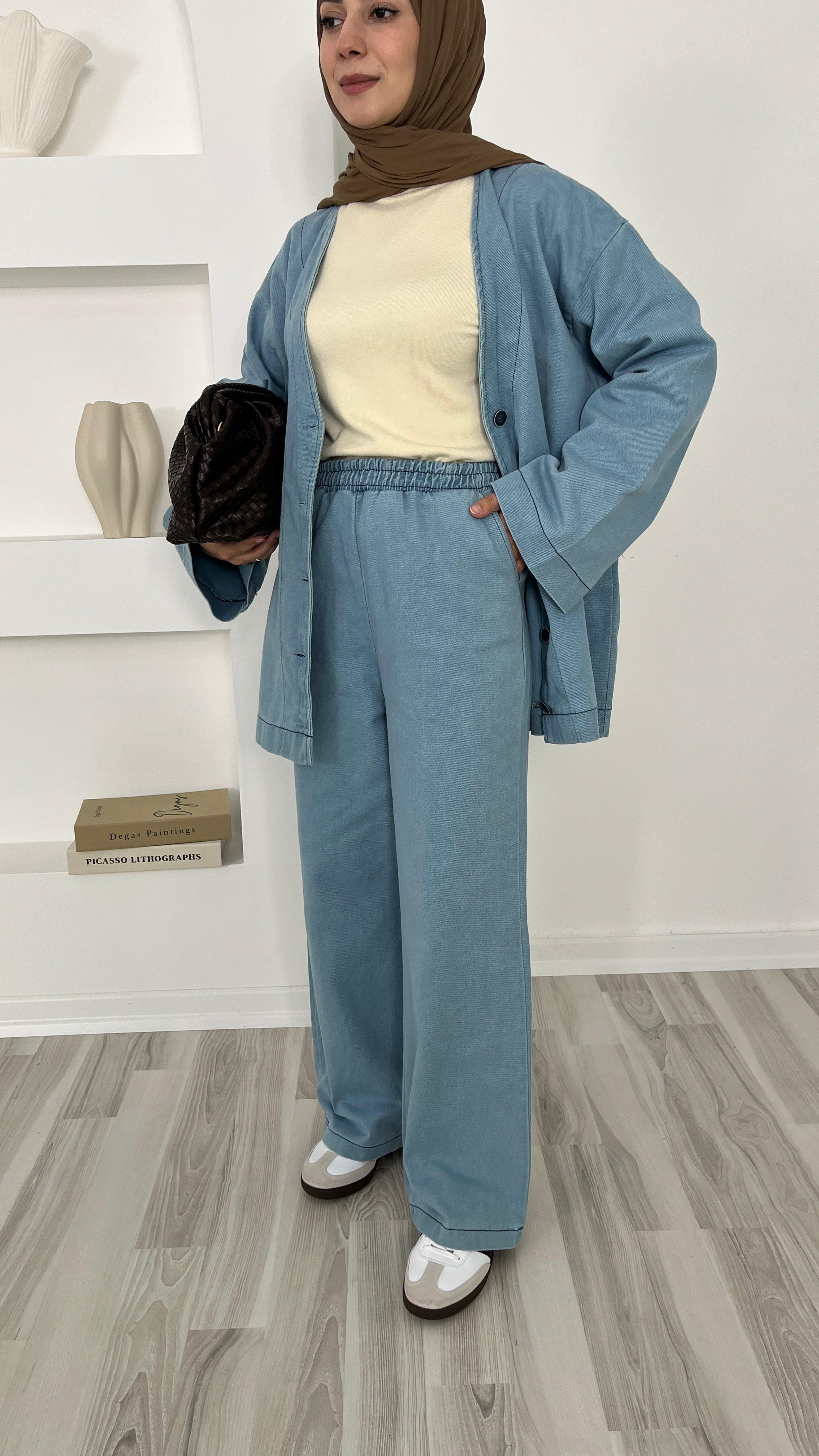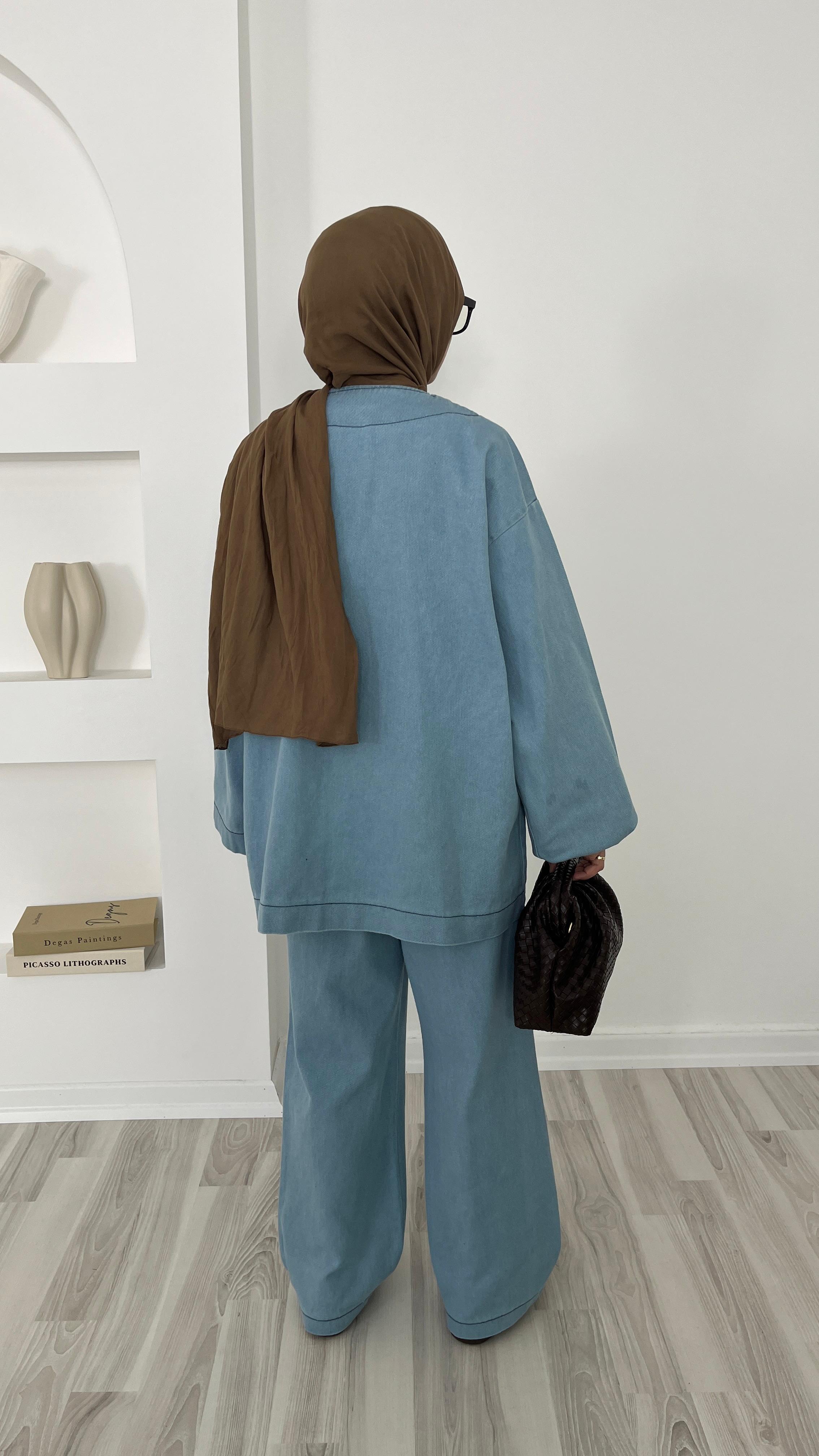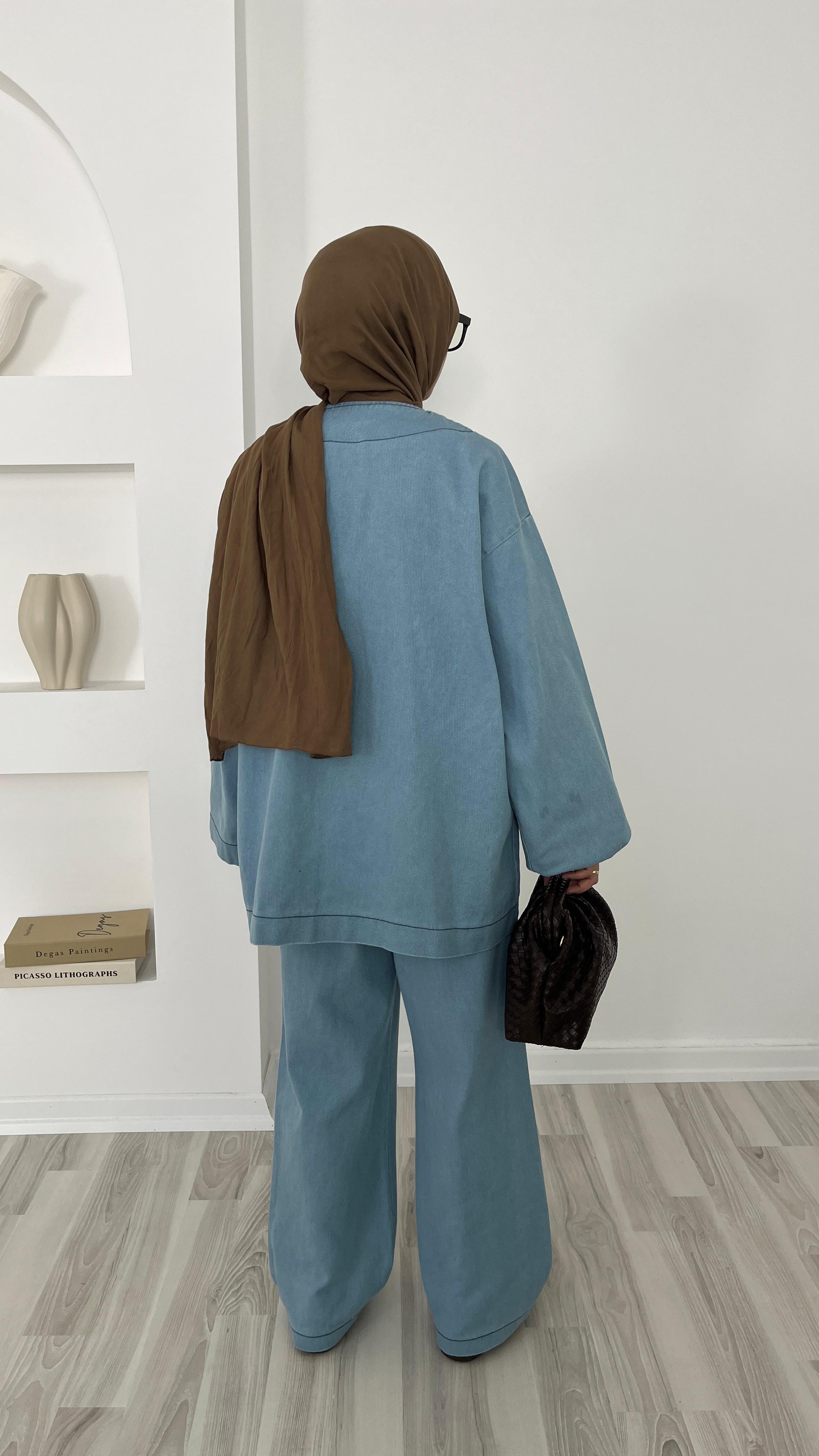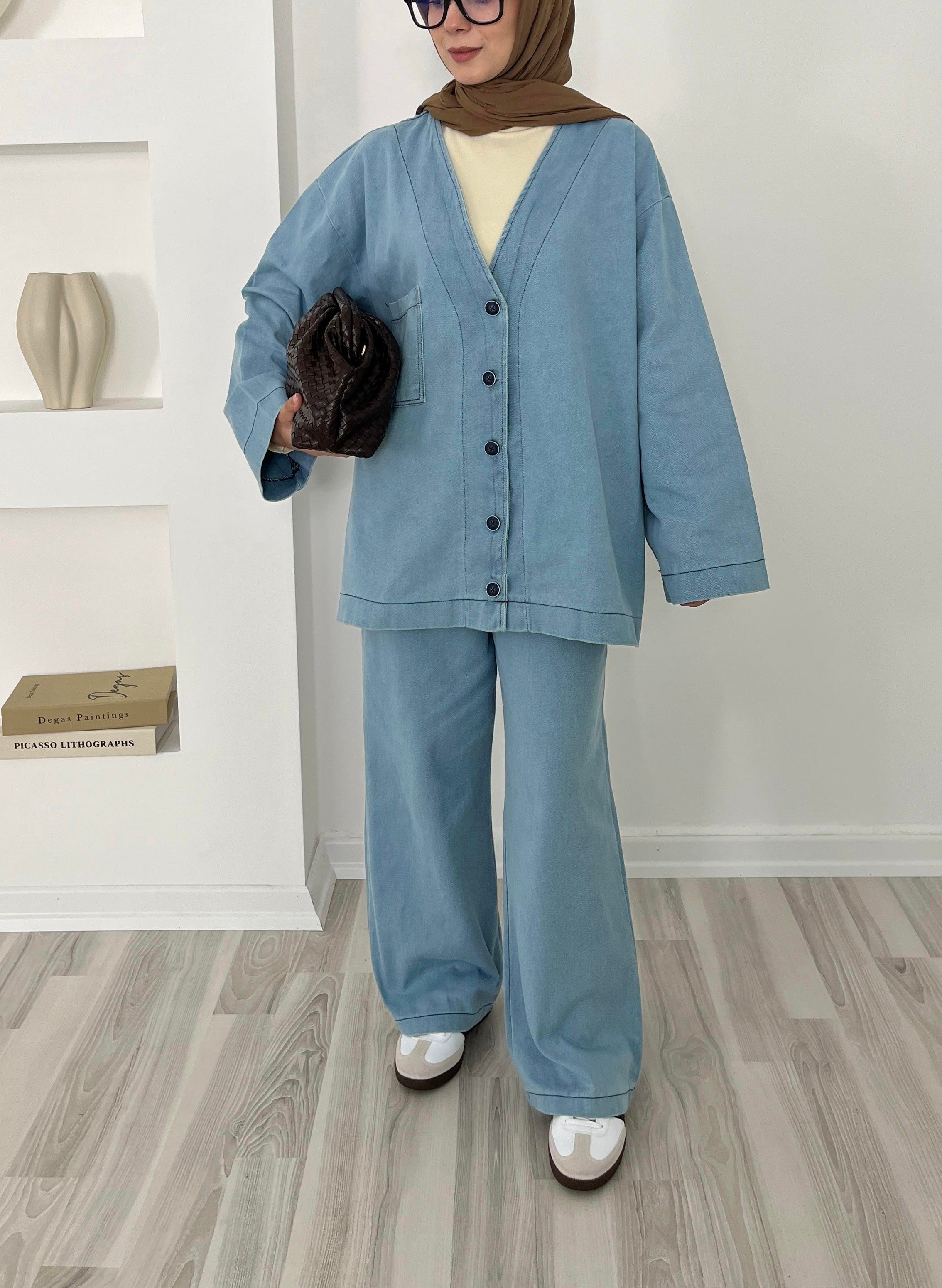 6622 - kot kumaş önü dügmeli ceketli pantolon takım - bebe mavisi (6622)