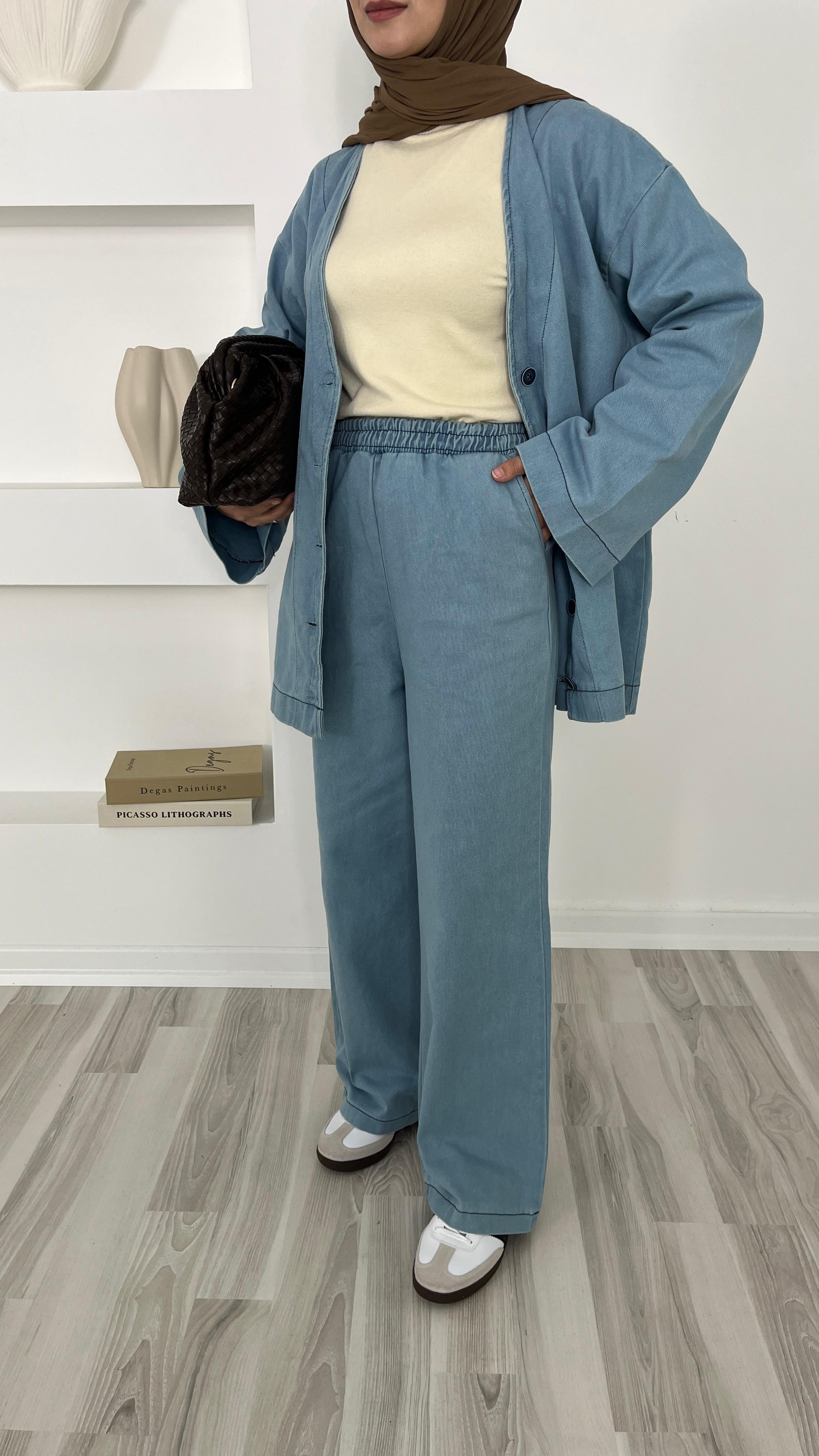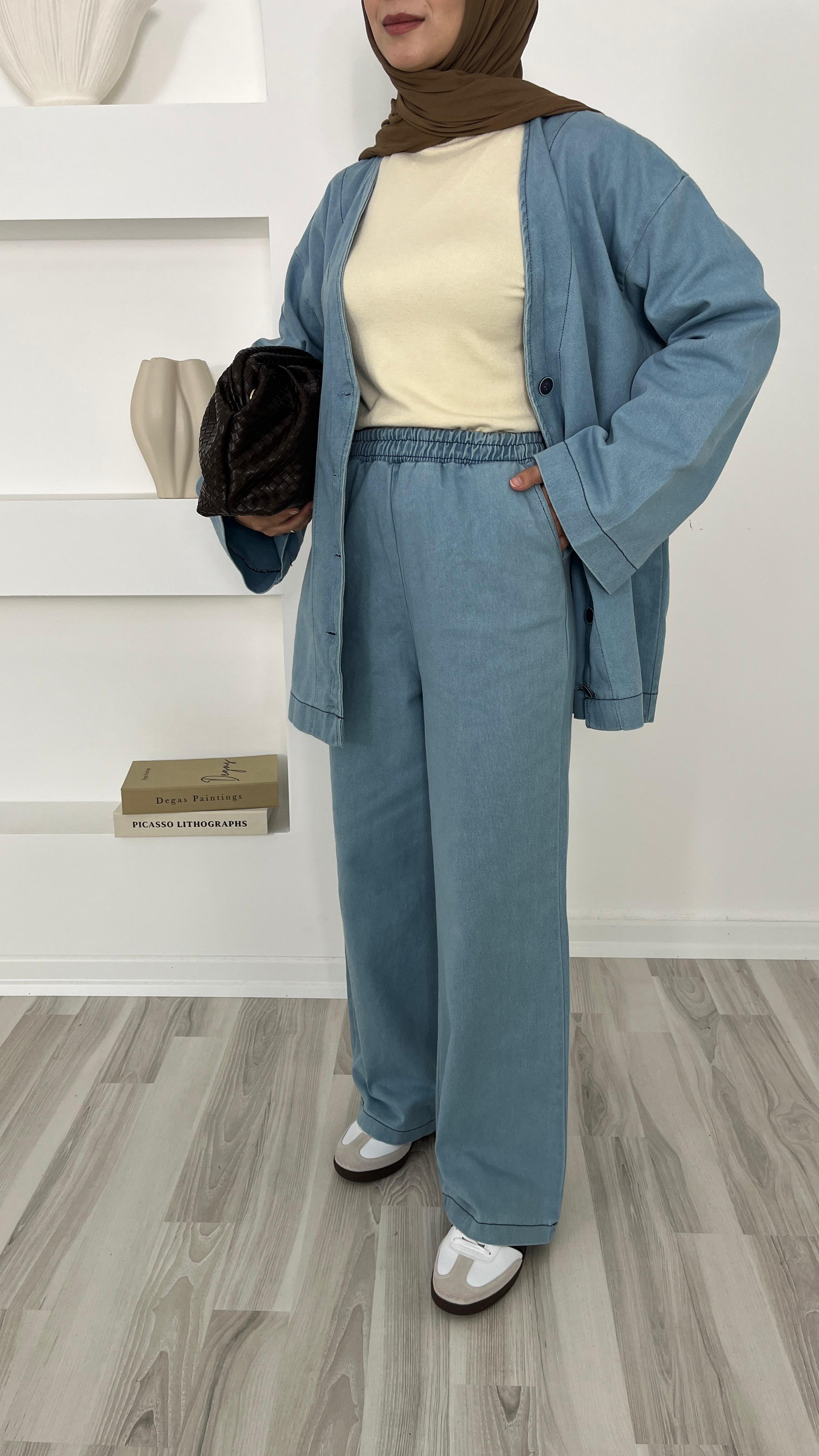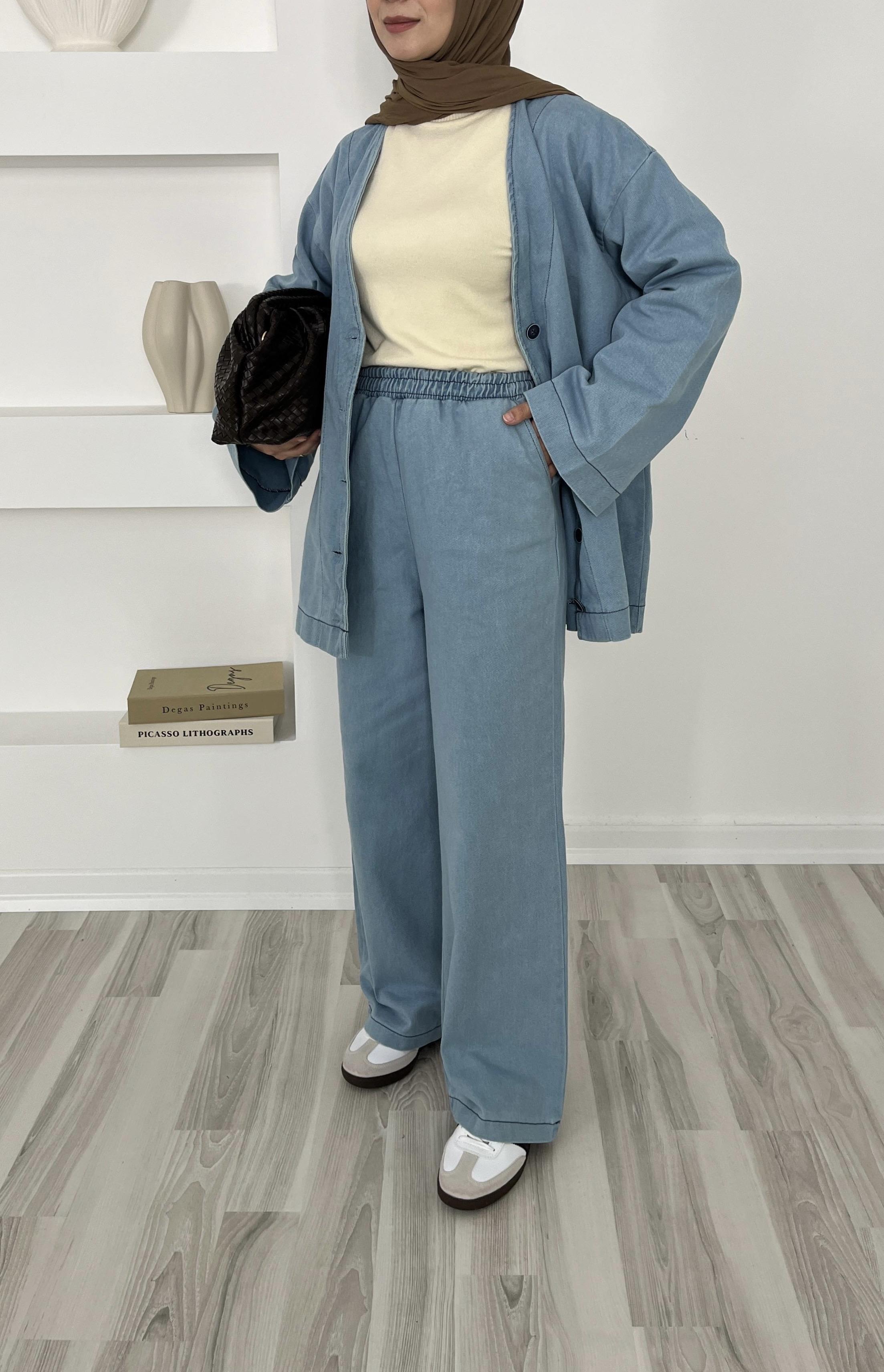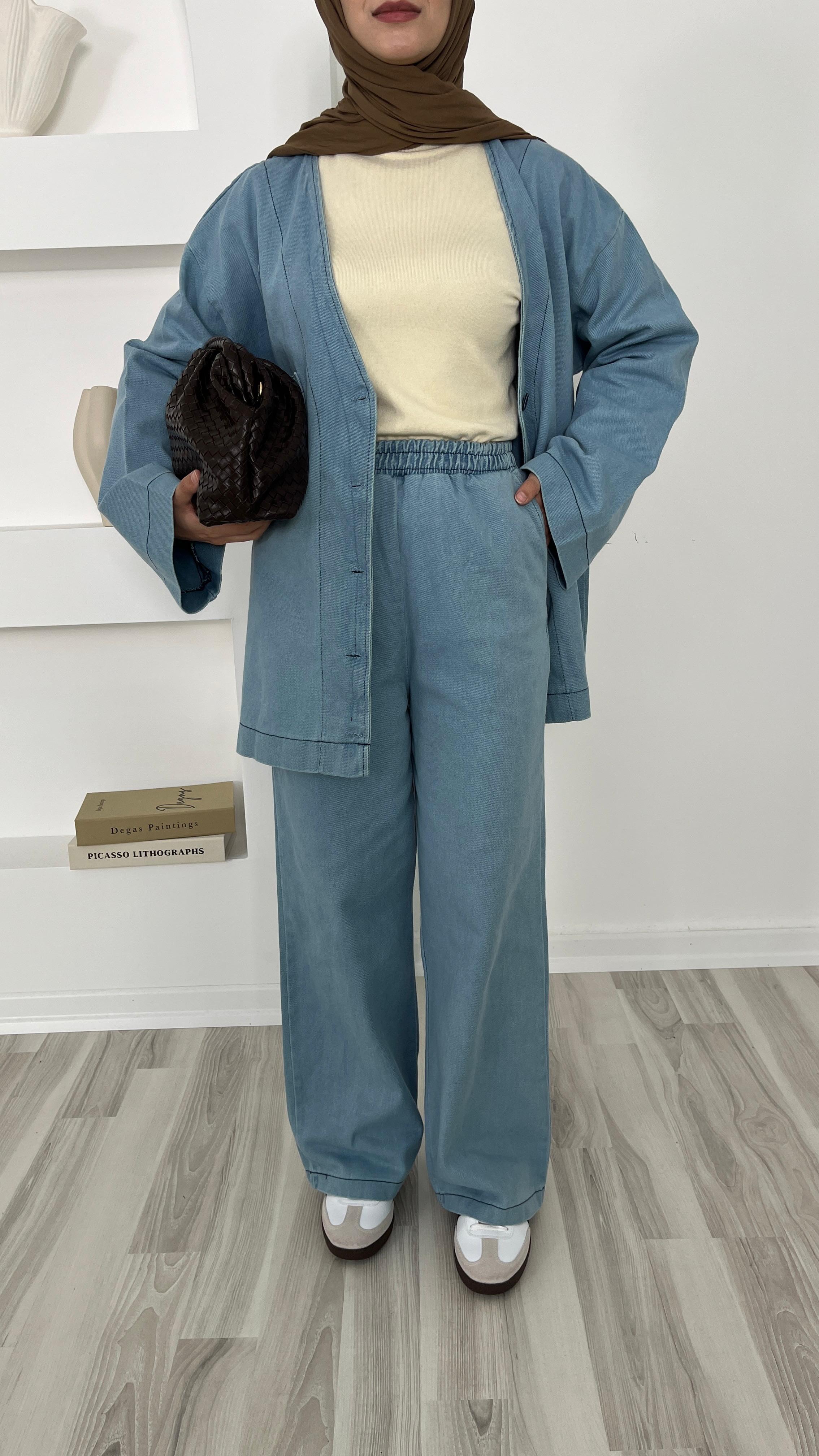 6622 - kot kumaş önü dügmeli ceketli pantolon takım - bebe mavisi (6622)