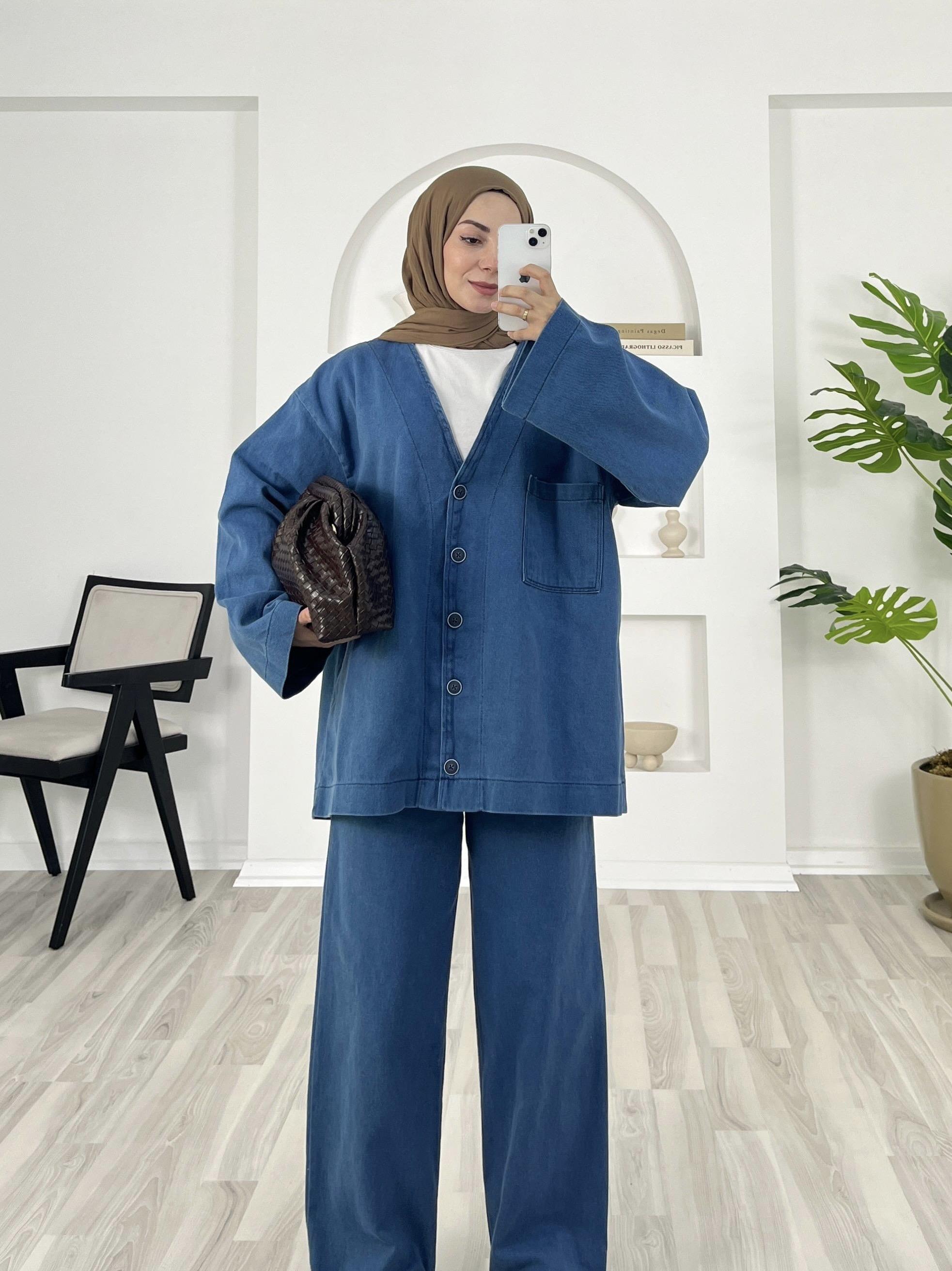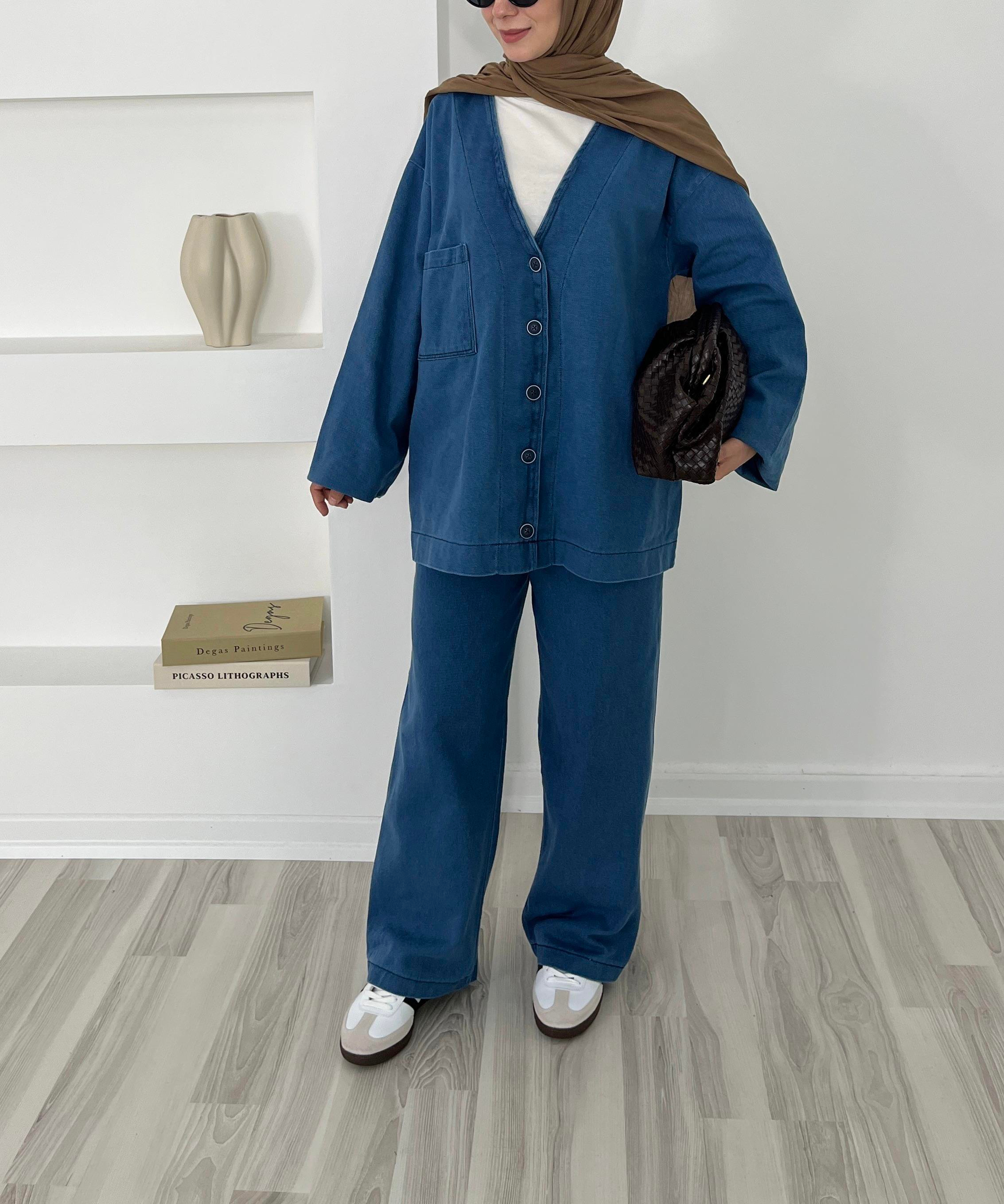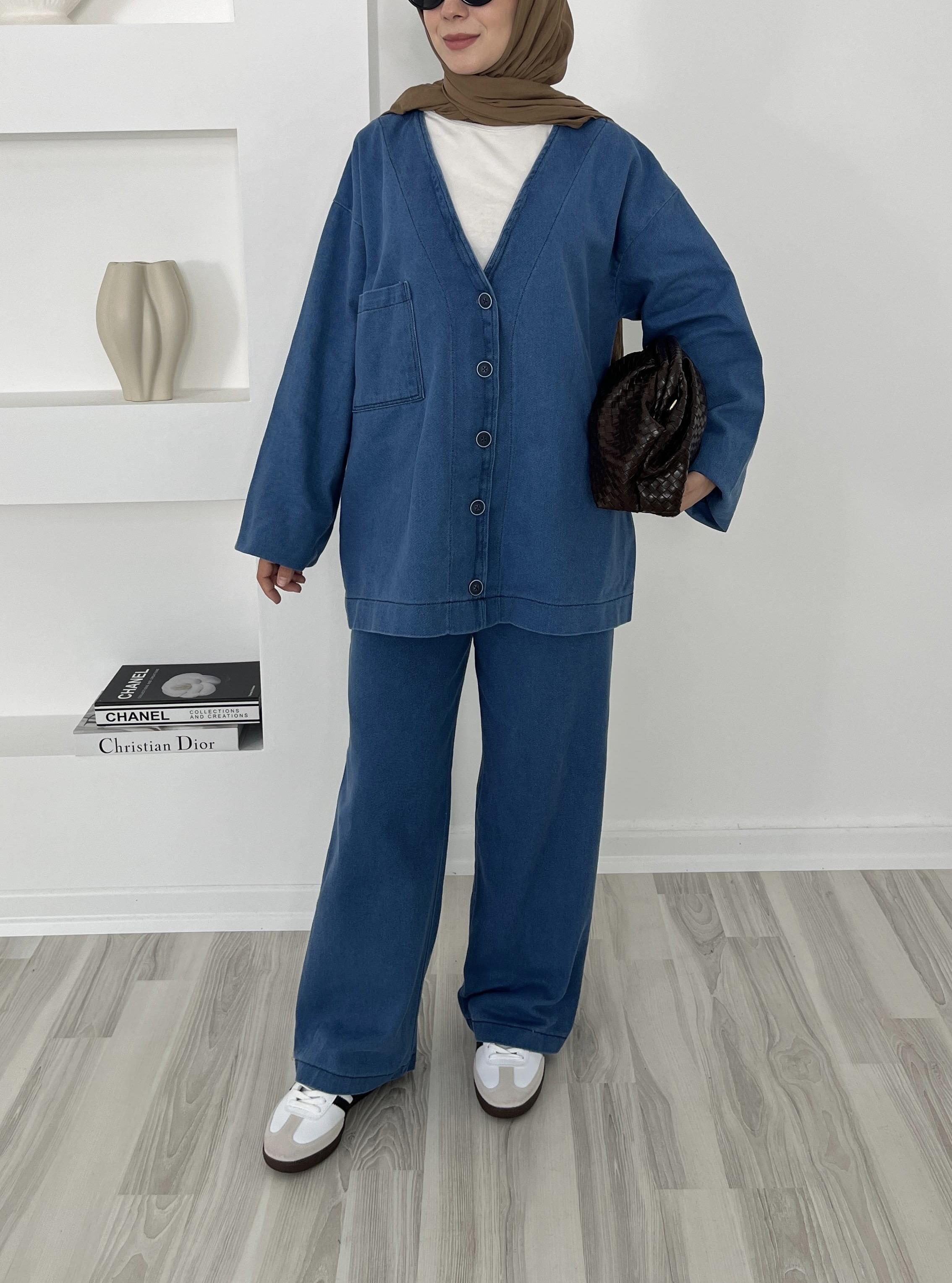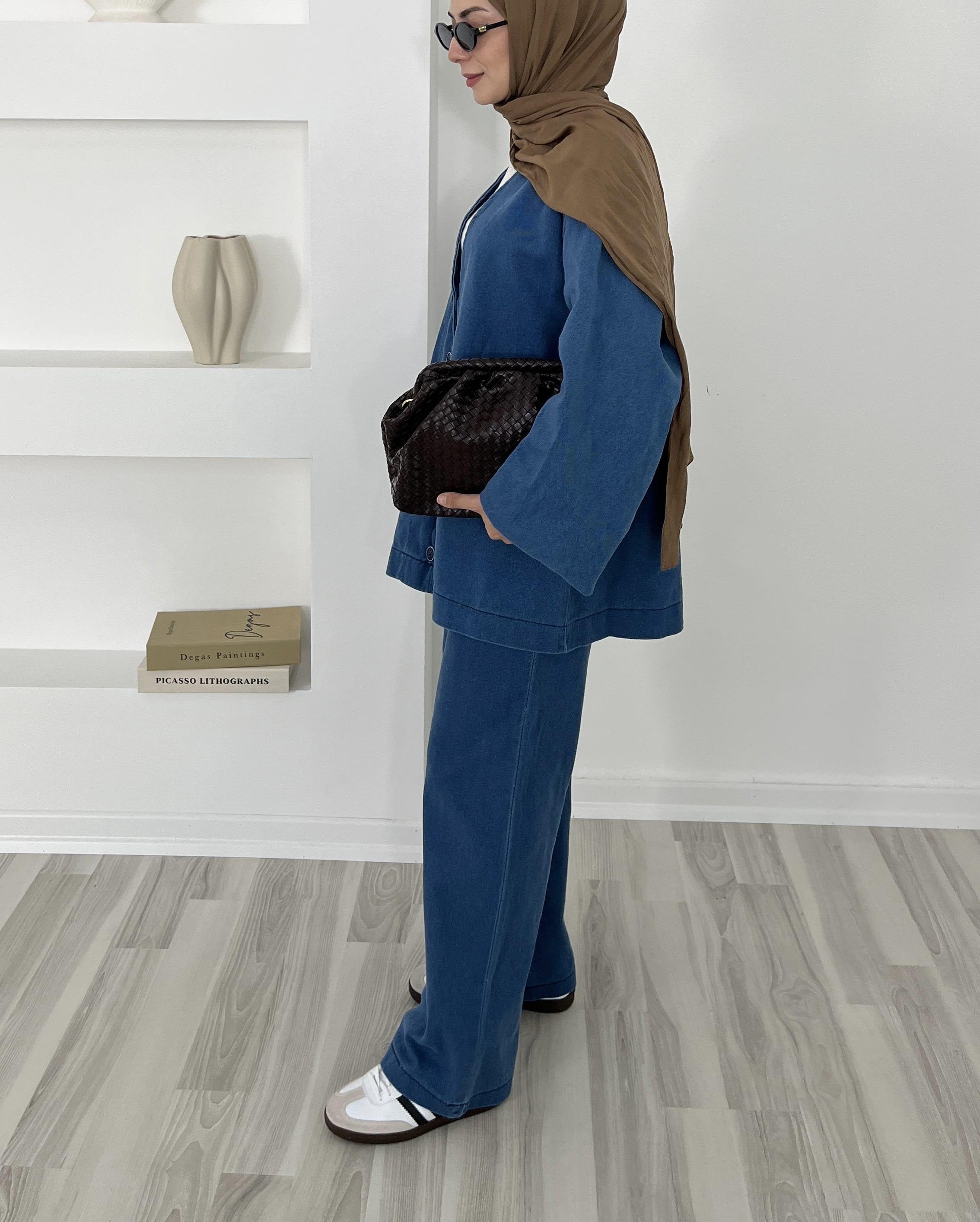 6622 - kot kumaş önü dügmeli ceketli pantolon takım - mavi (6622)