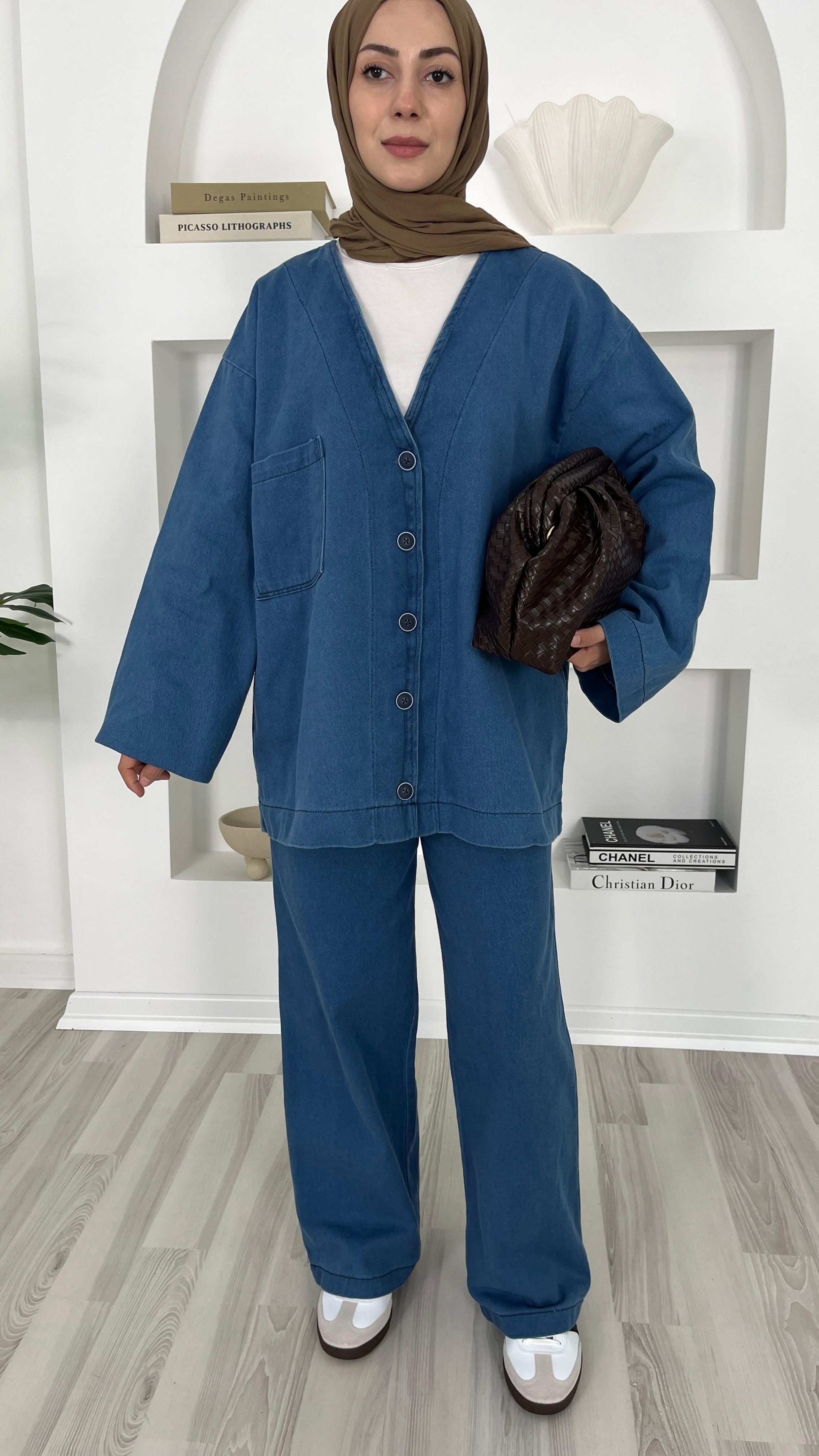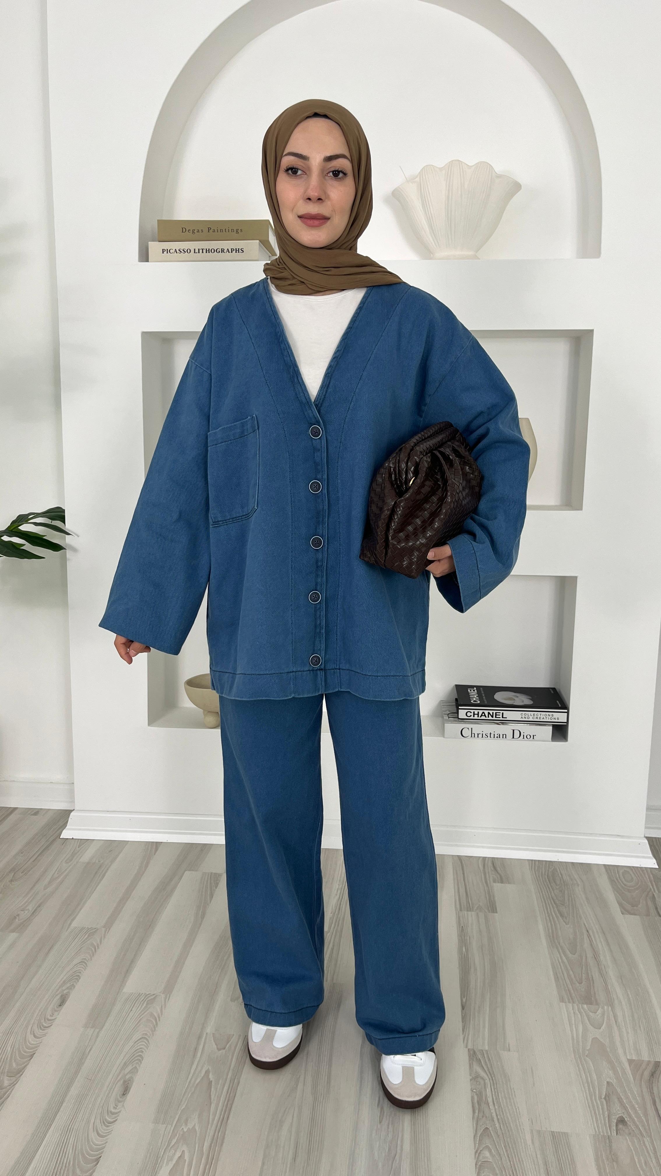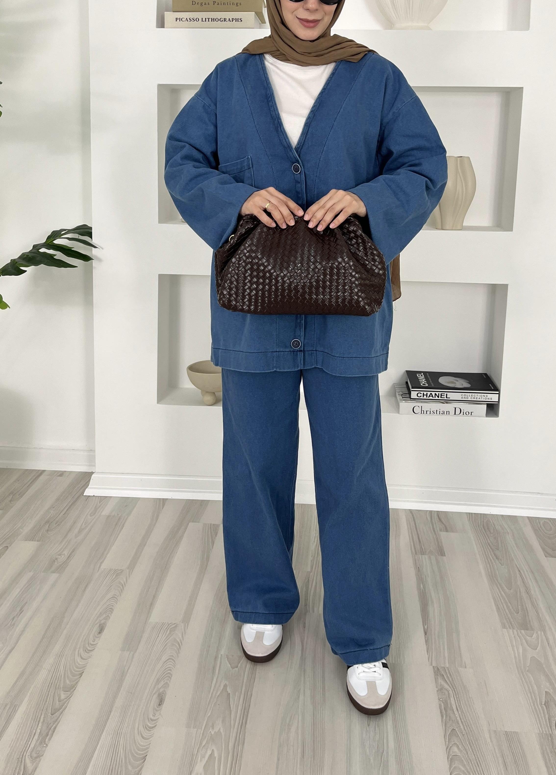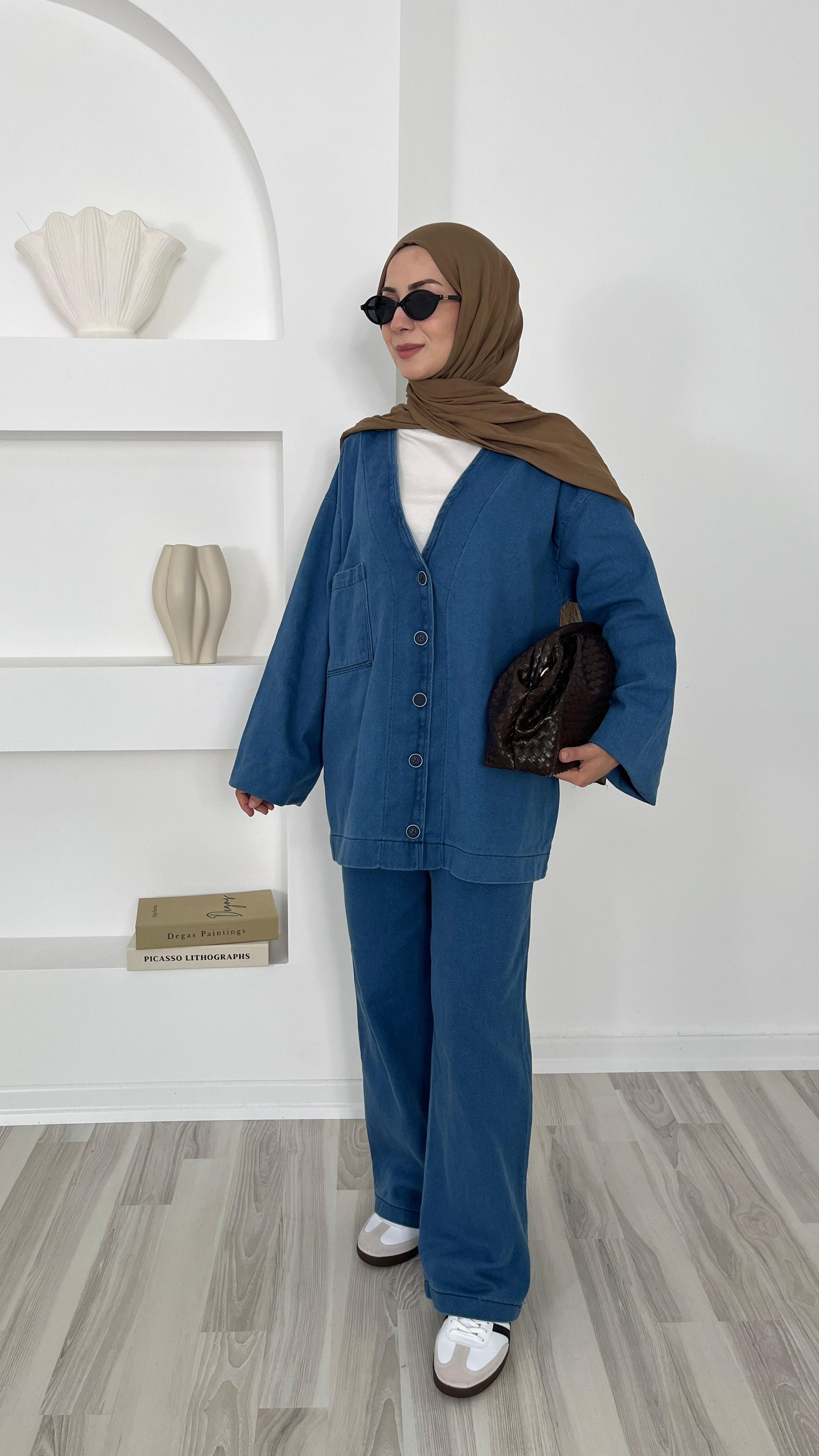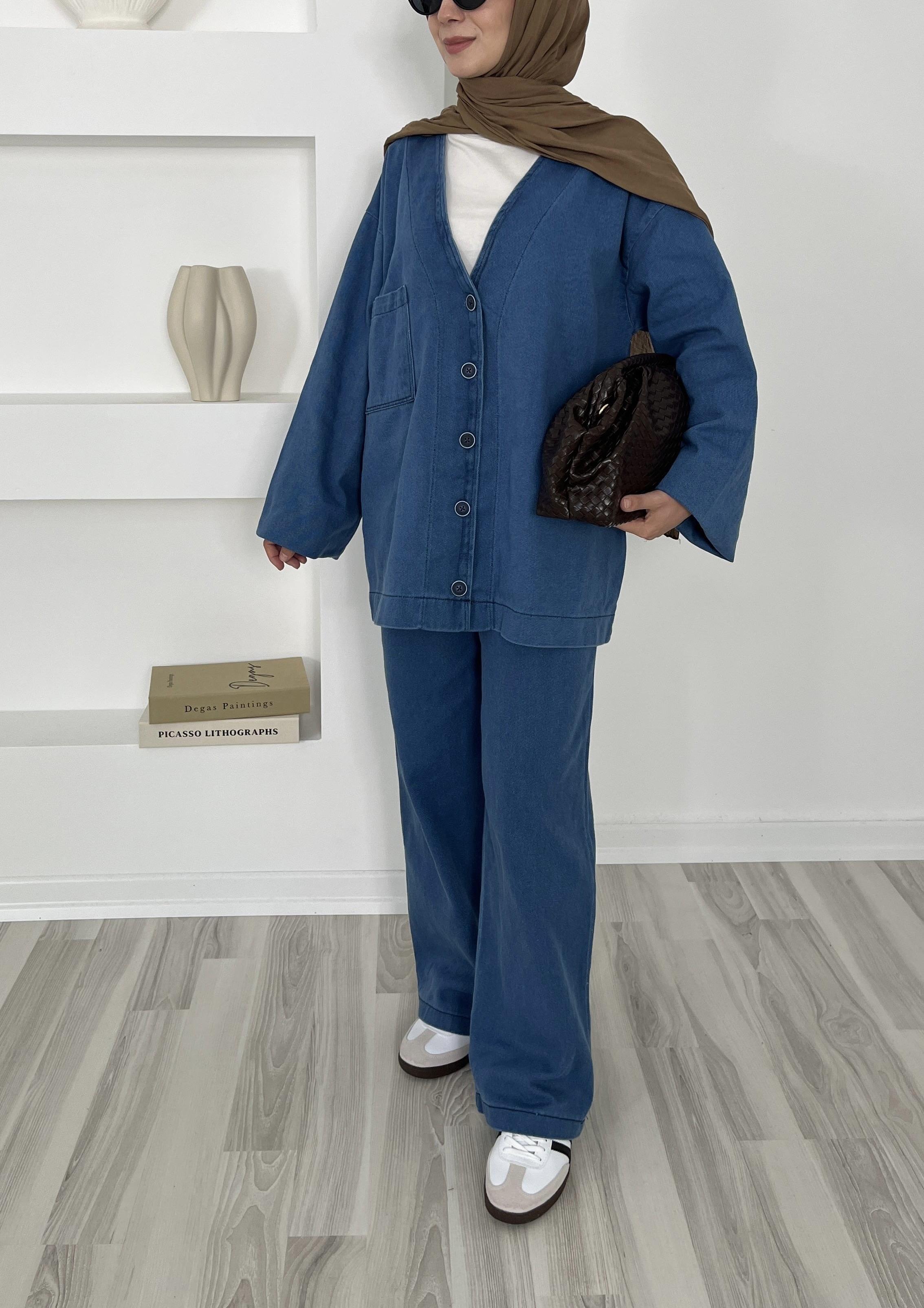 6622 - kot kumaş önü dügmeli ceketli pantolon takım - mavi (6622)