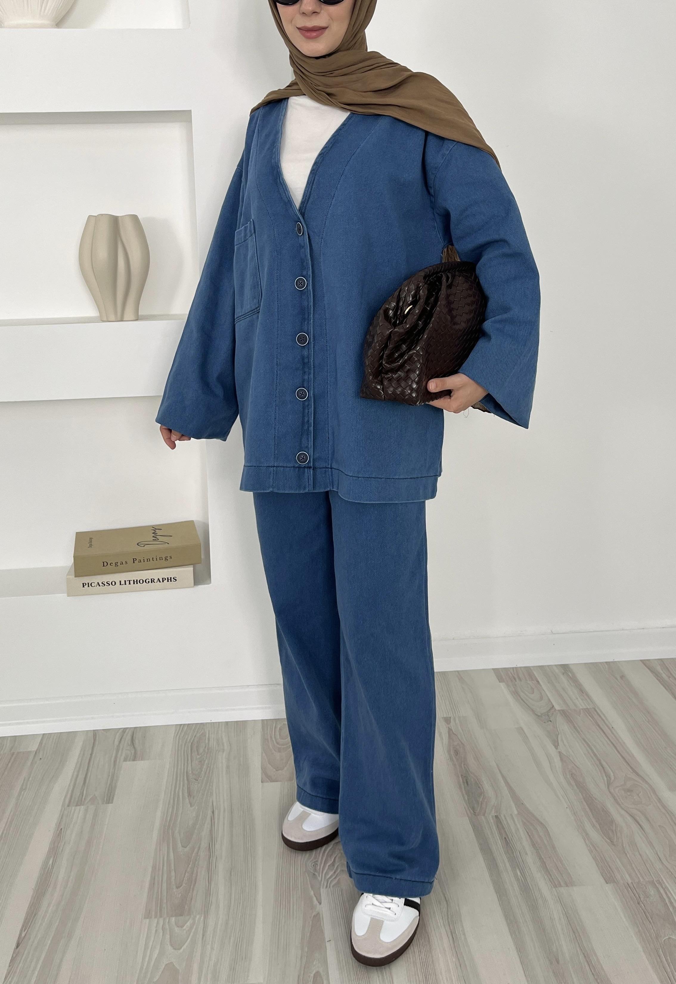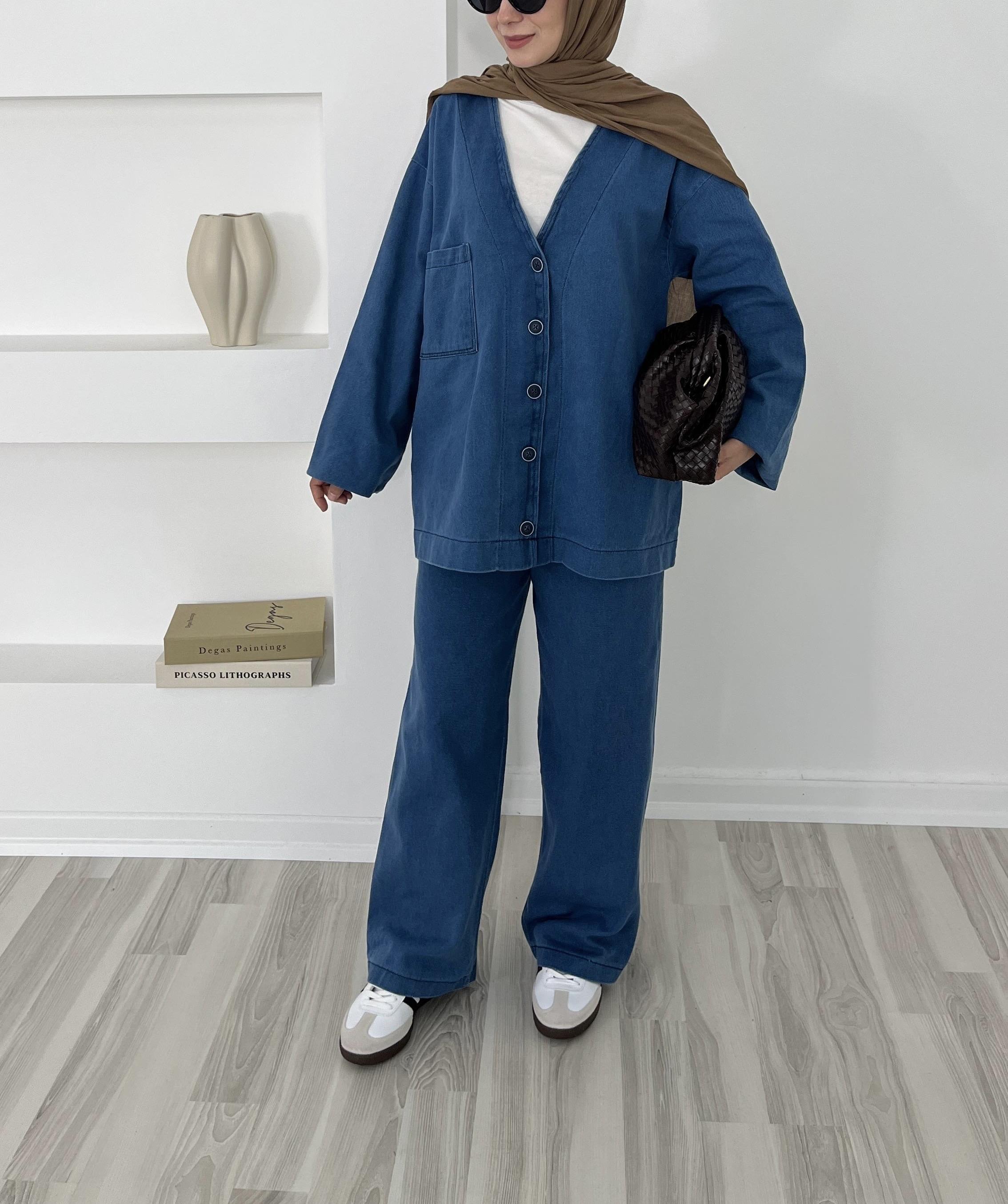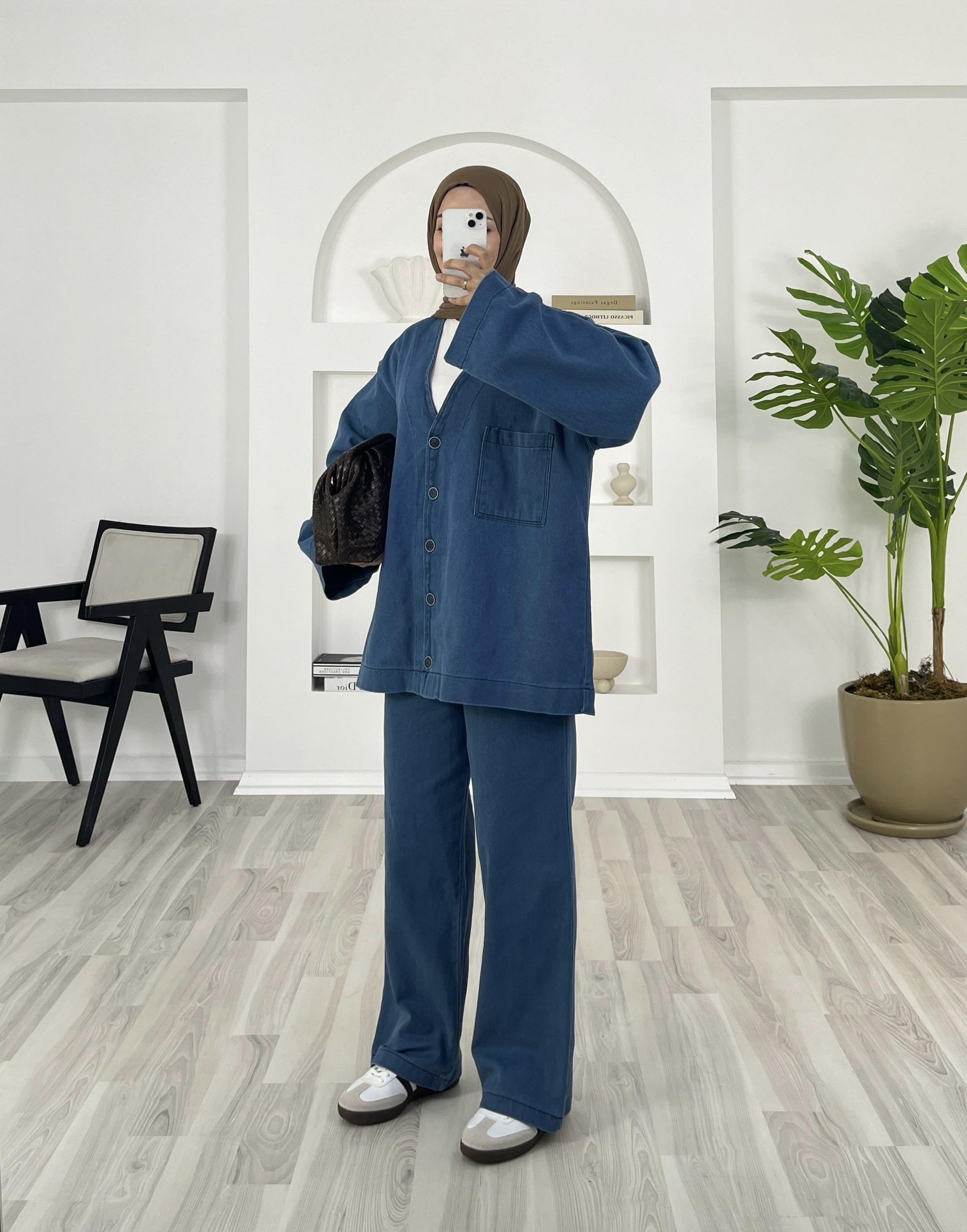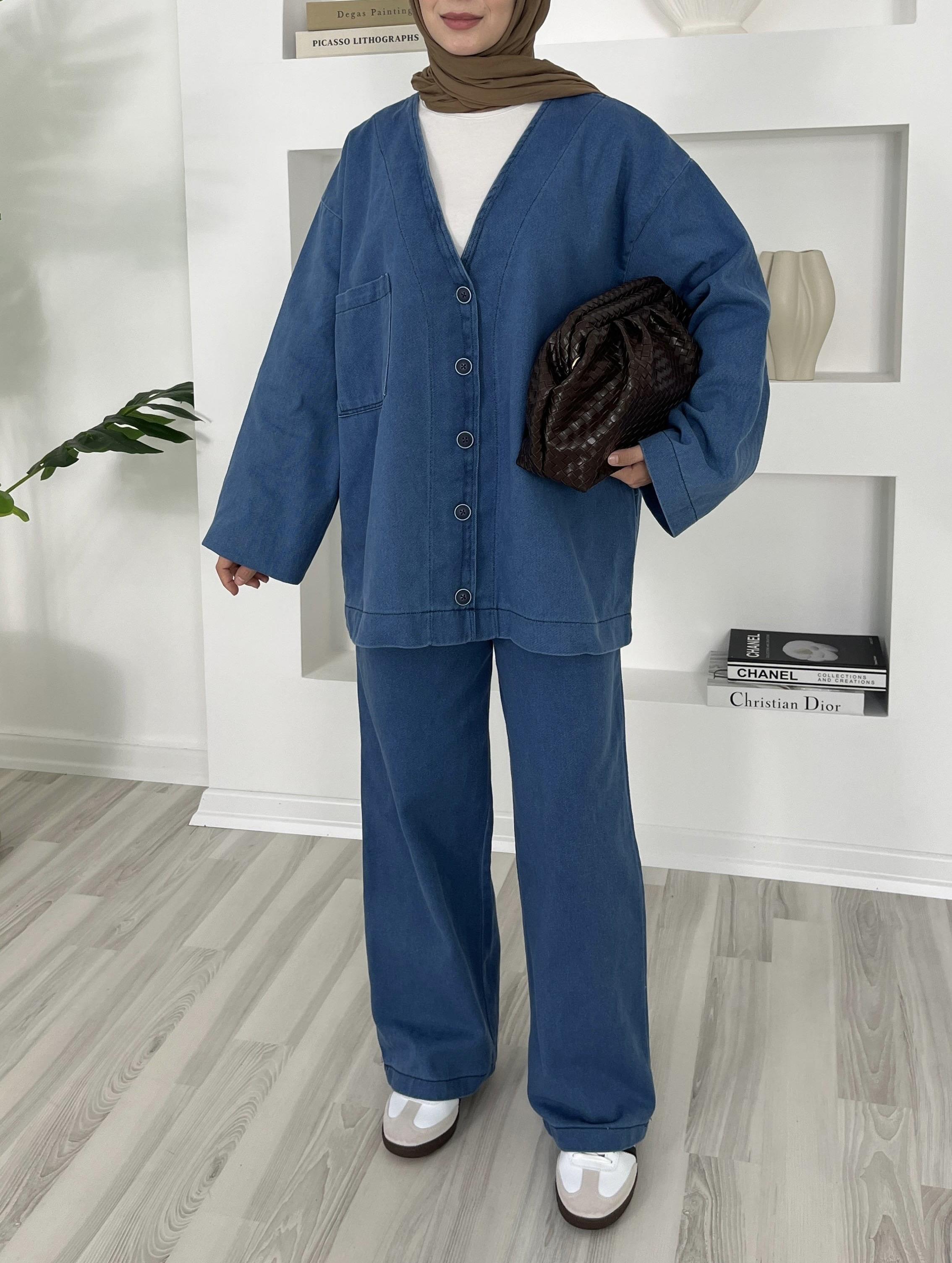 6622 - kot kumaş önü dügmeli ceketli pantolon takım - mavi (6622)