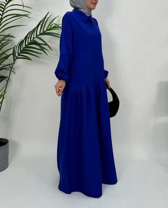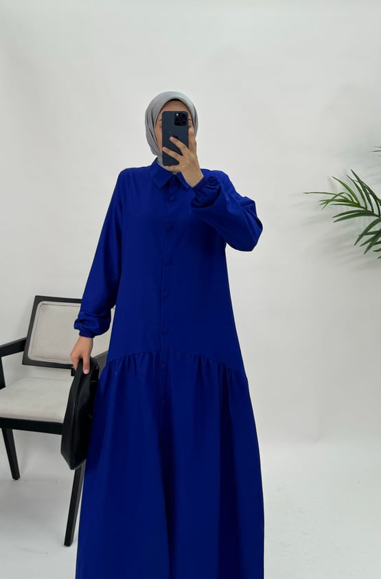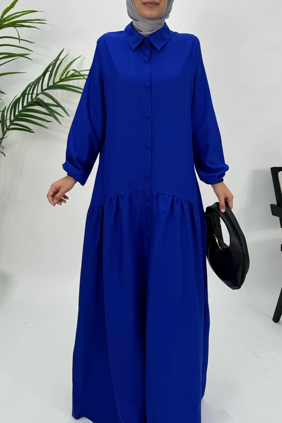 6641-poplin kumaş boydan düğmeli elbise saks mavi (6641)