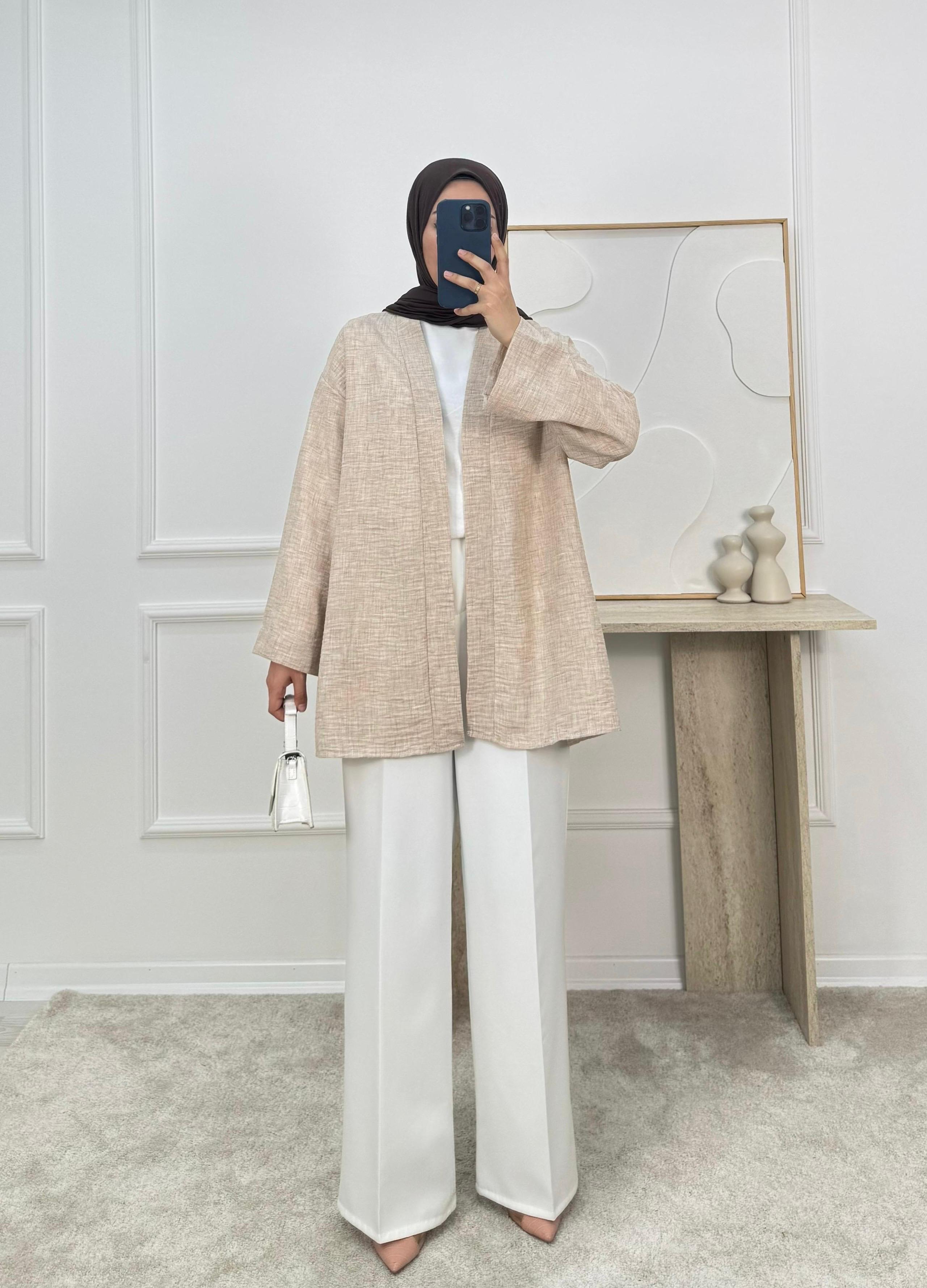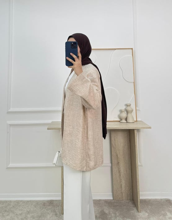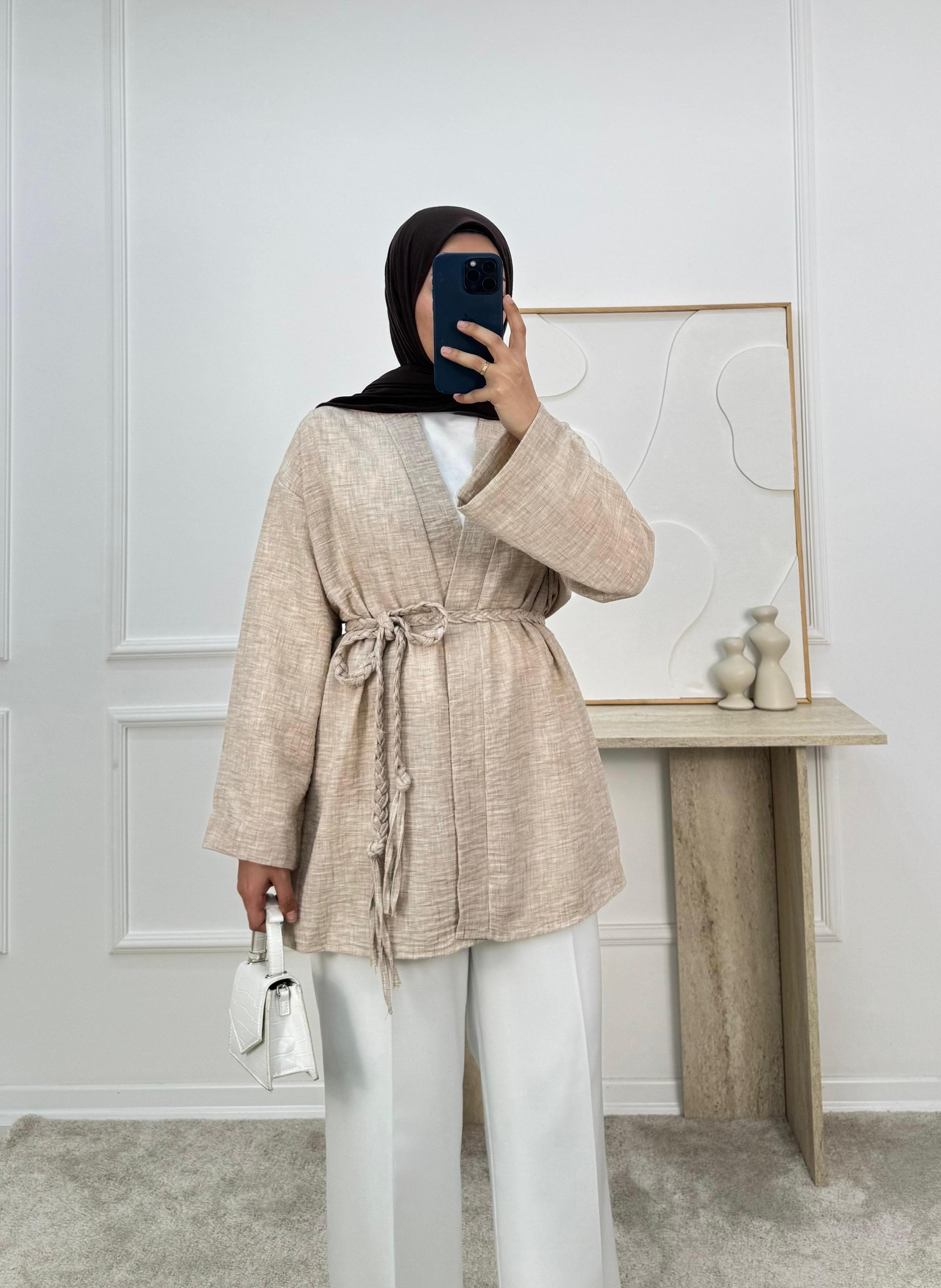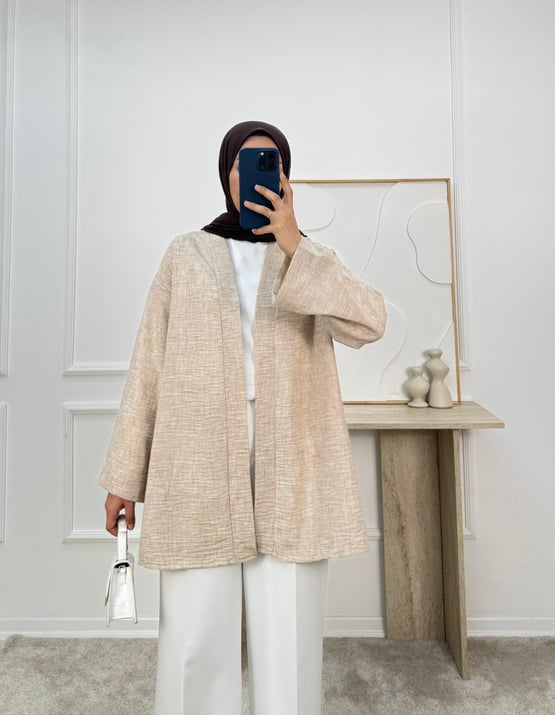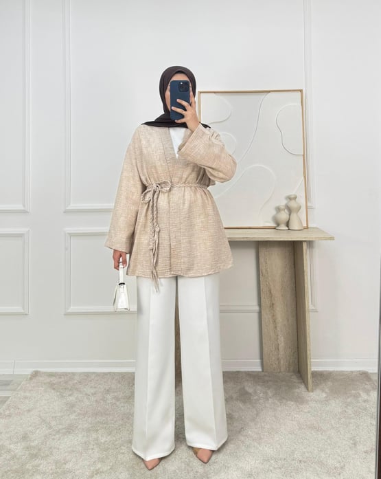 6687 - keten kumaş kemerli kimona -taş (6687)