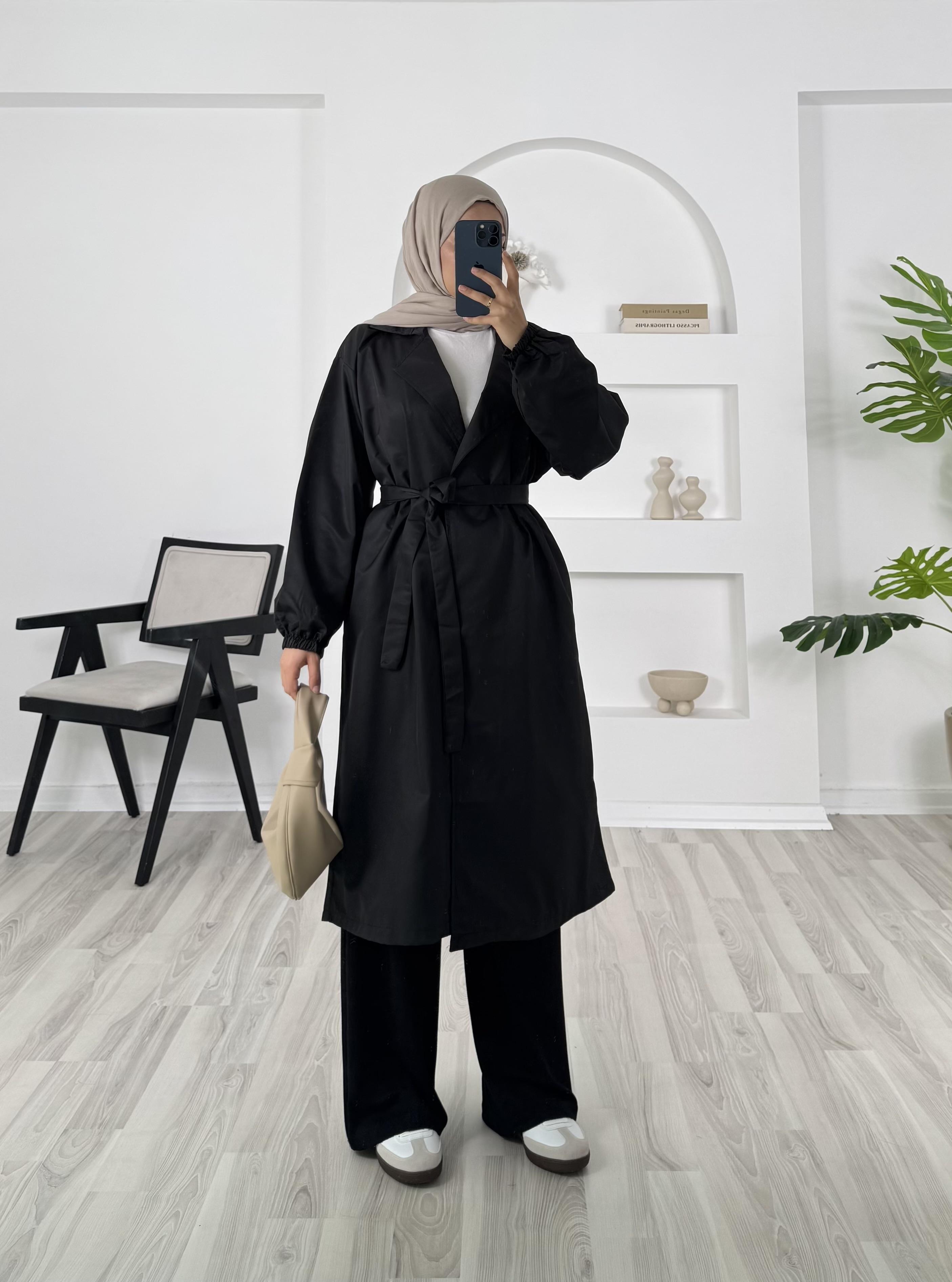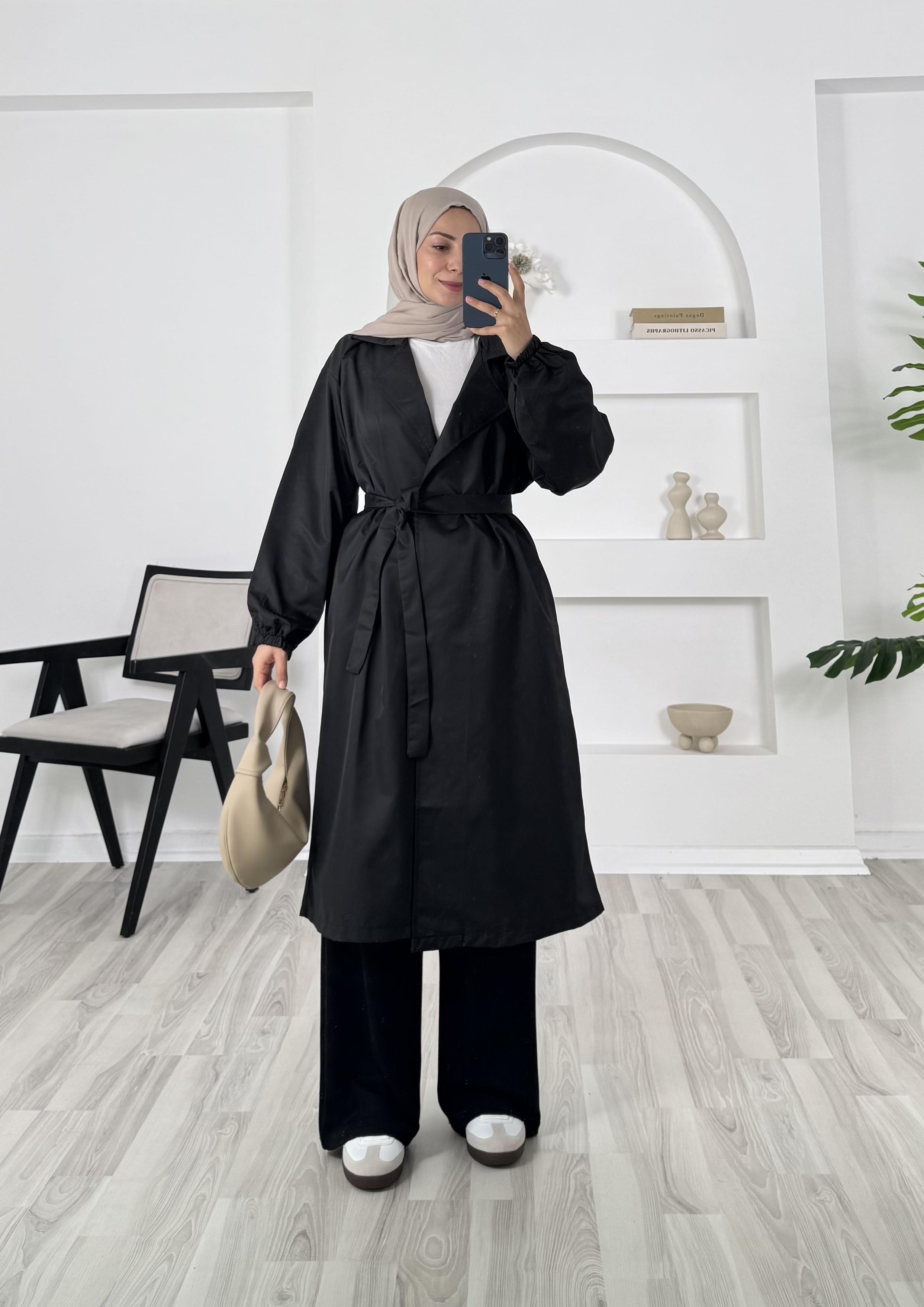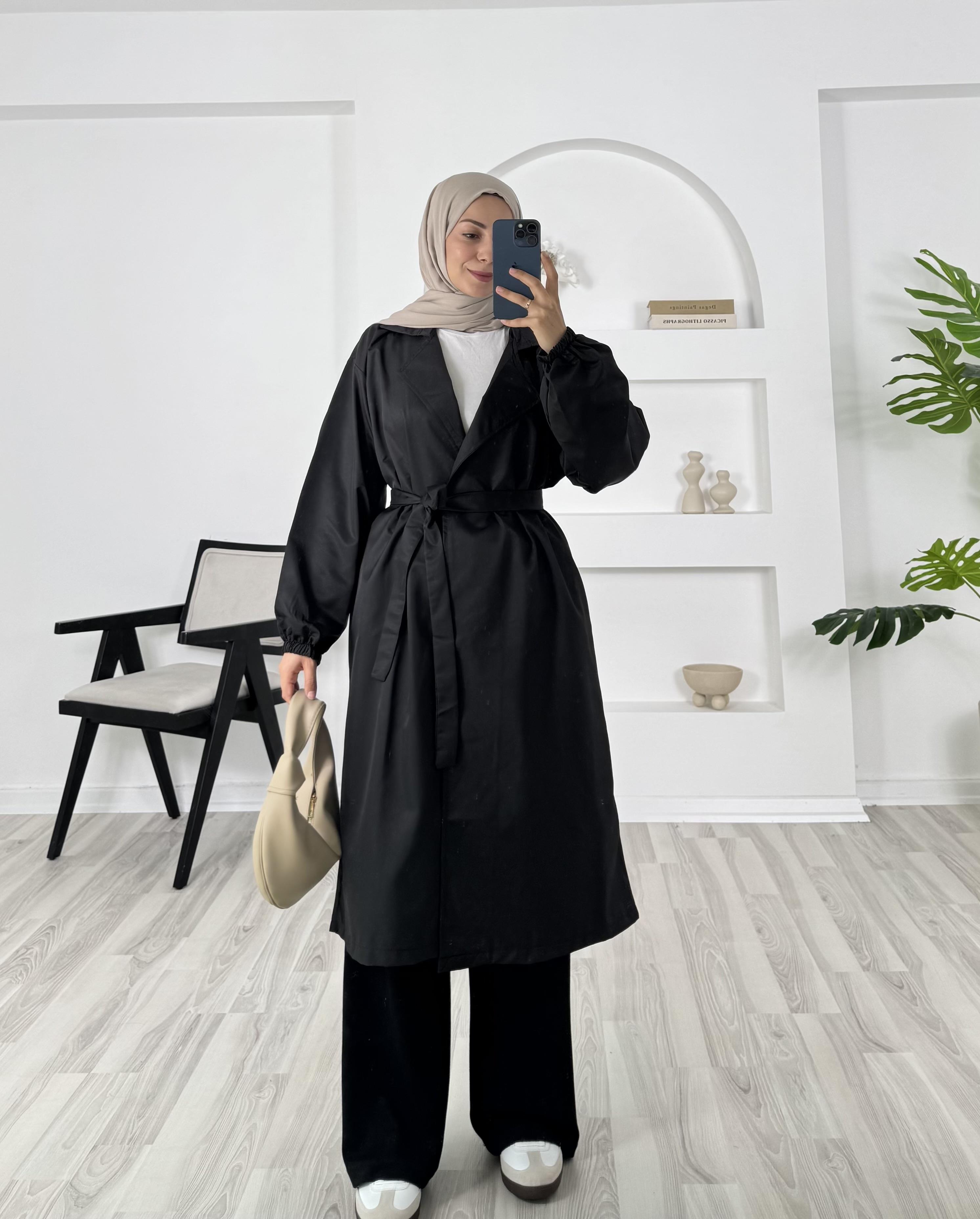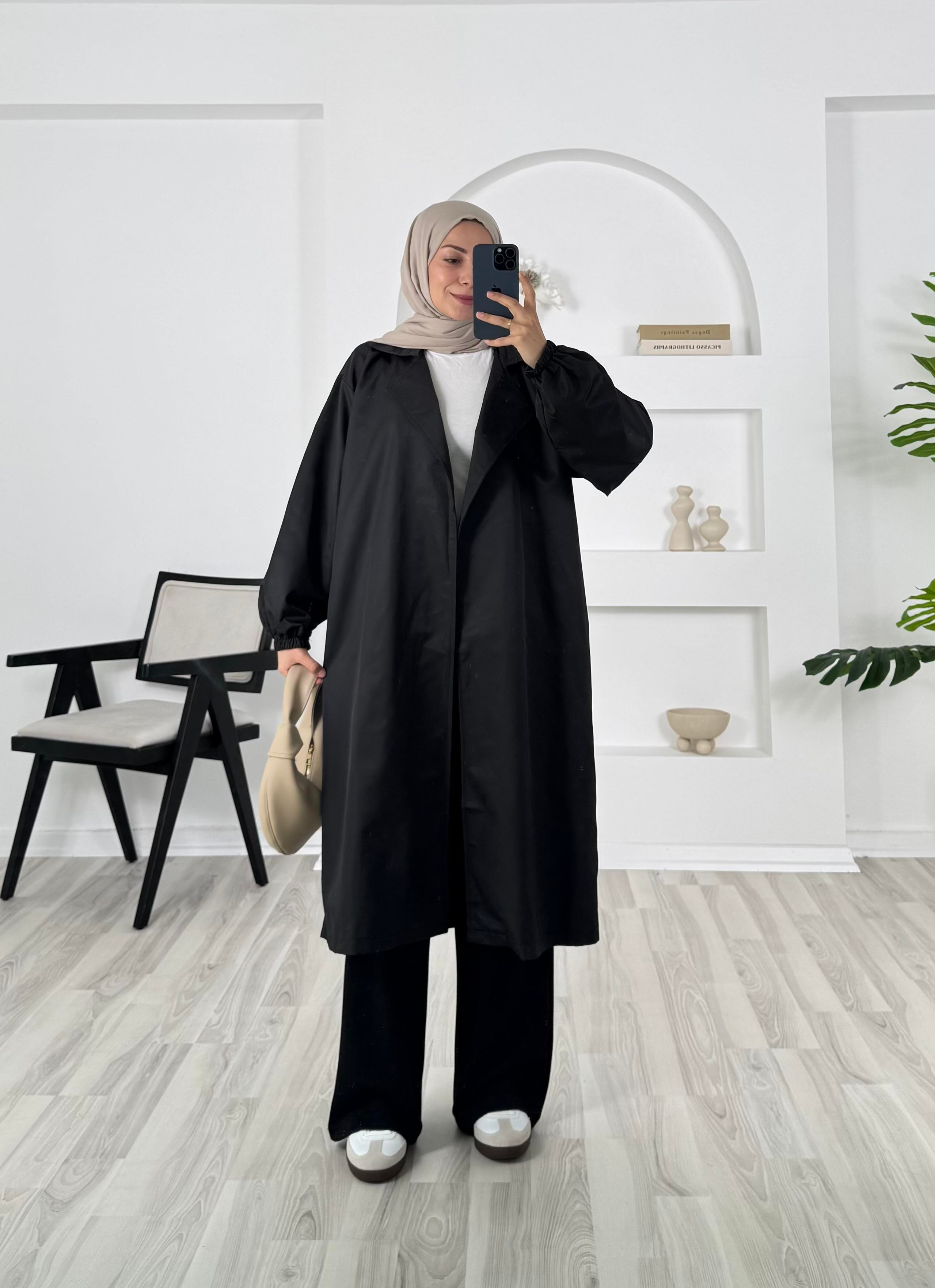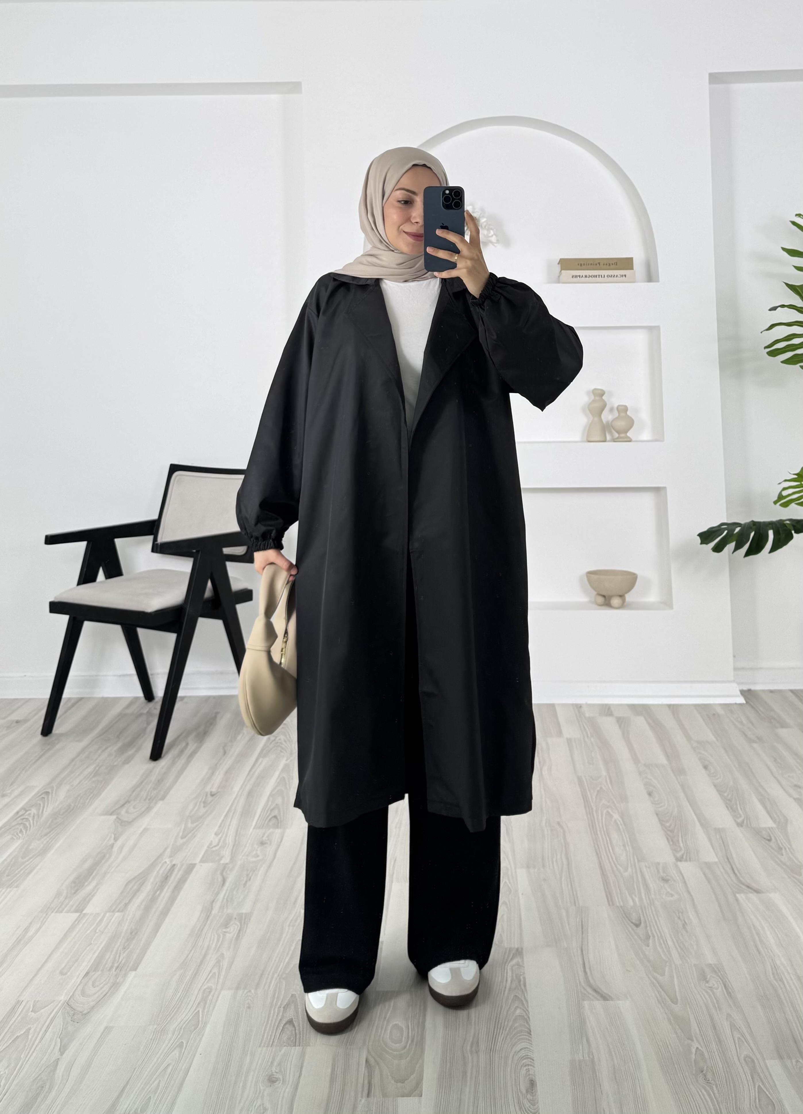 6702 - soft kumaş kolları lastikli trenç -siyah (6702)