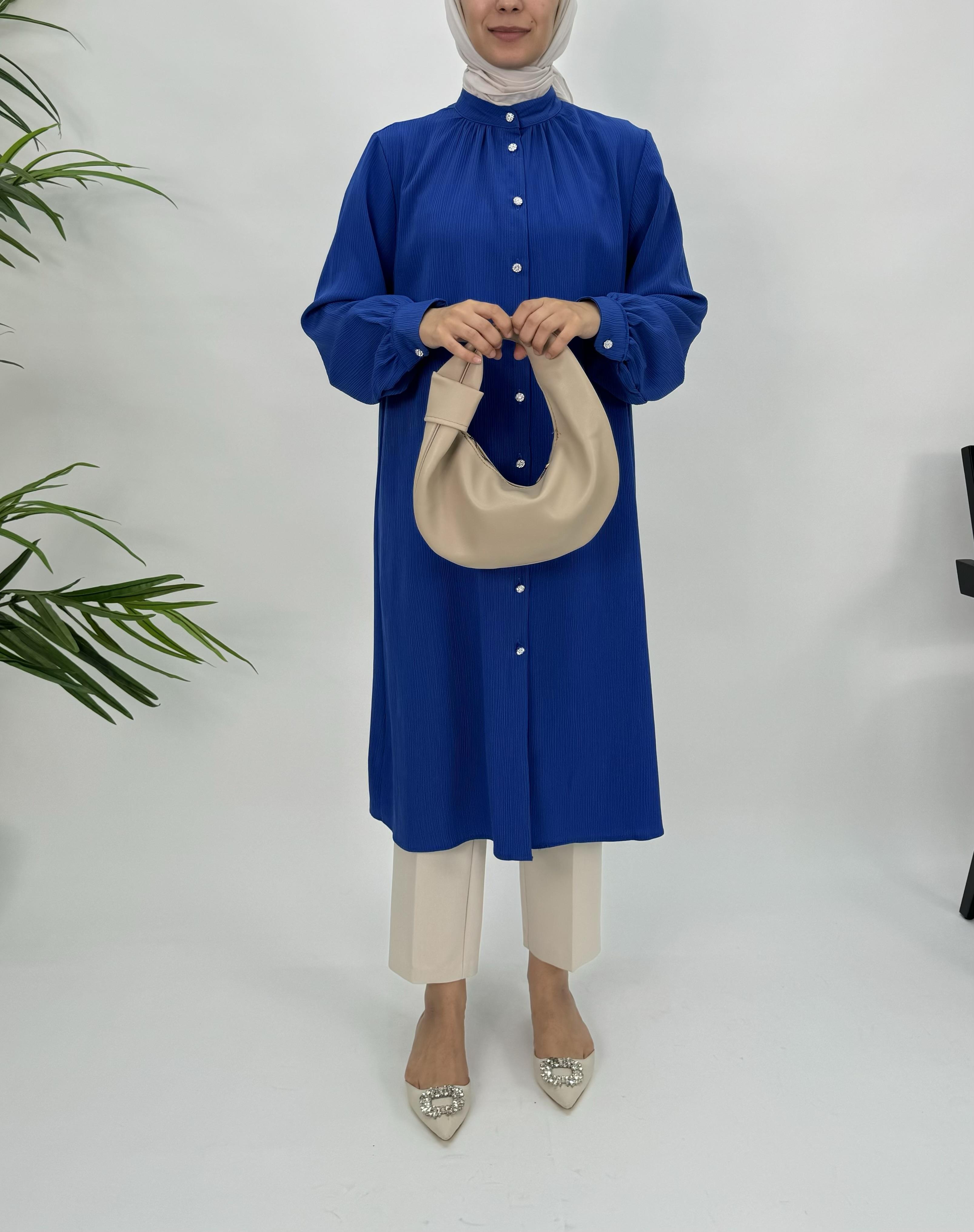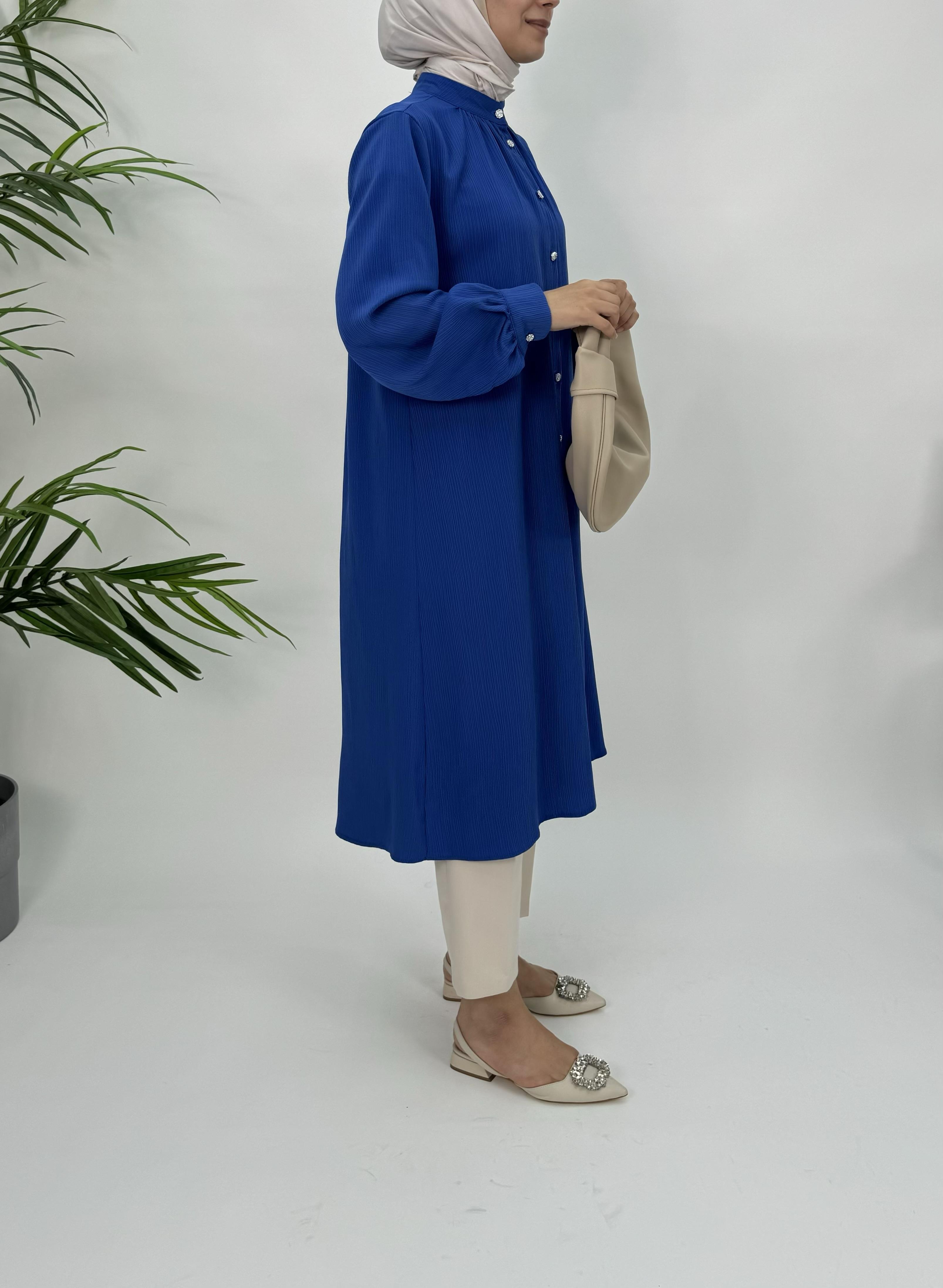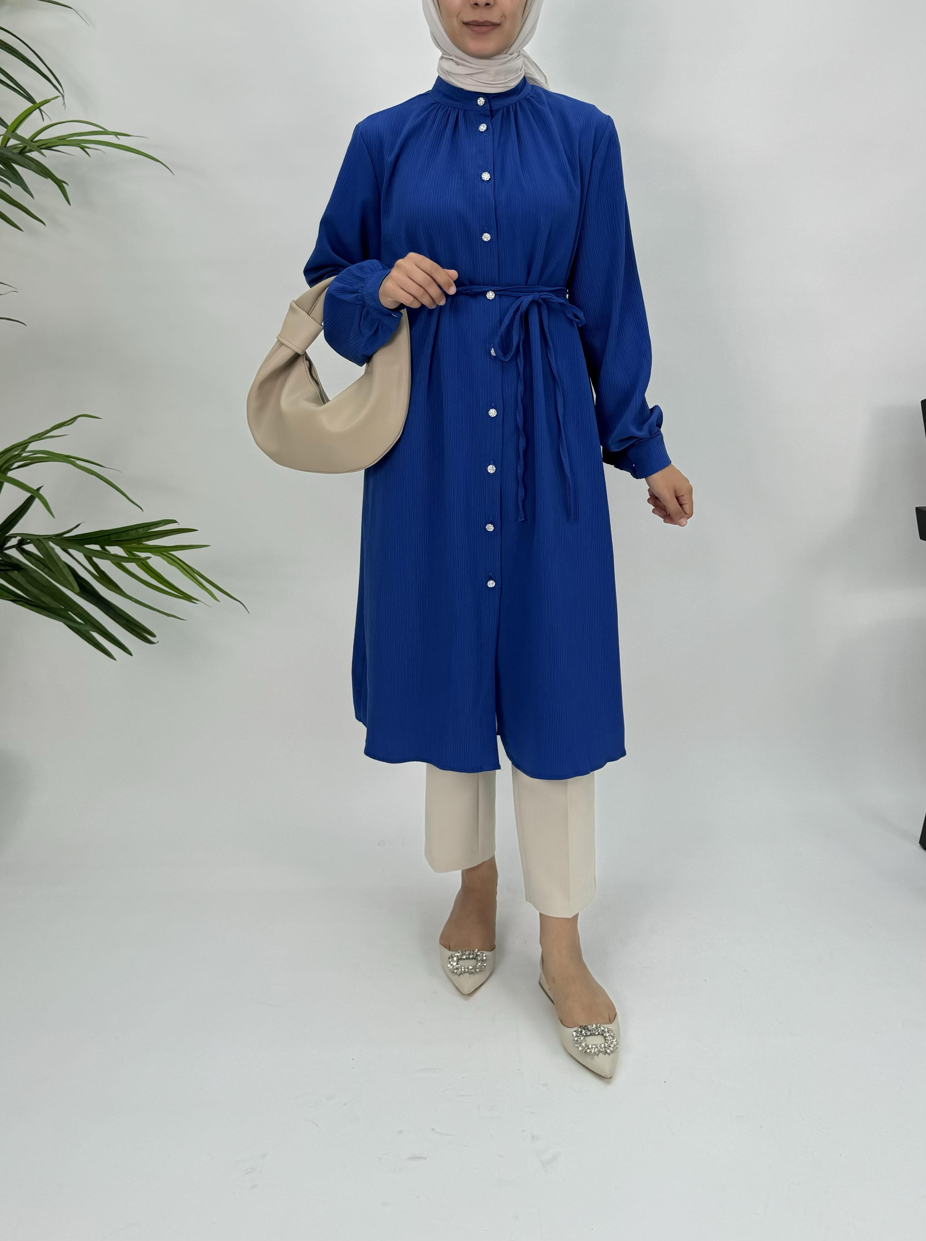 67452-vague-ince kuşaklı taş çiçek düğmeli tunik-mavi (67452)