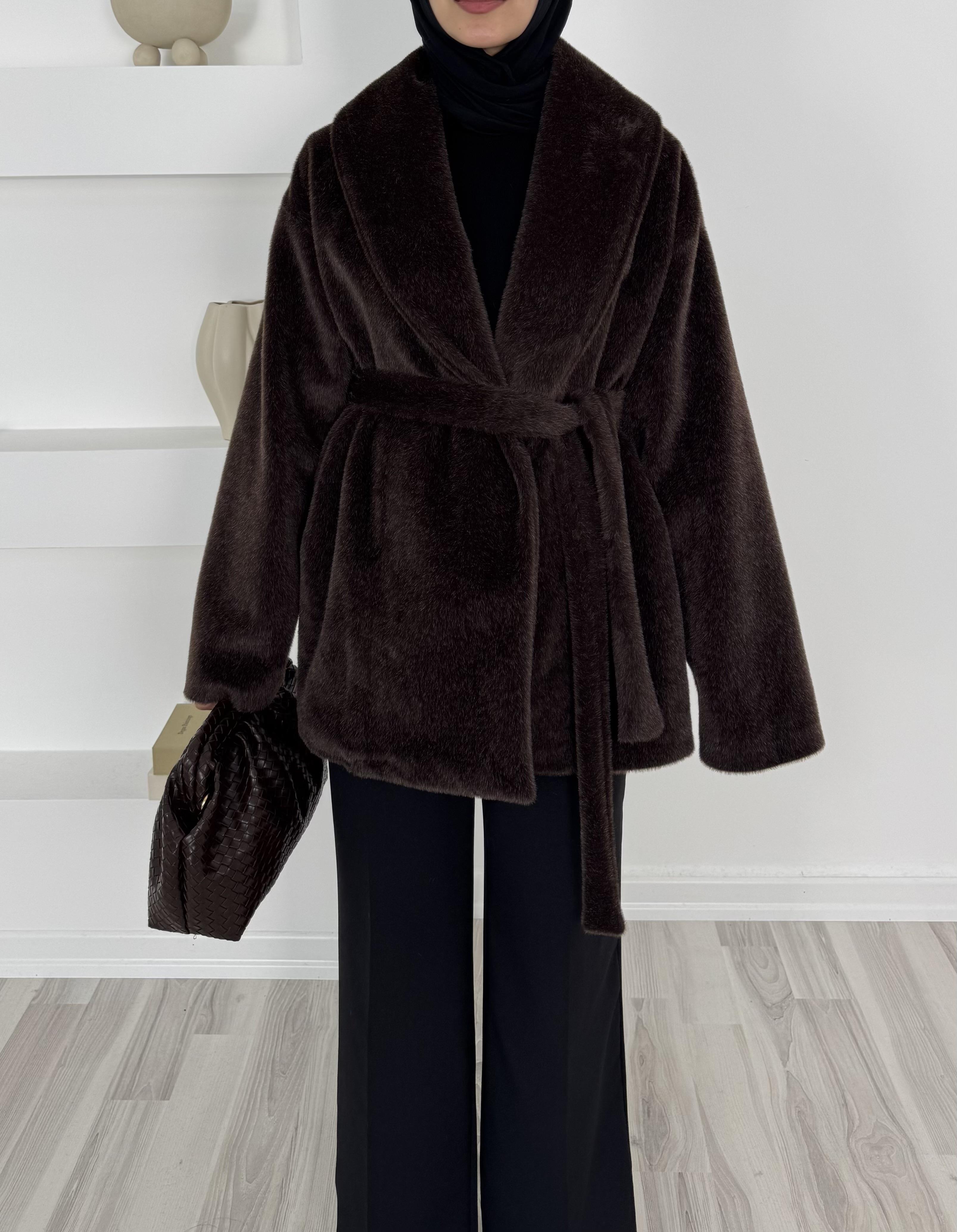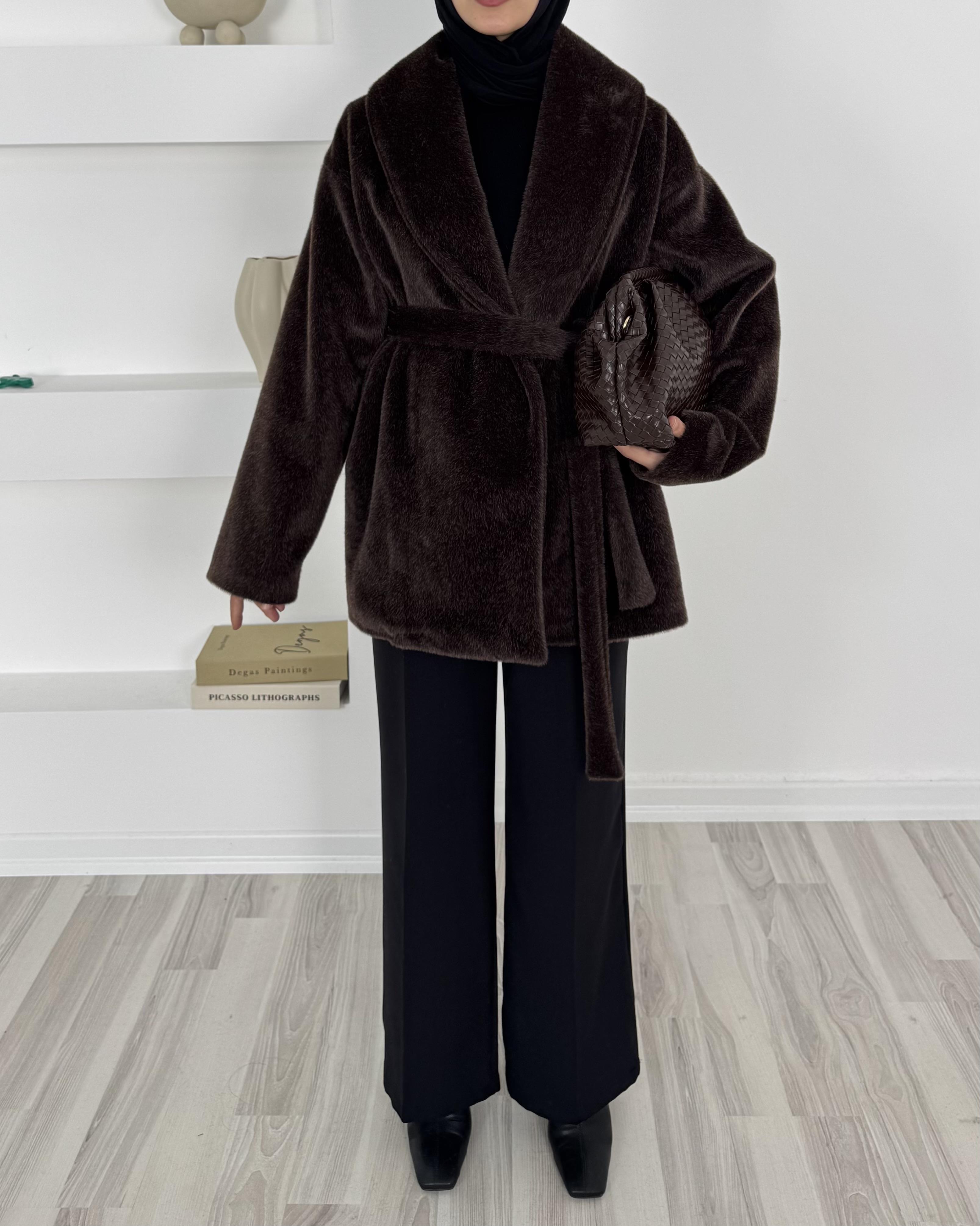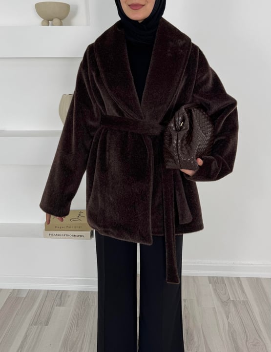 6788-kuşaklı tüylü kısa kap -acı kahve (6788)