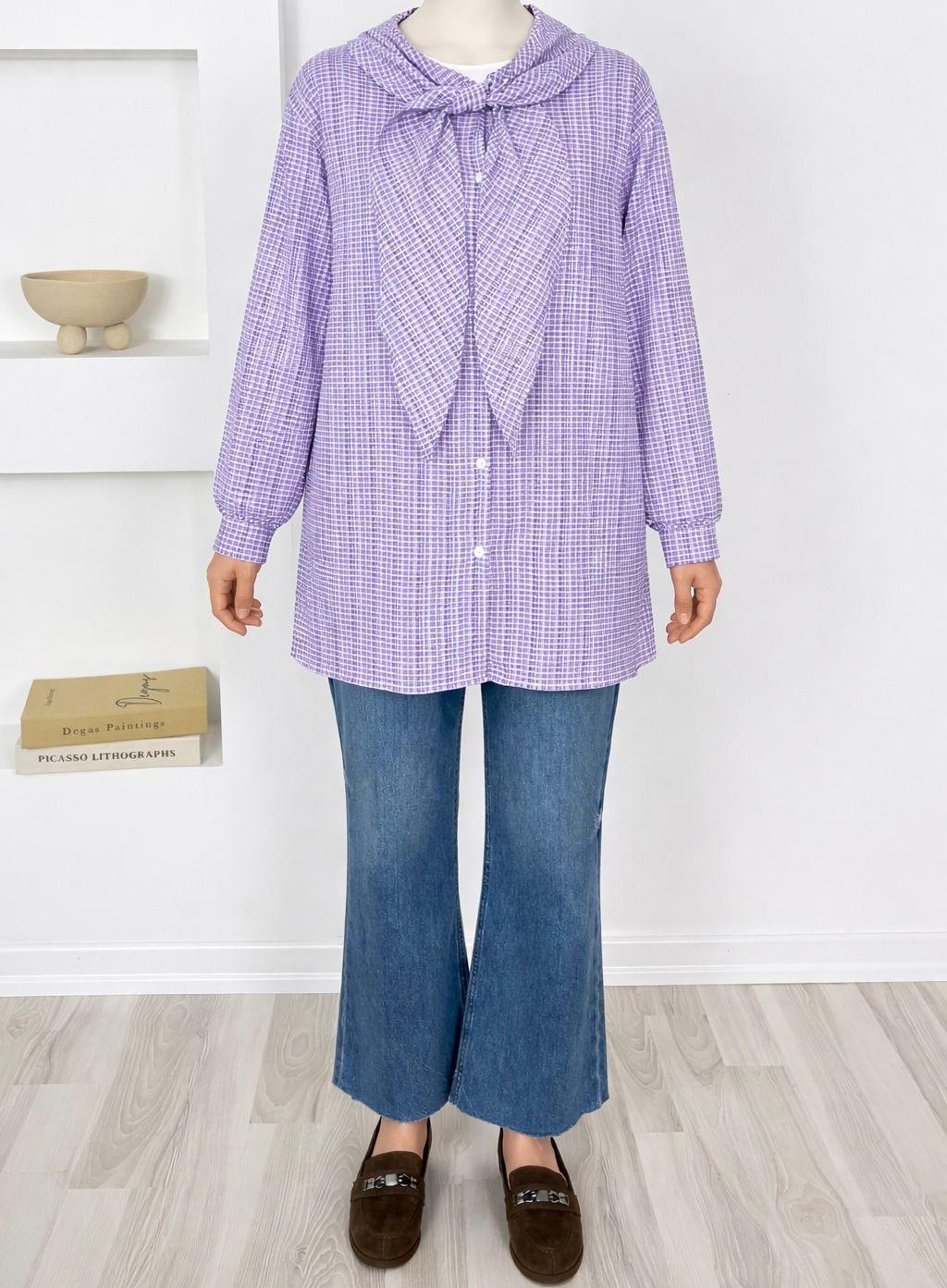 6872-gofre kumaş yakadan bağlamalı tunik-mor (6872)
