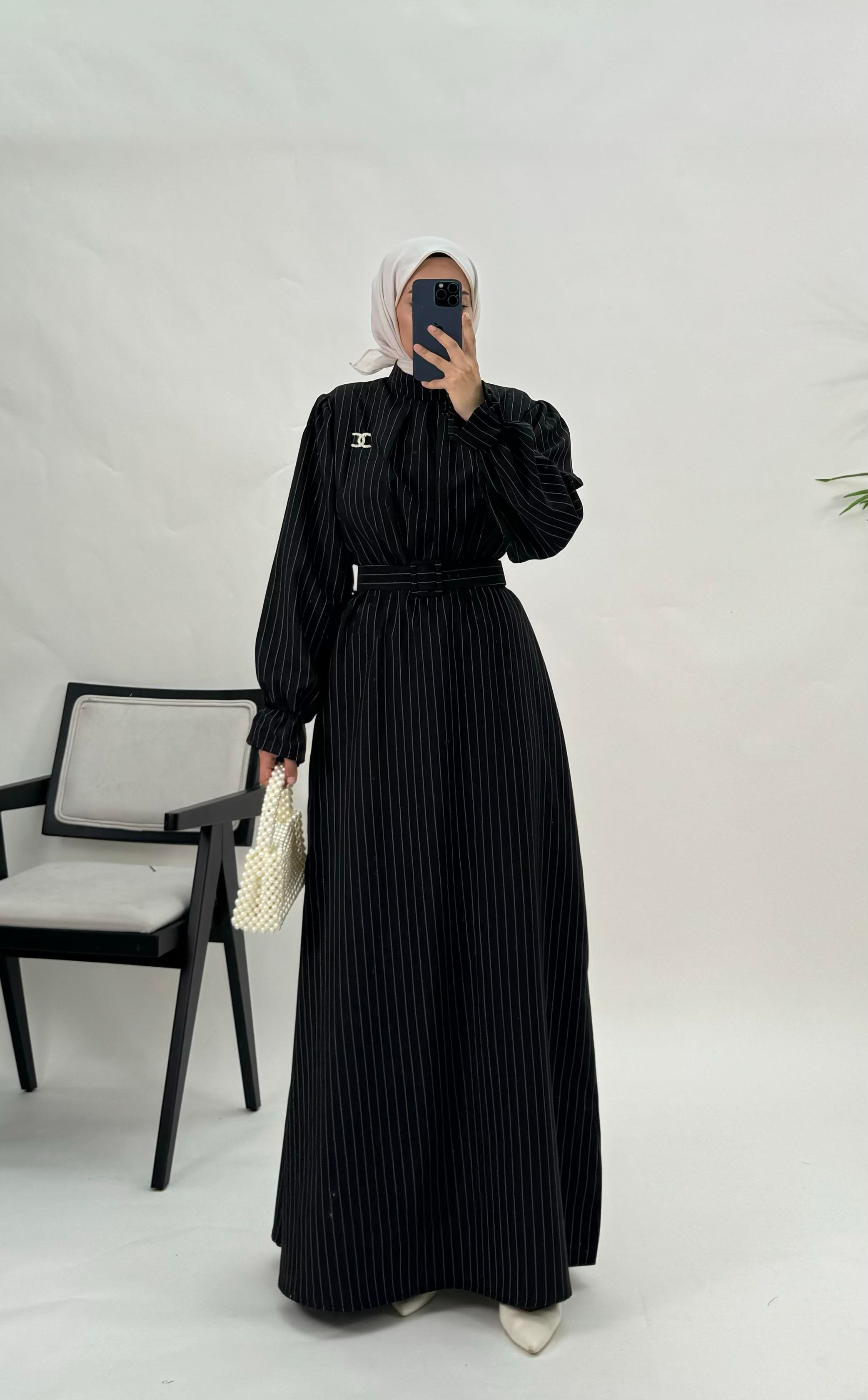 6985-elonor kumaş-bronşlu bilek ucu fırfırlı kemerli çizgili elbise-siyah (6985)