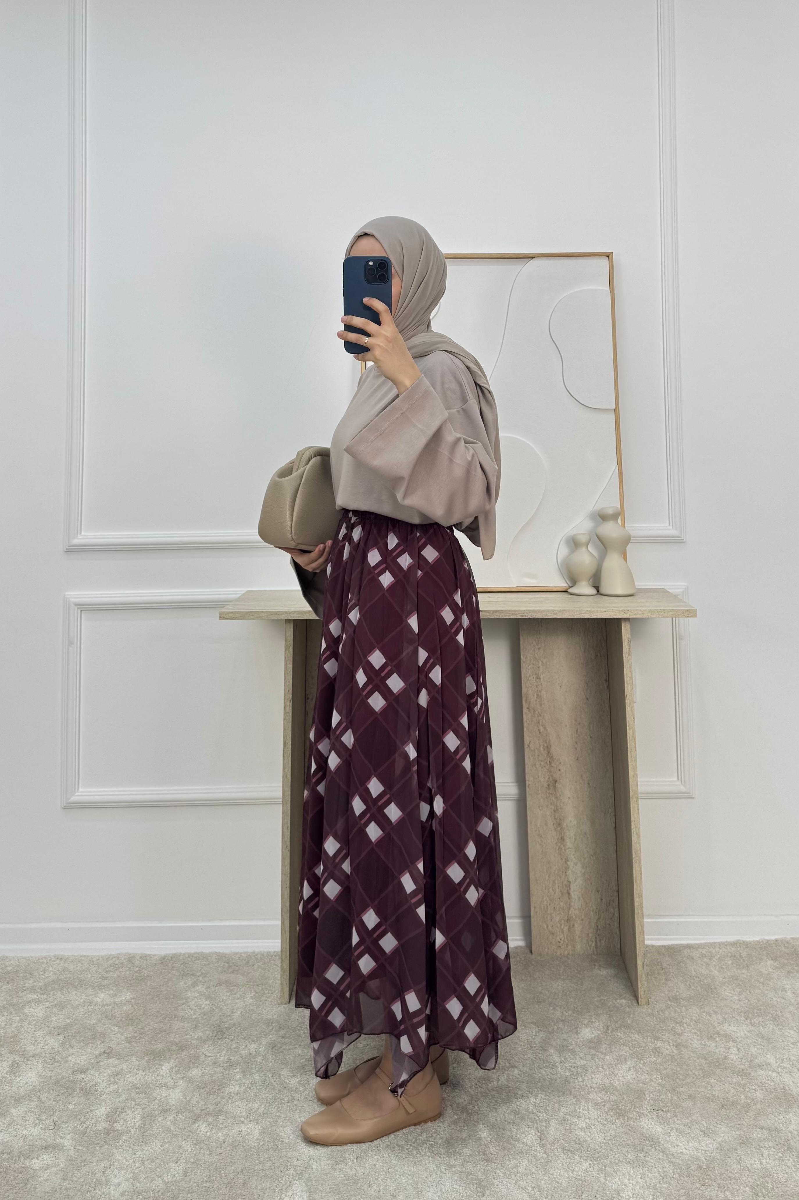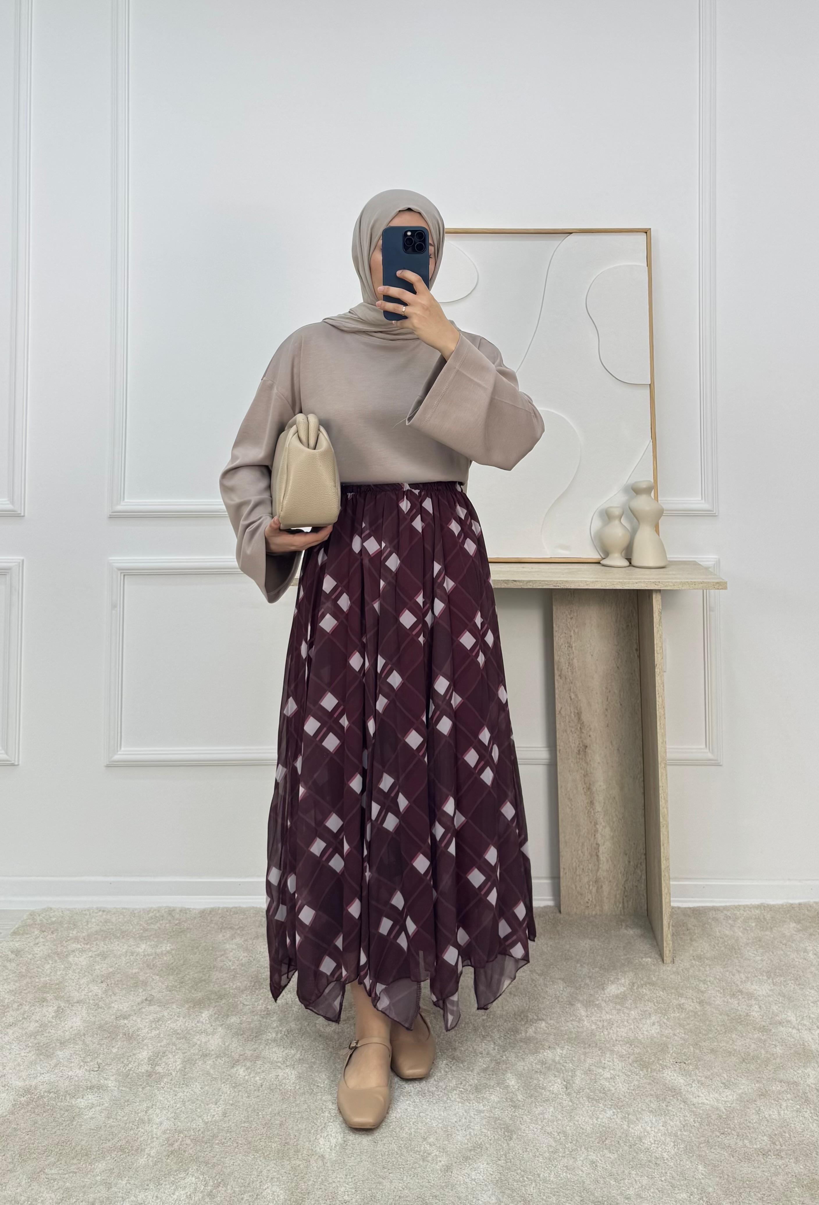 7023-KARE DESENLİ ŞİFON ETEK-BORDO (7023)
