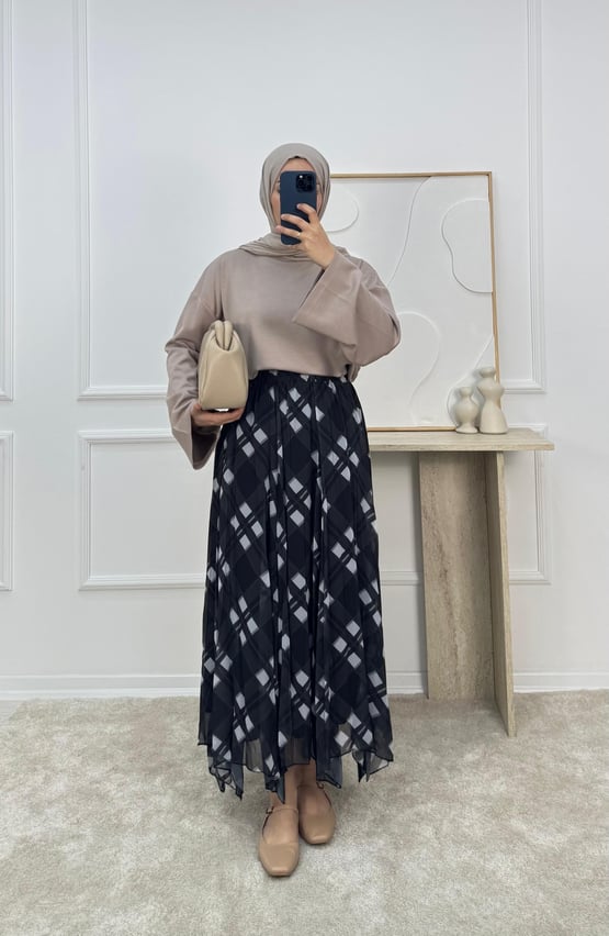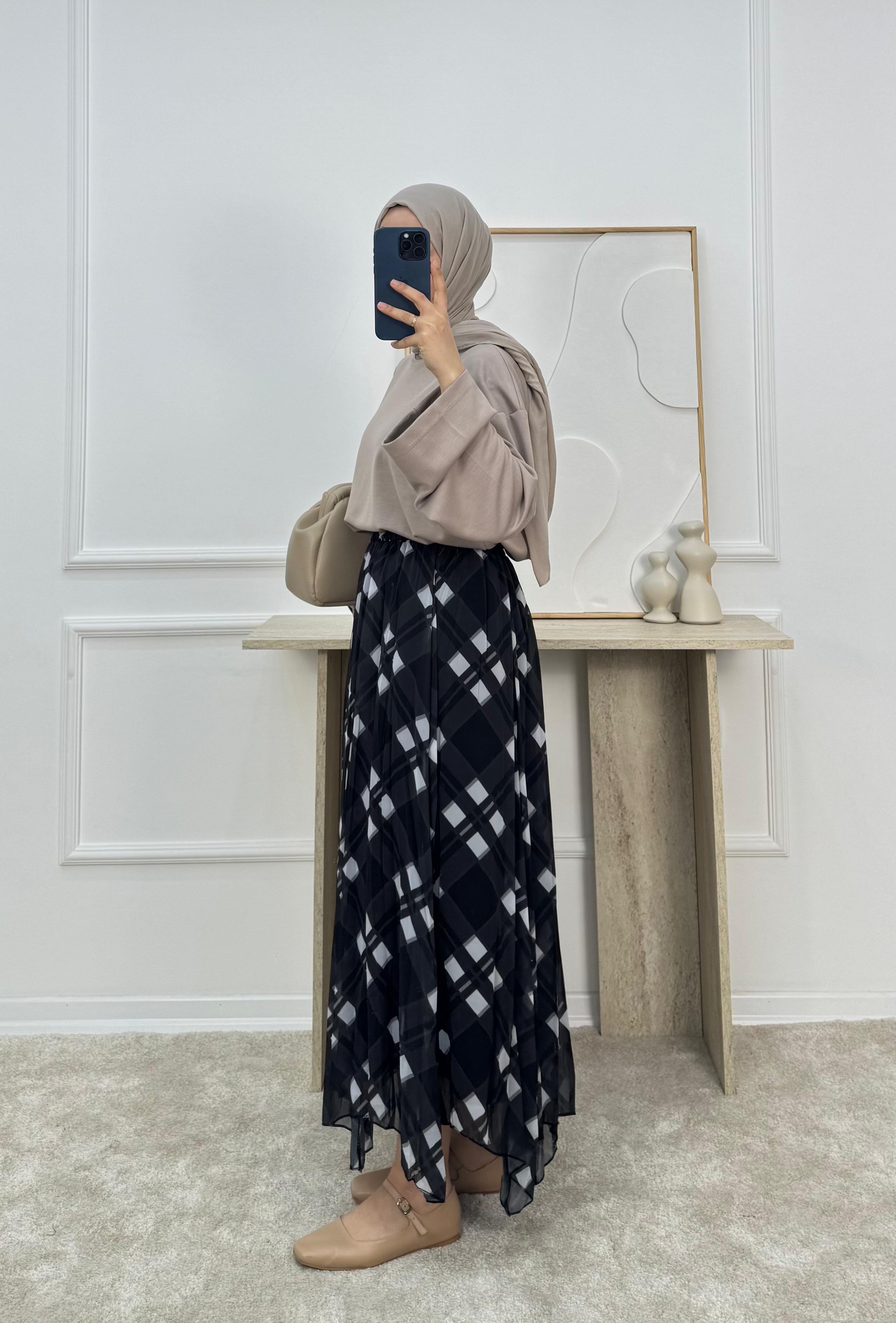 7023-KARE DESENLİ ŞİFON ETEK-SİYAH (7023)