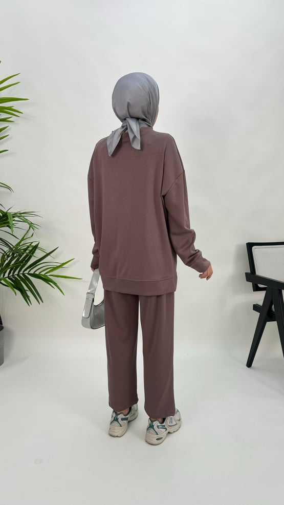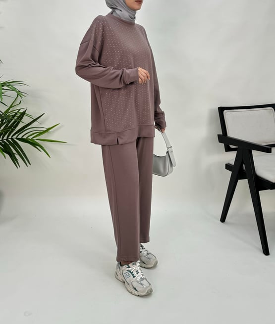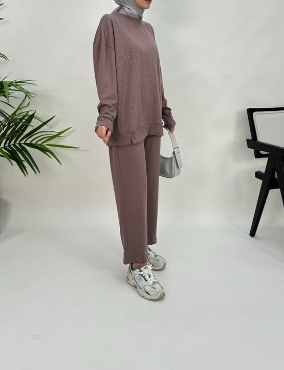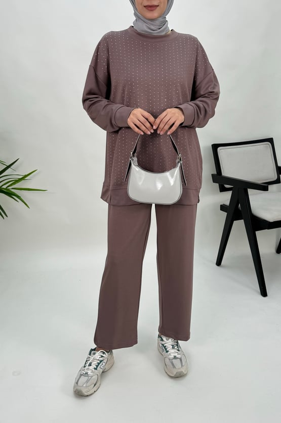 7134-oysho kumaş-önü taşlı pantolonlu takım-vizon (7134)