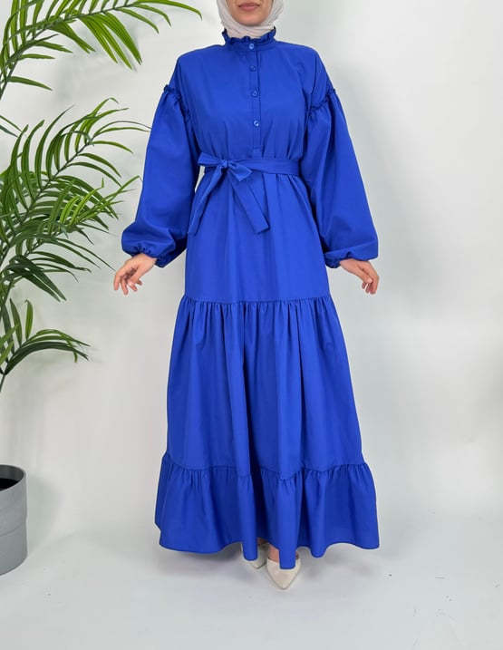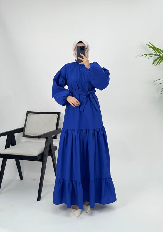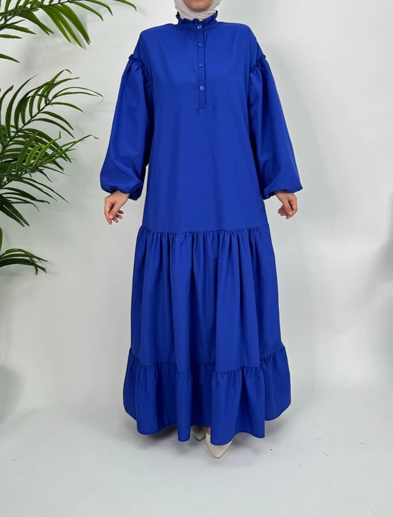 7148-terikoton kumaş-yarım düğmeli elbise-mavi (7148)