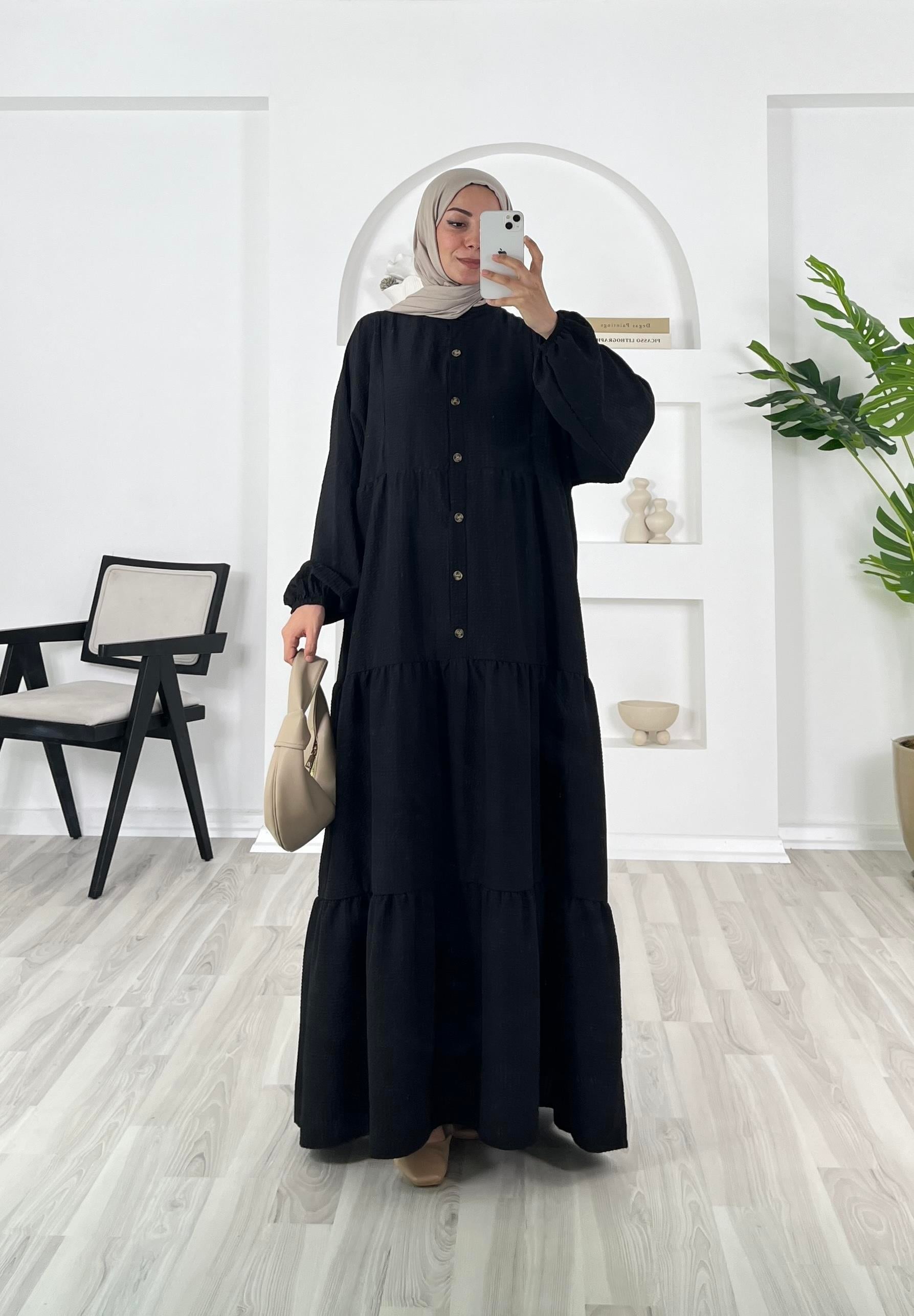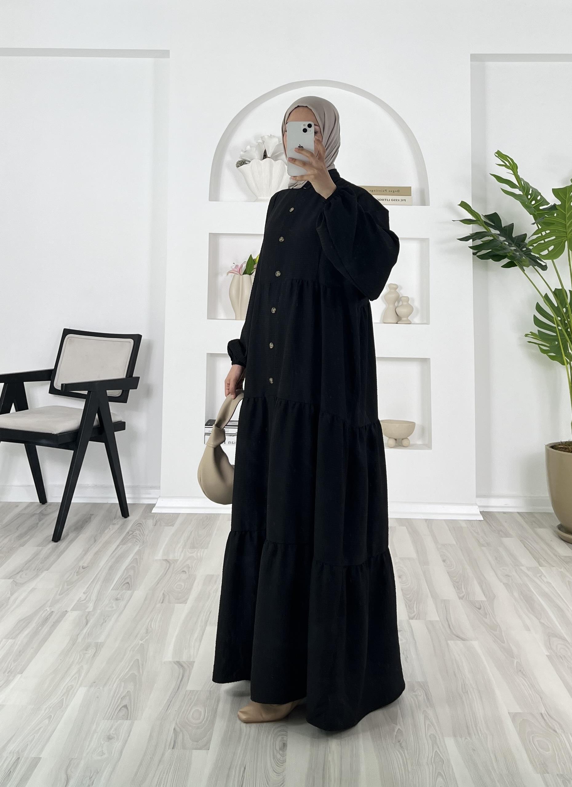 7159 - Gofre kumaş beline kadar dügmeli fırfırlı elbise - siyah (7159)