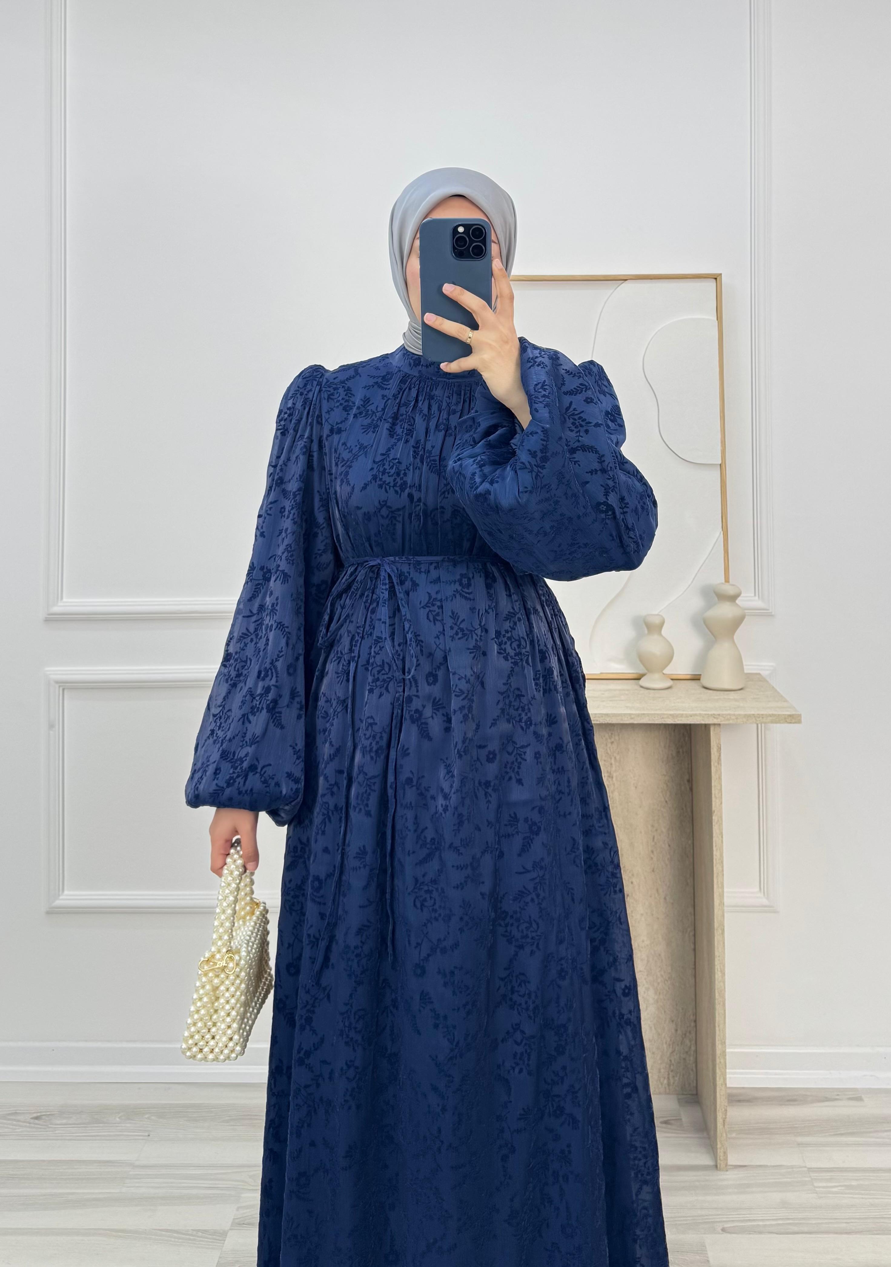 7182-balon kollu astarlı flok tül elbise-mavi (7182)