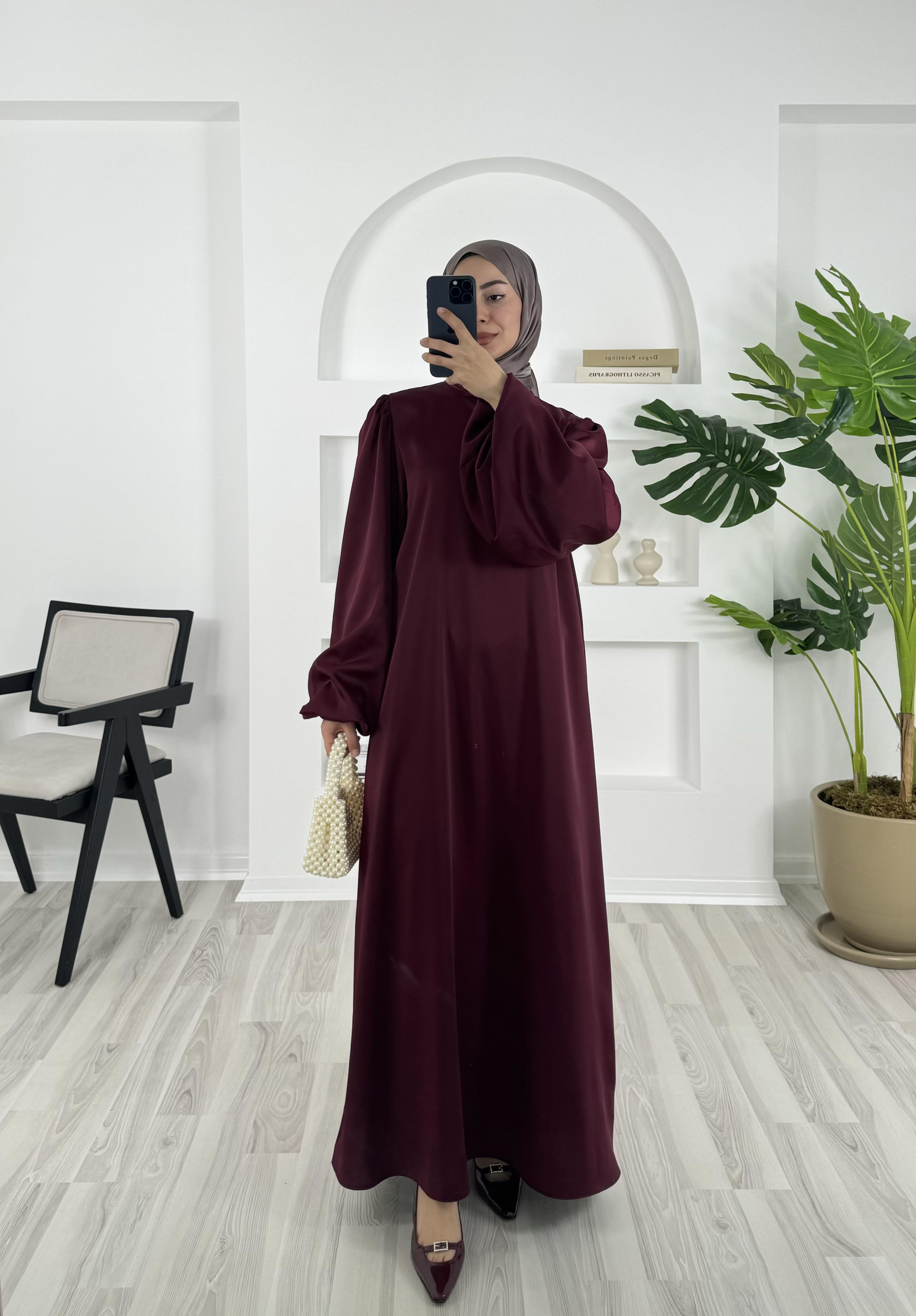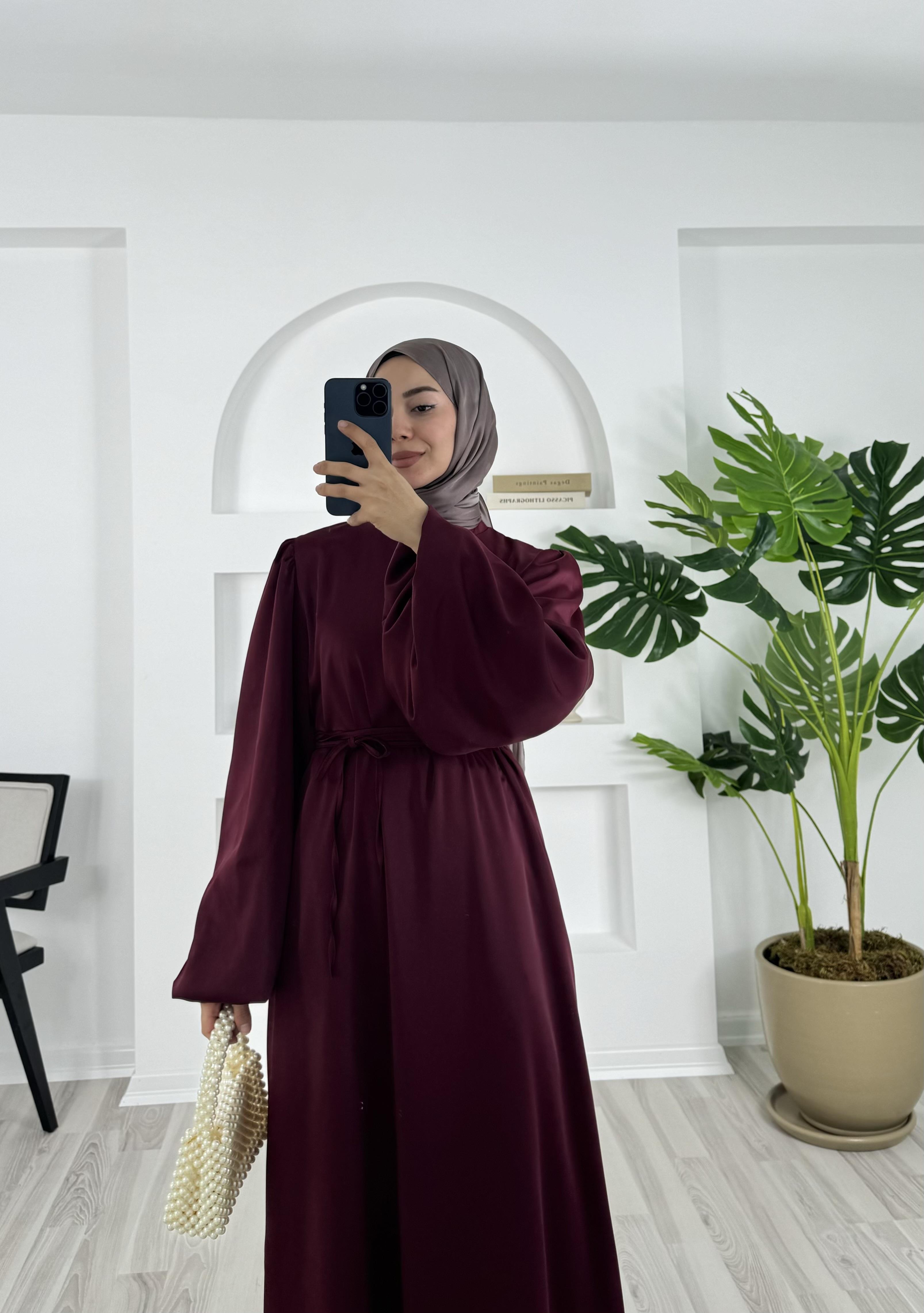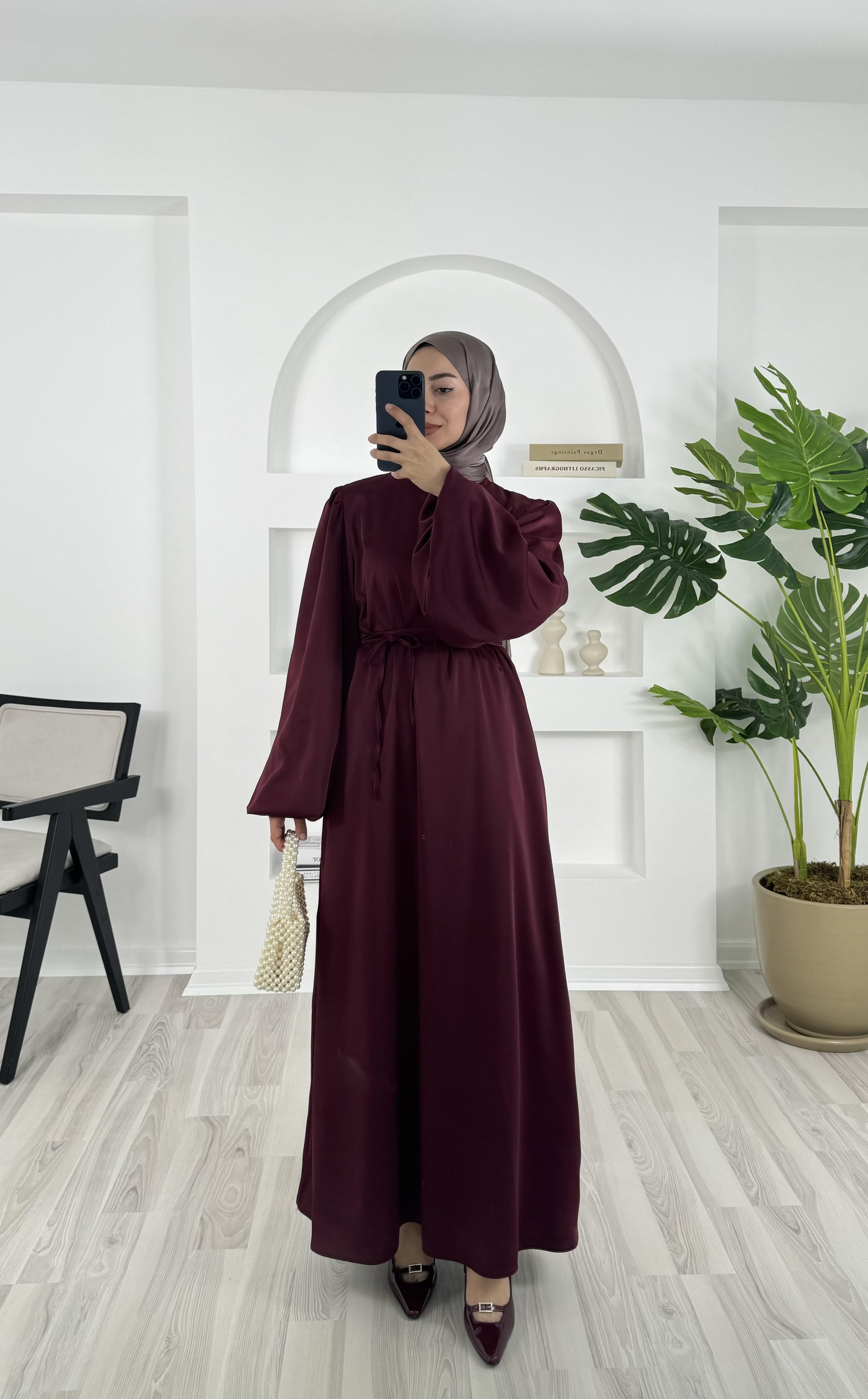 7185 F32+Balon Kol Hakim Yaka Kuşaklı Saten Elbise bordo (7185)