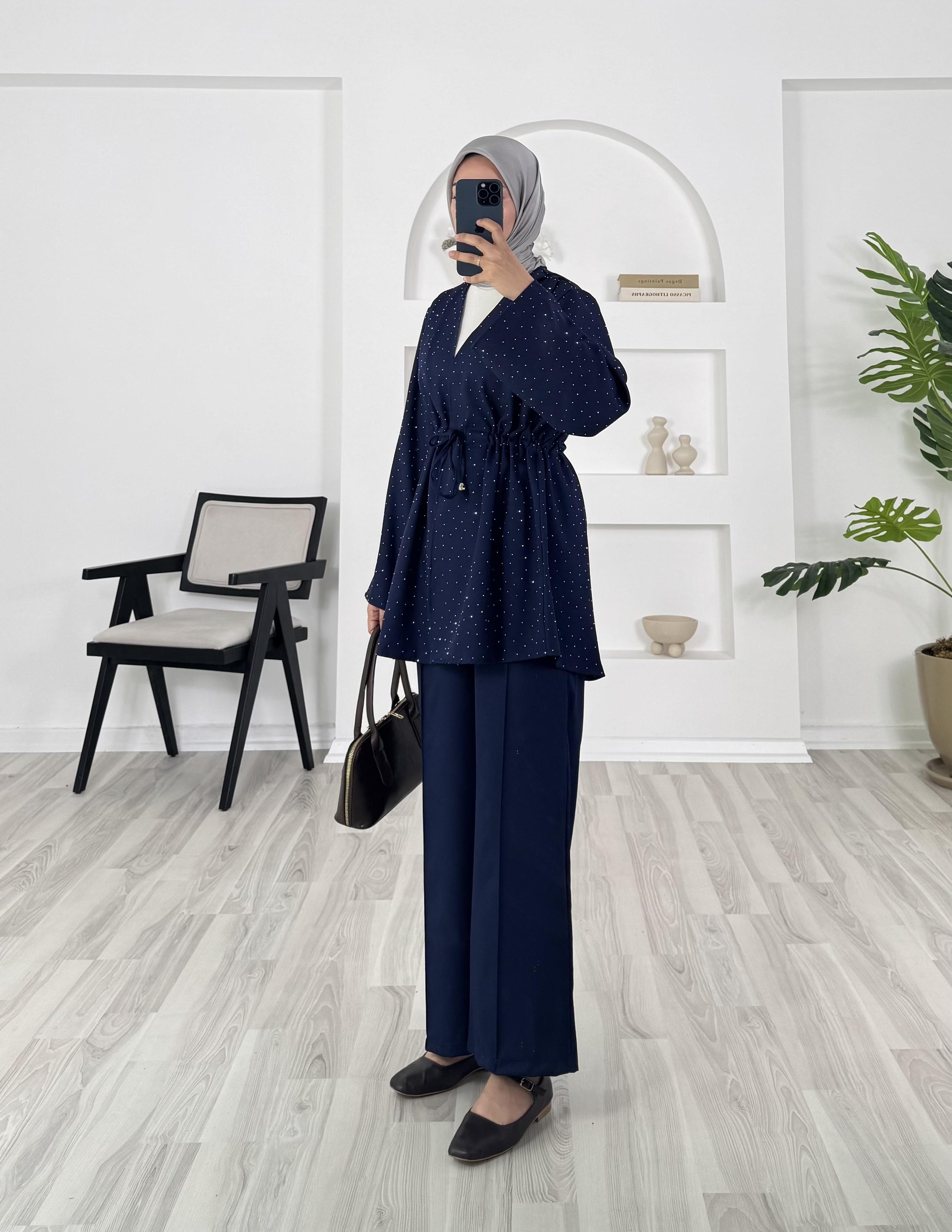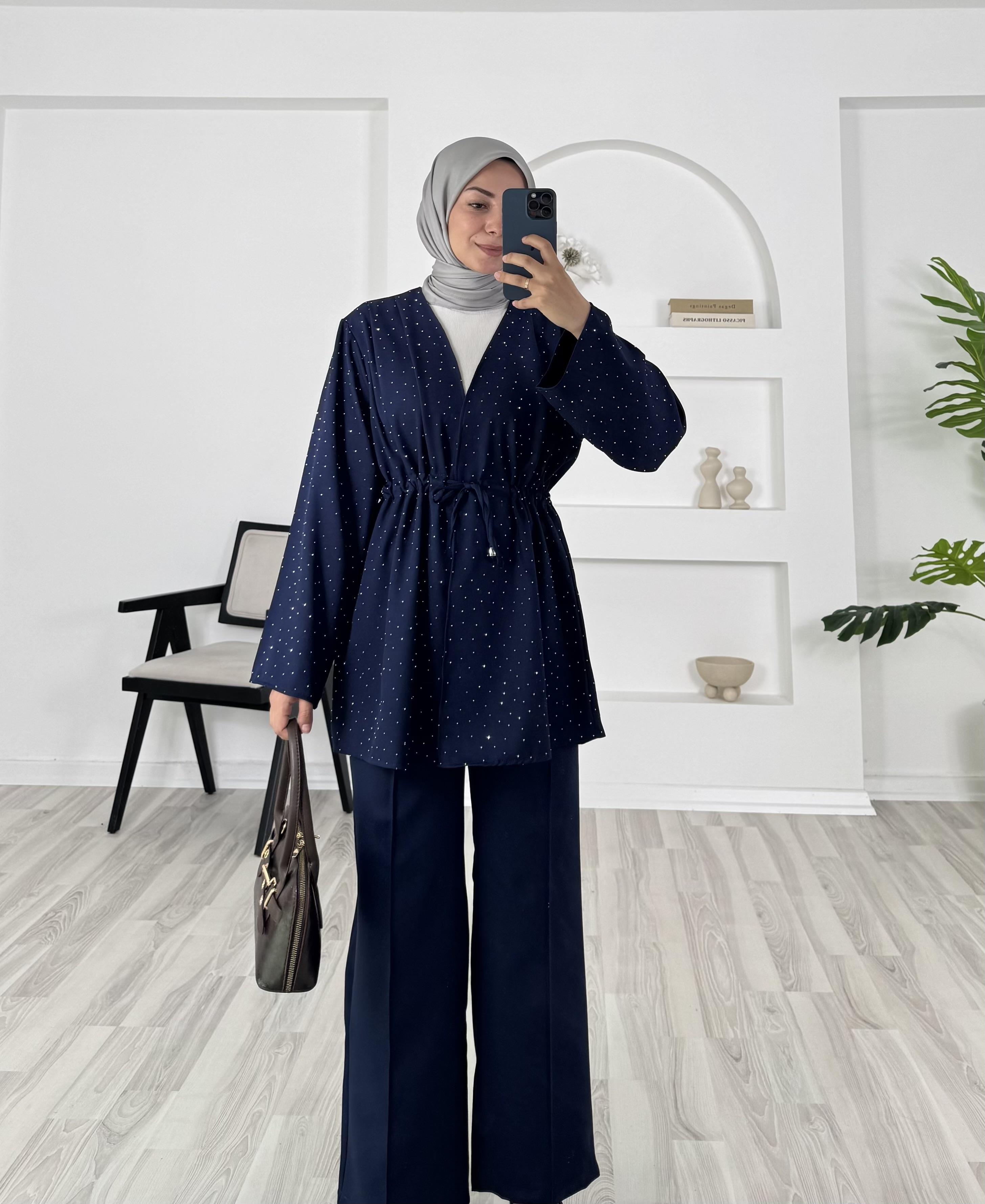 7200-dabıl krep kumaş üstü taşlı baglamalı pantolonlu takım - lacivert (7200)