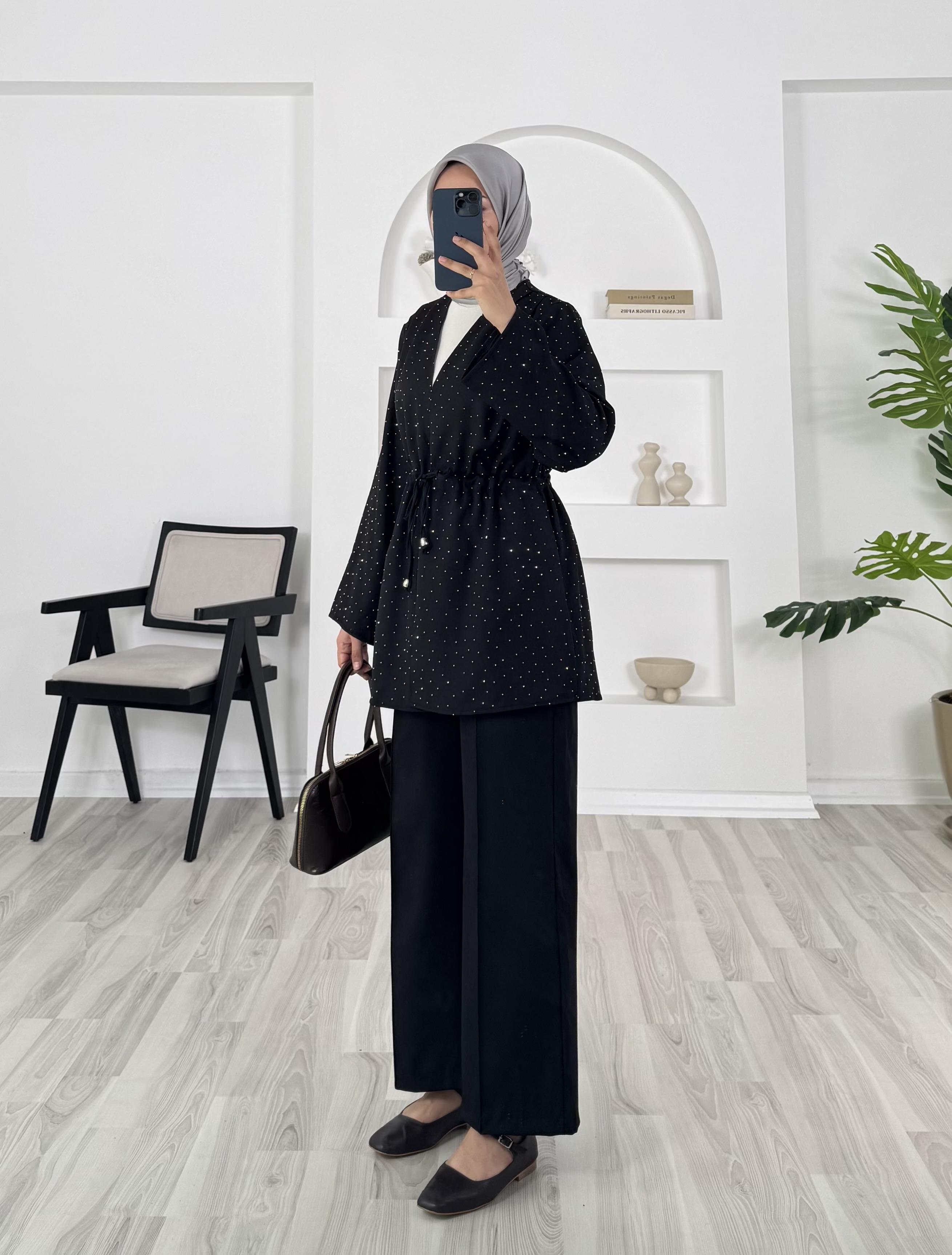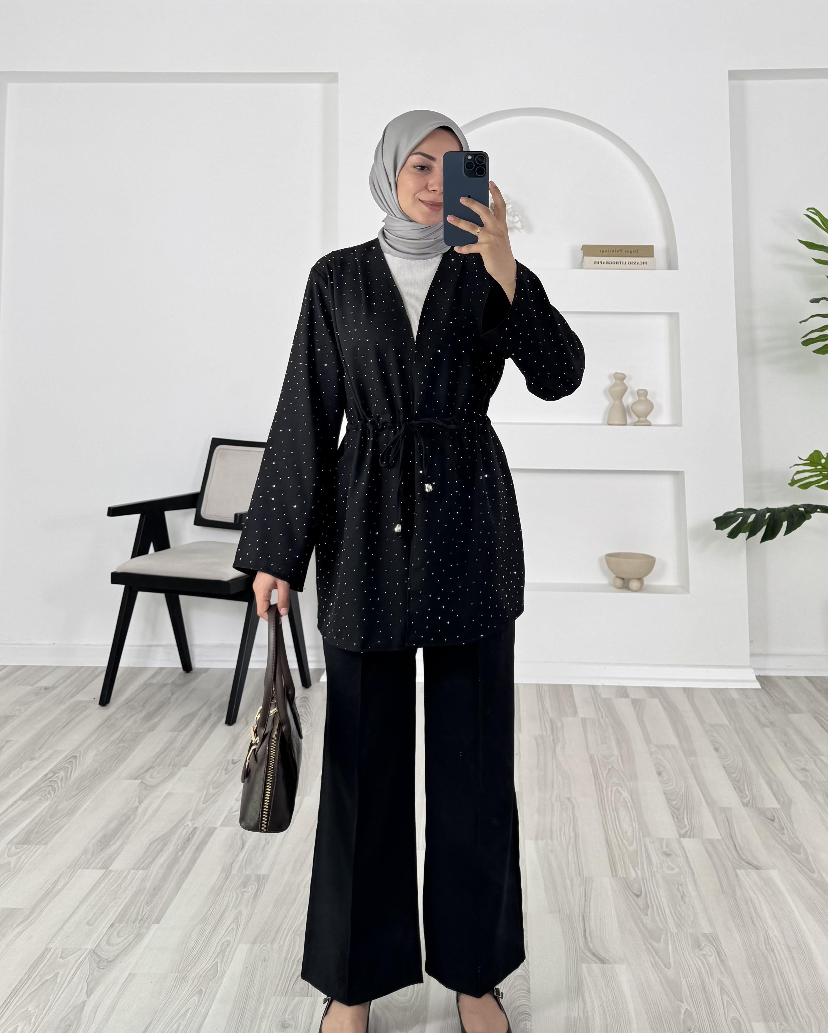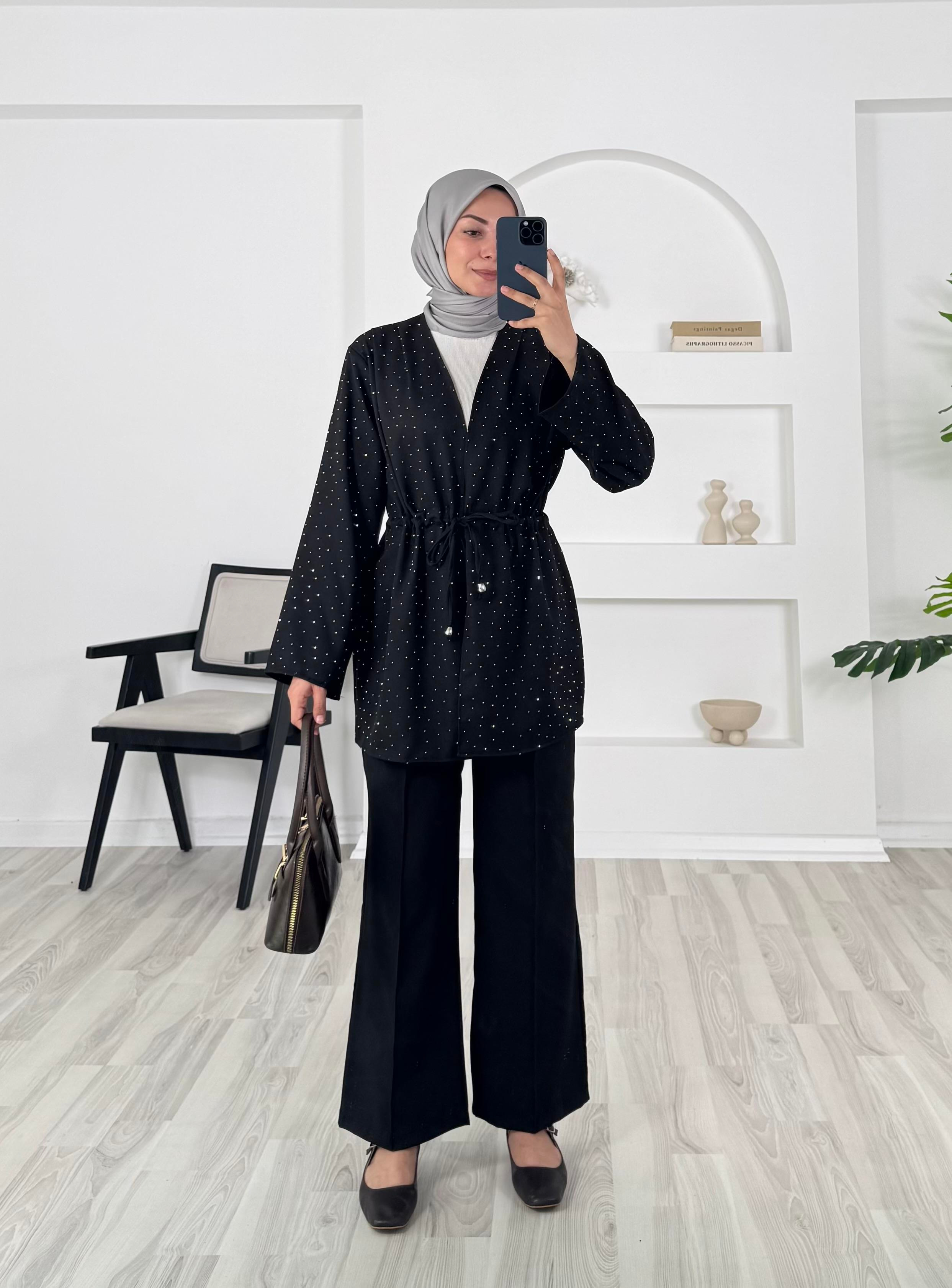 7200-dabıl krep kumaş üstü taşlı baglamalı pantolonlu takım - siyah (7200)