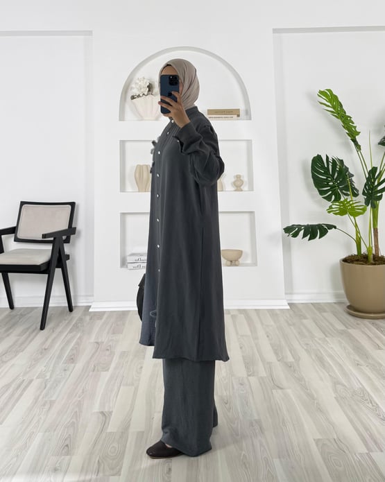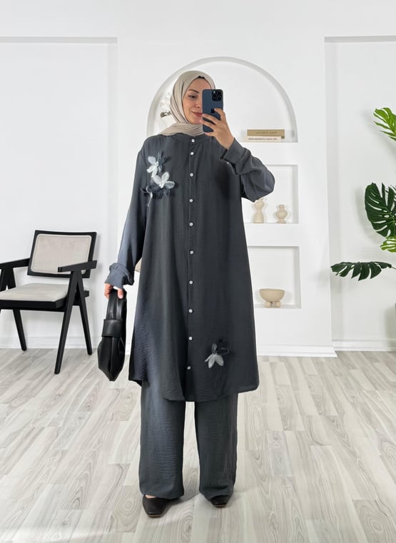 7203-ayrobin kumaş-süs çiçek detaylı pantolonlu takım-füme (7203)