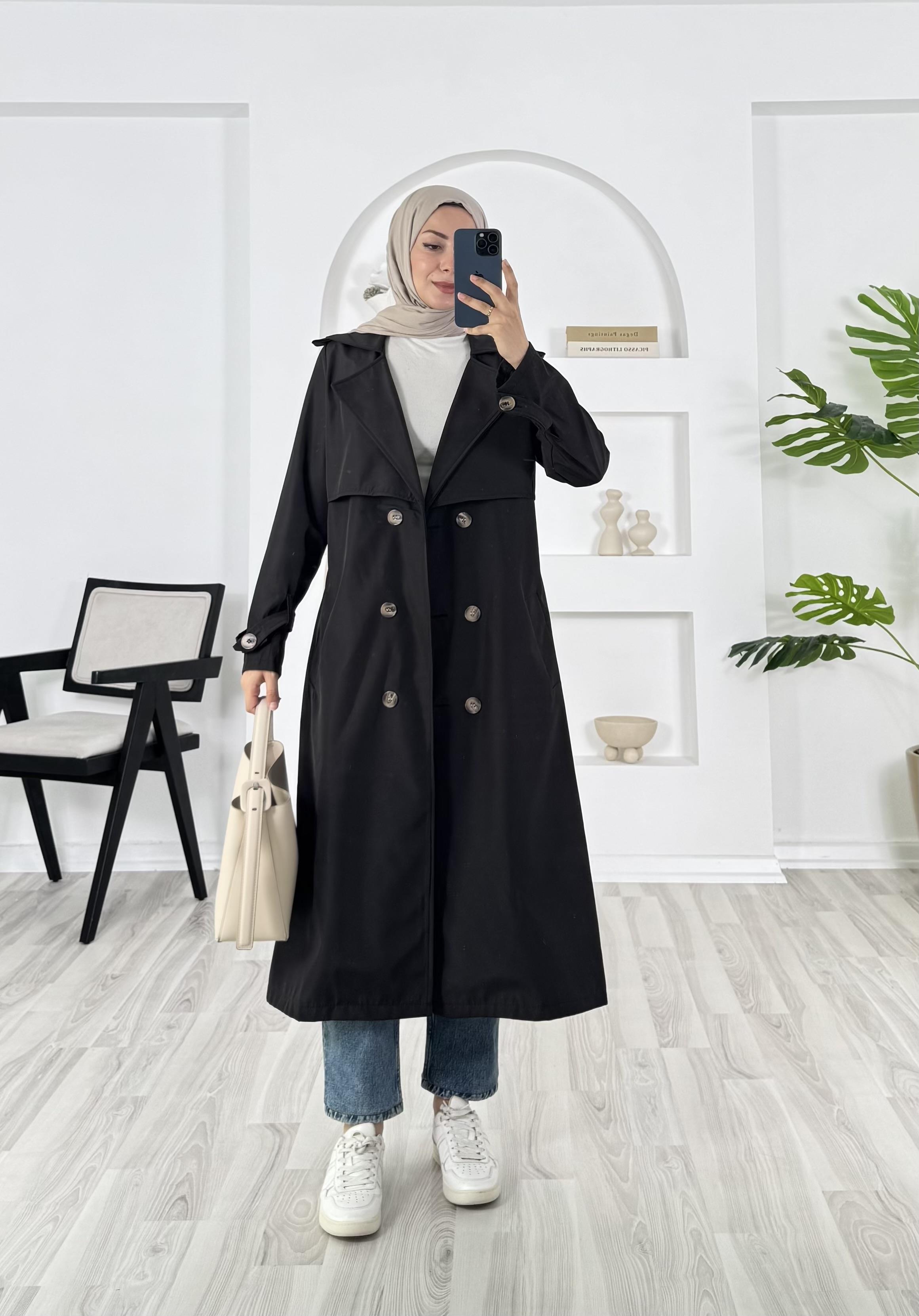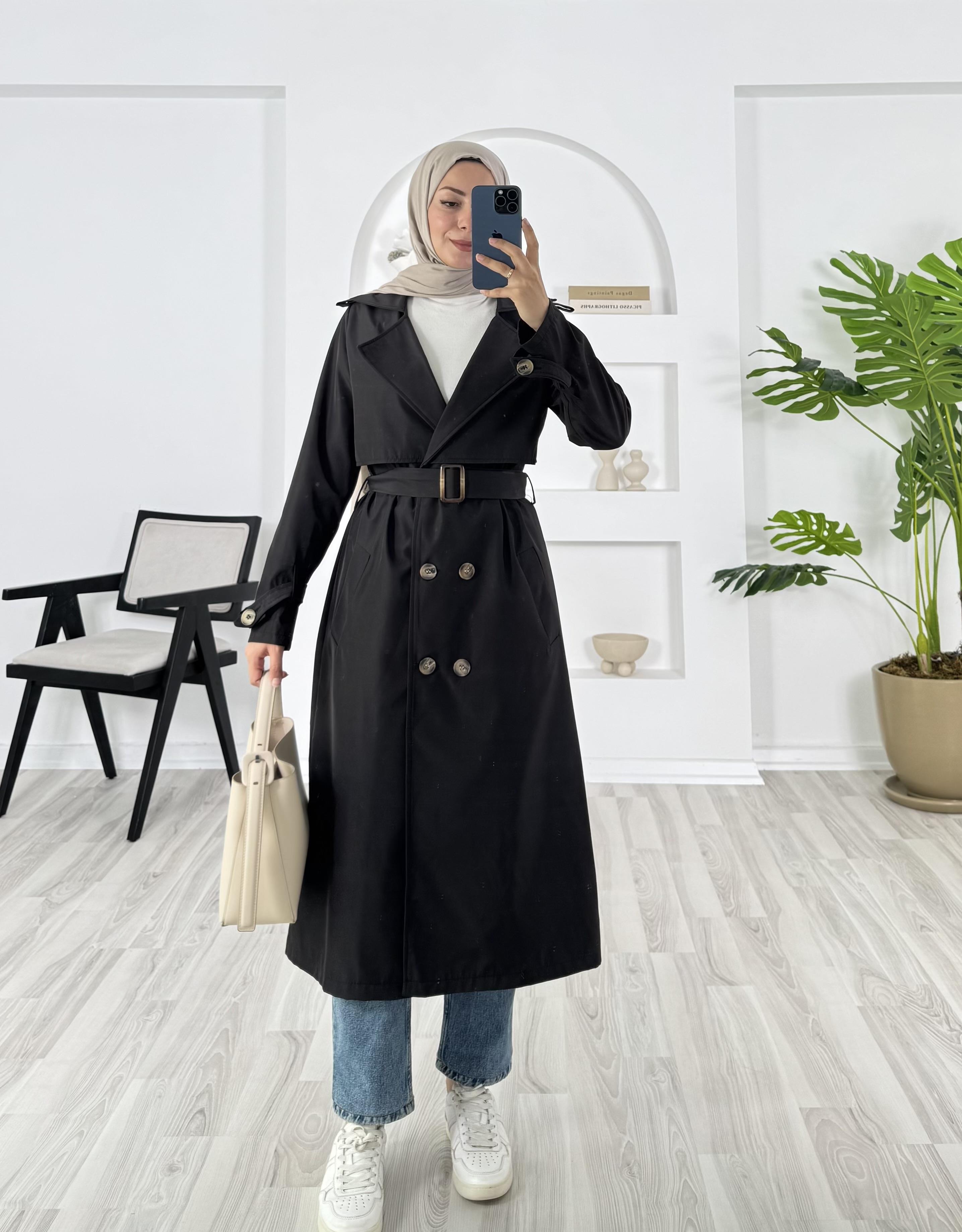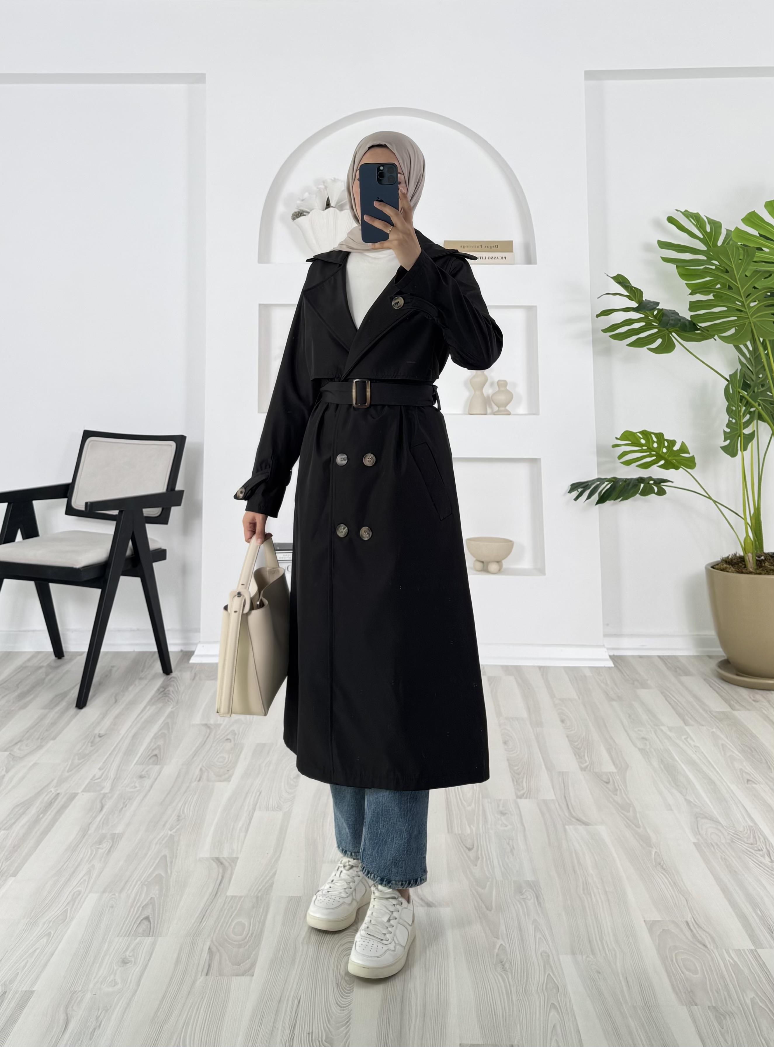 7234-bondit kumaş-omuz detaylı kemerli trenç-siyah (7234)