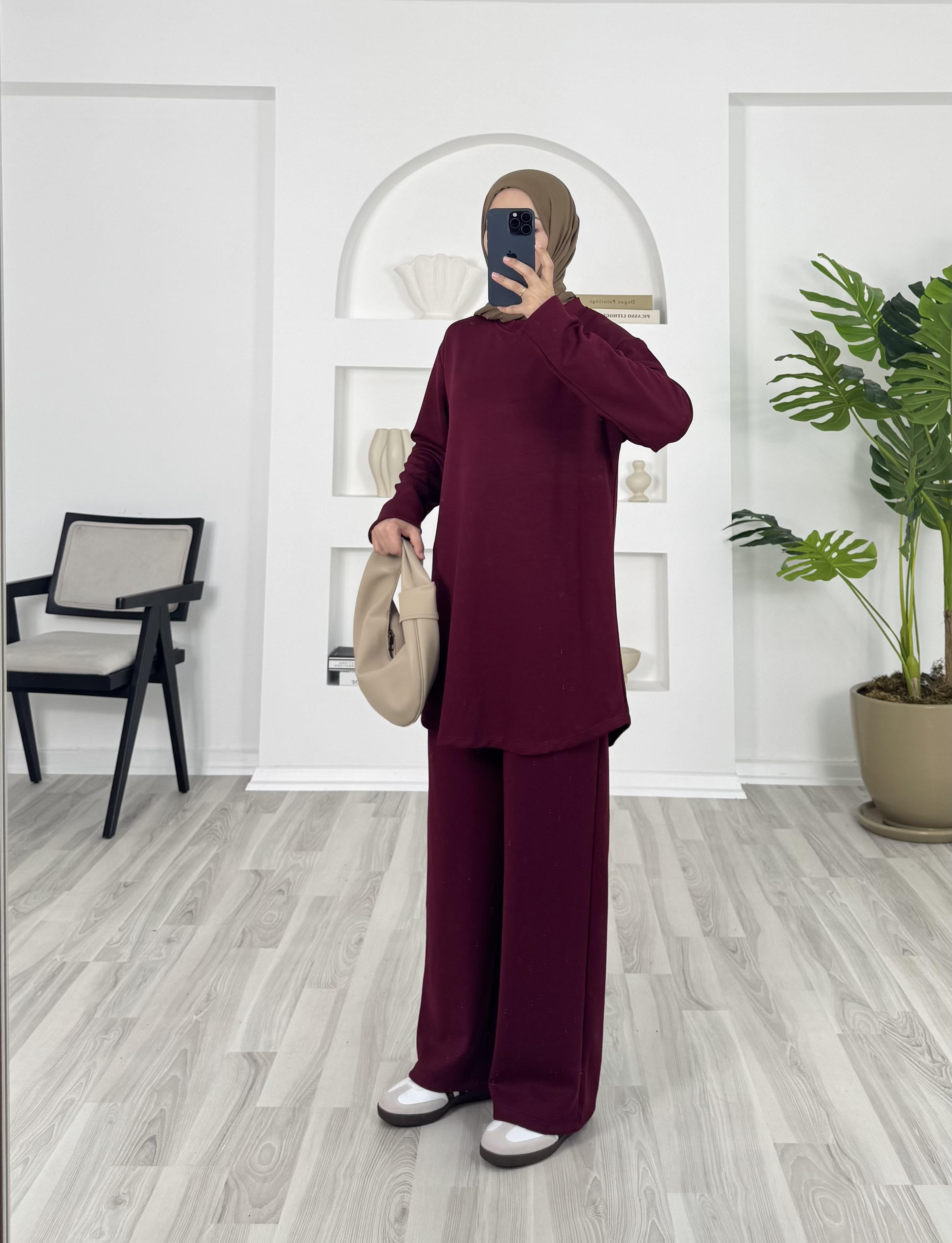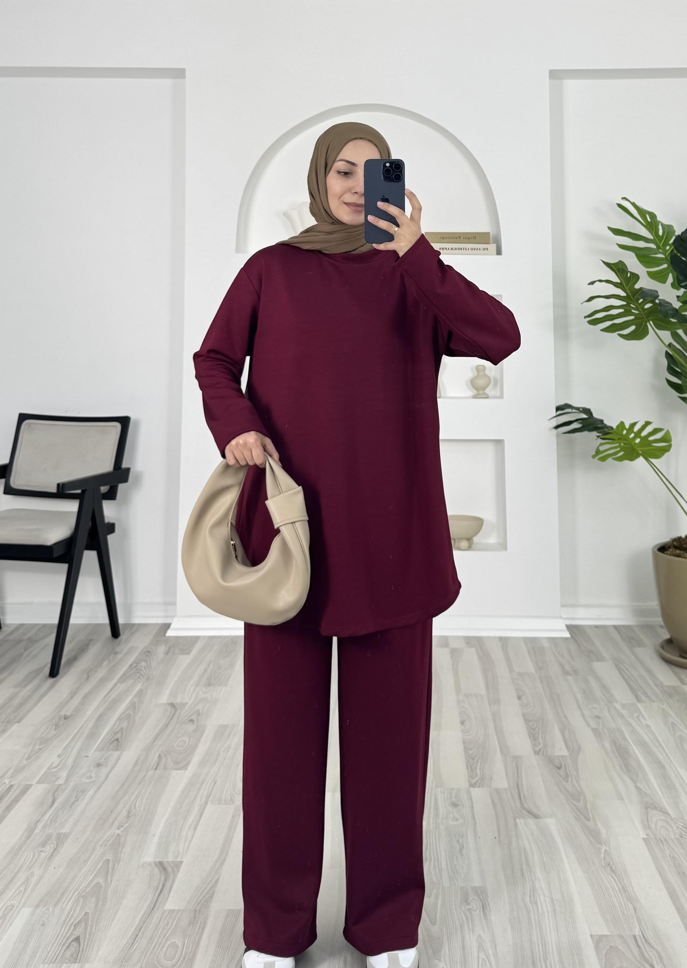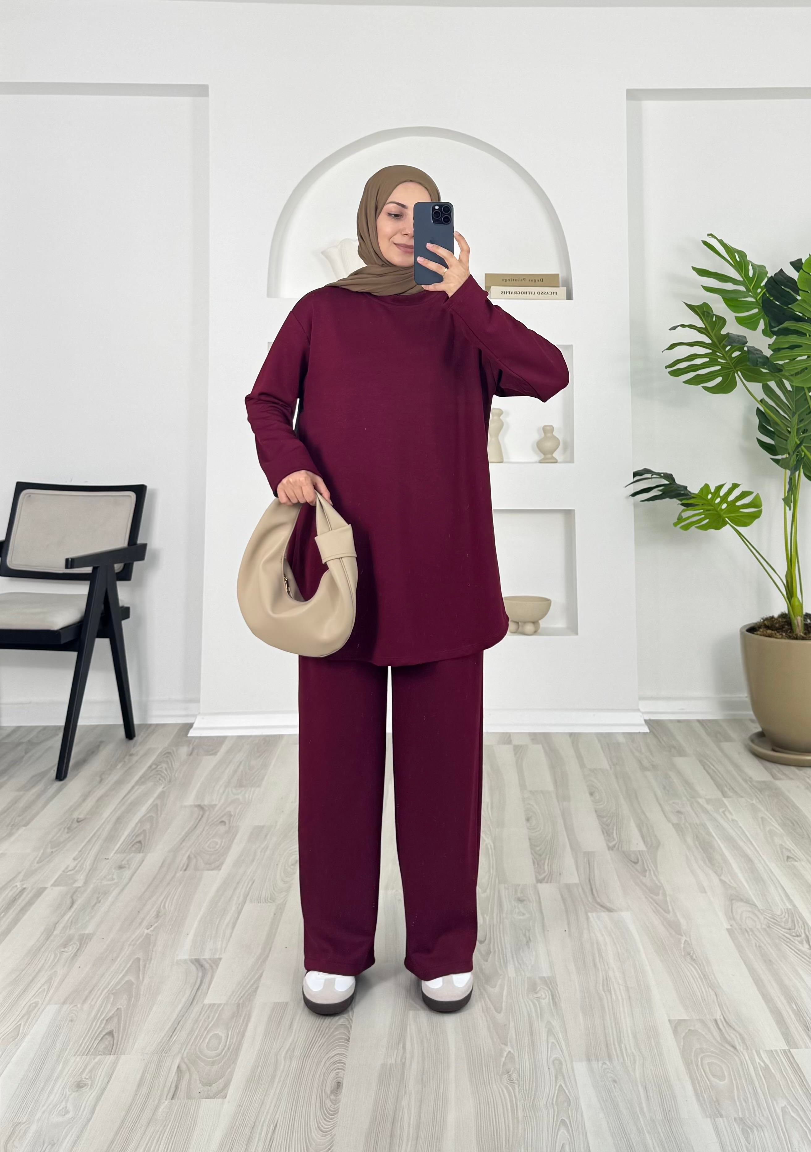 7310 - oysho kumaş bol paça pantolonlu takım - bordo (7310)