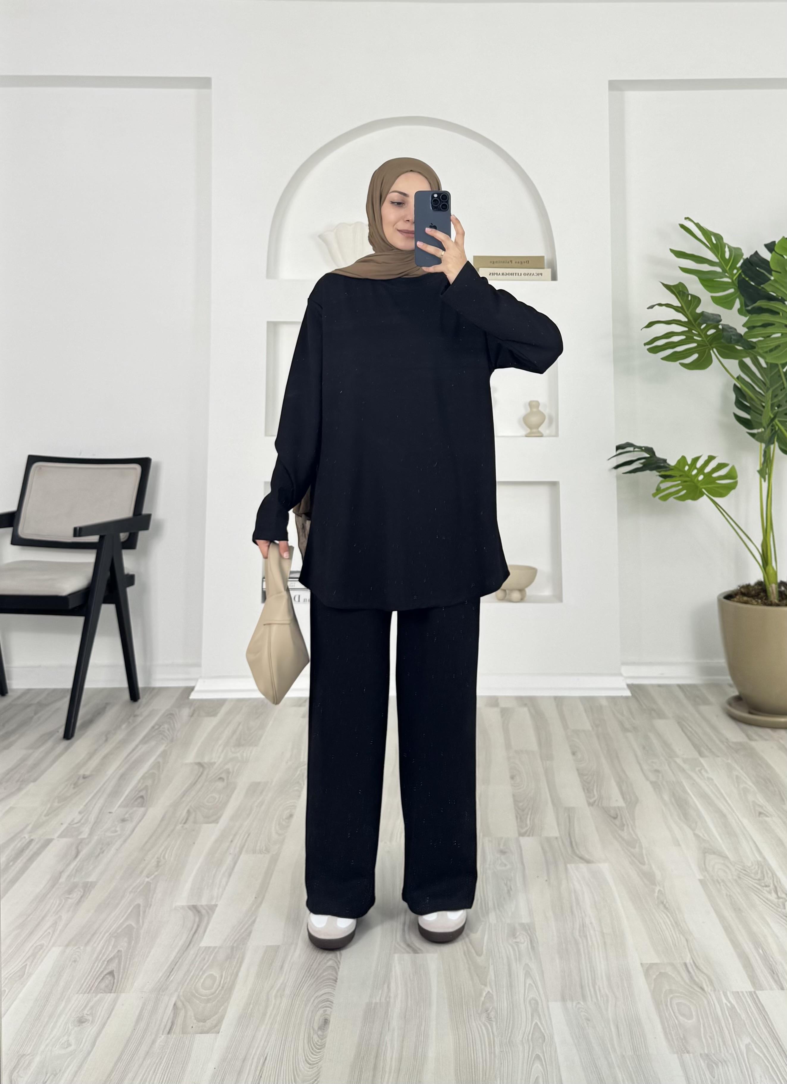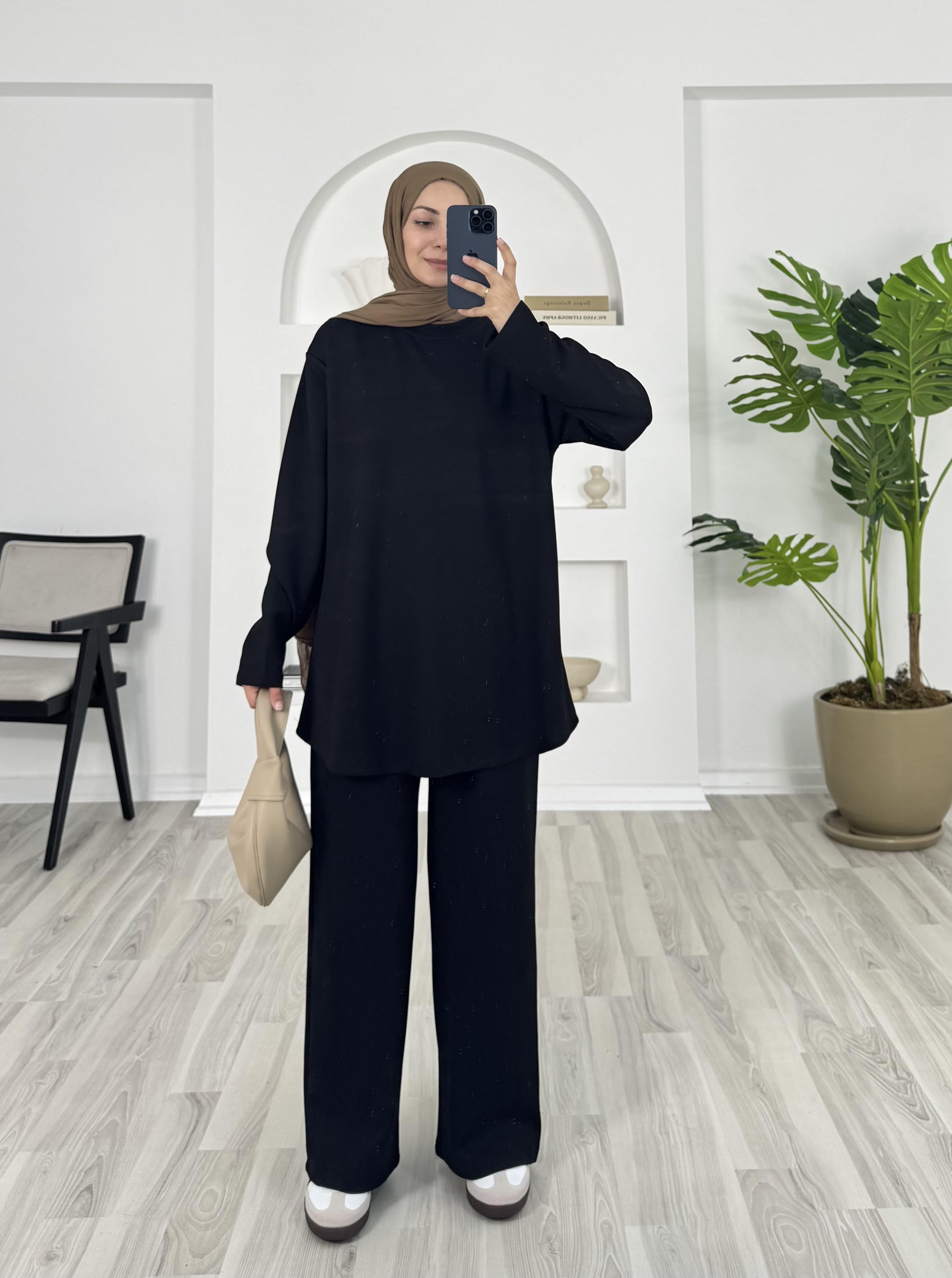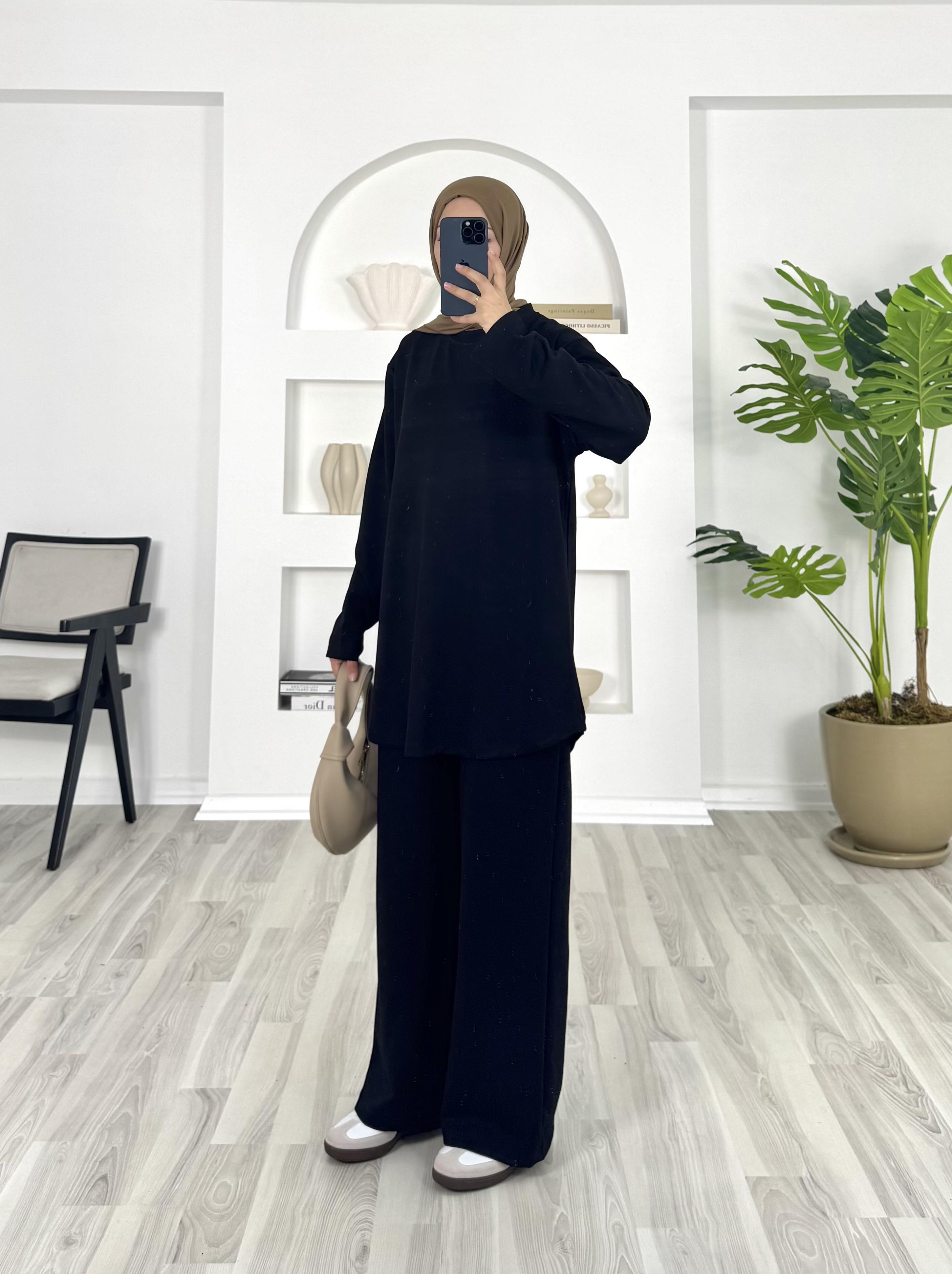 7310 - oysho kumaş bol paça pantolonlu takım - siyah (7310)