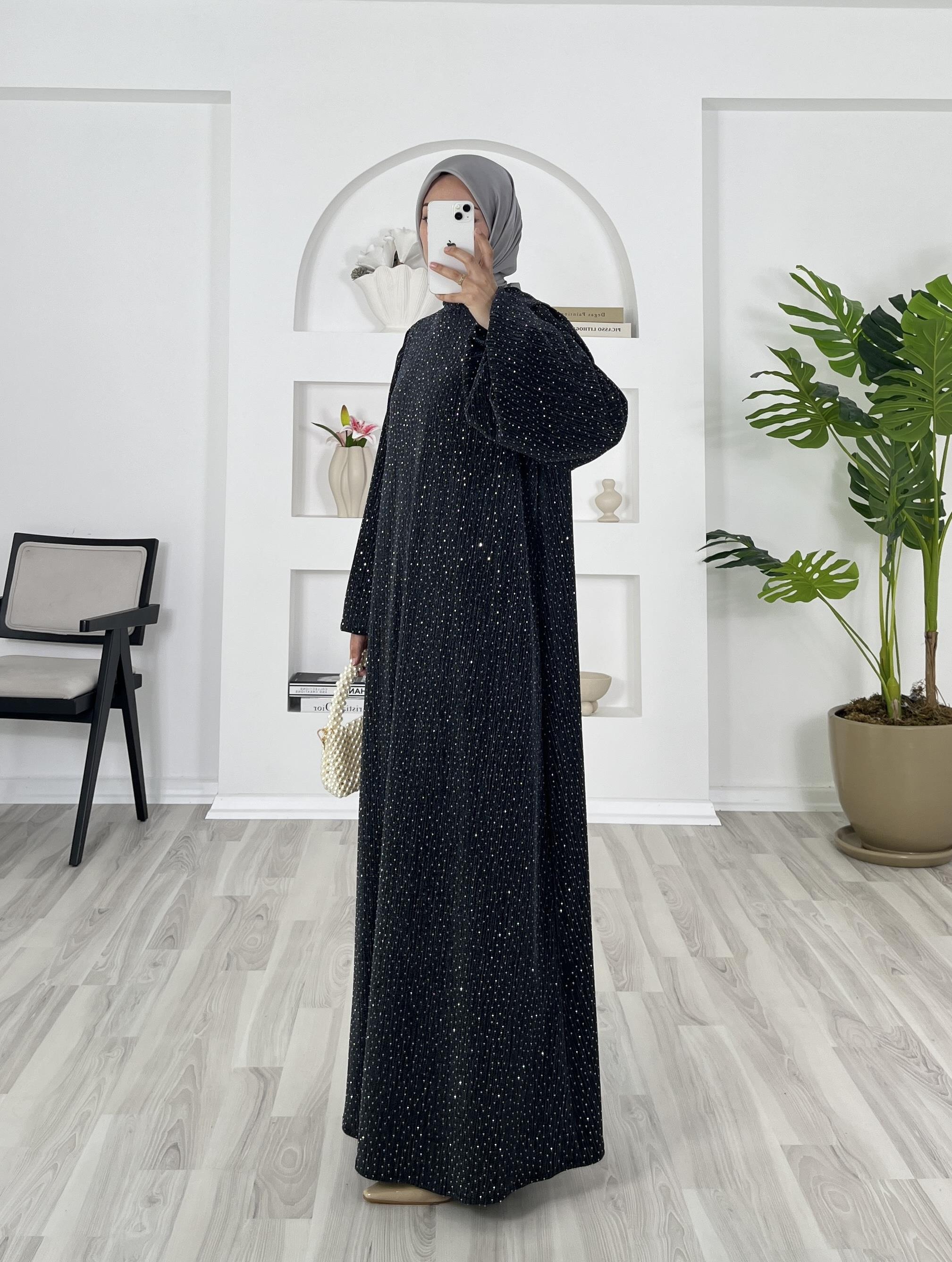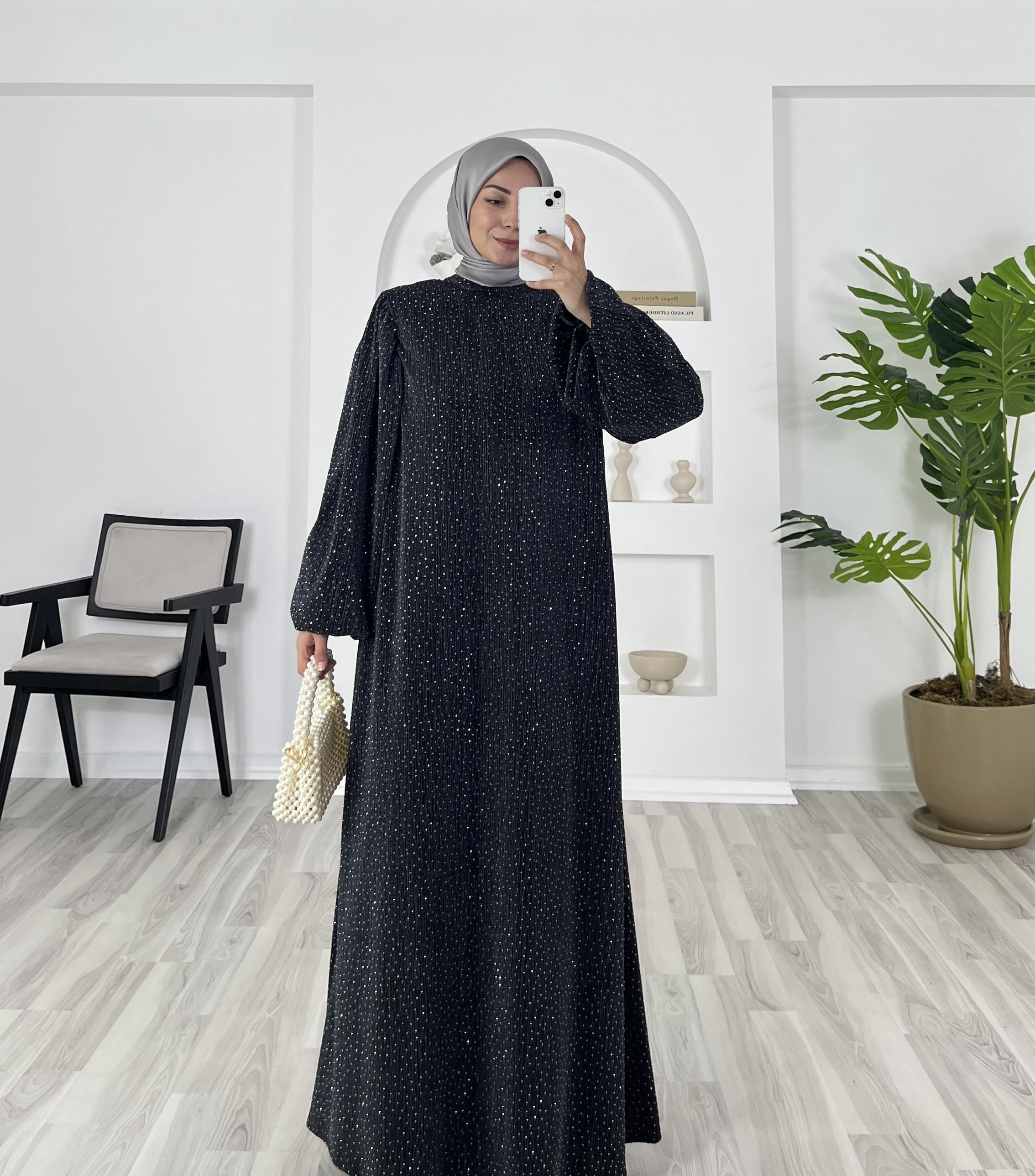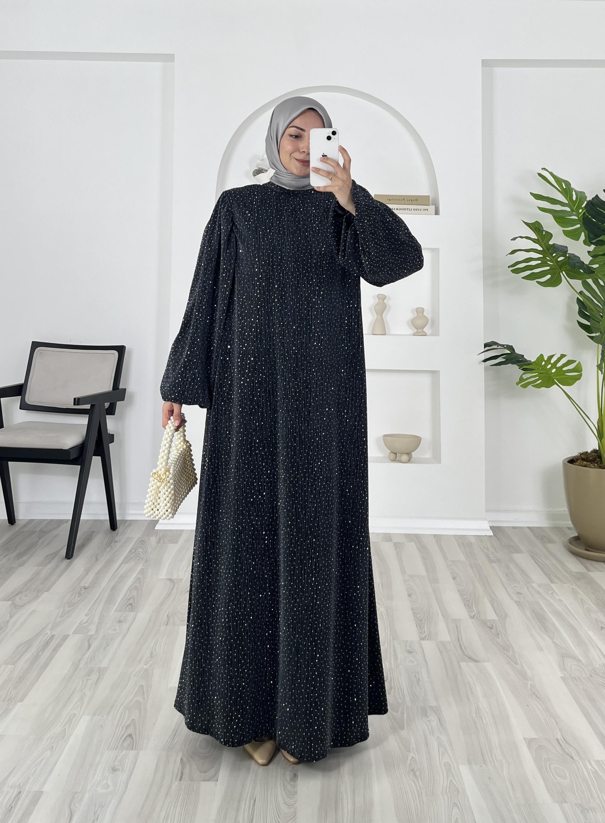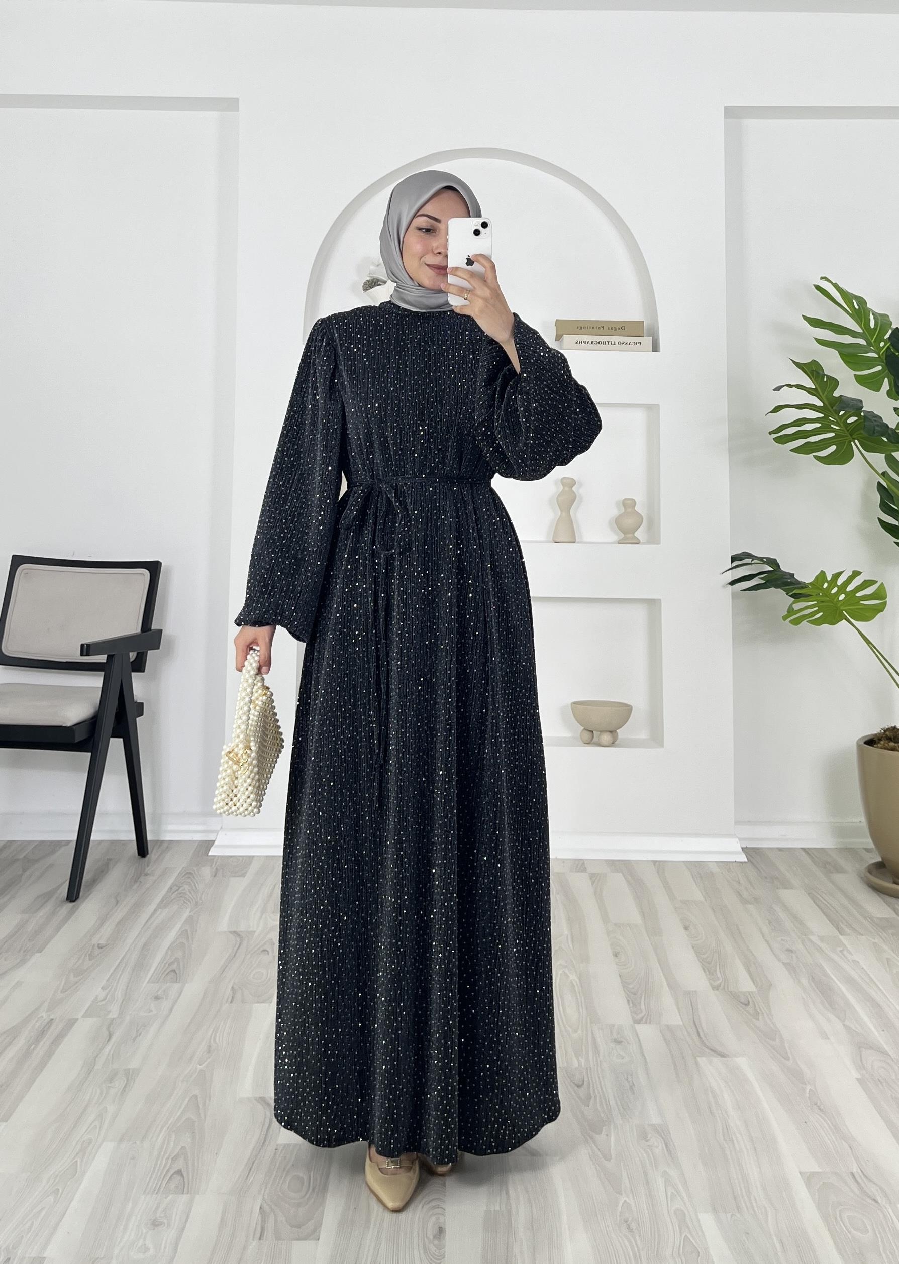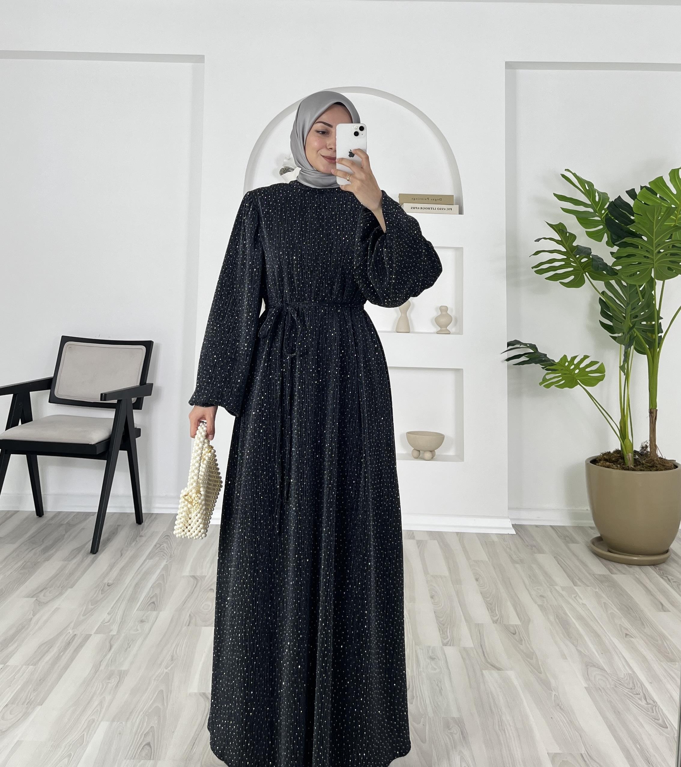 7315 -örme nobel kumaş balon kol hakim yaka kuşaklı taşlı elbise - gri (7315)