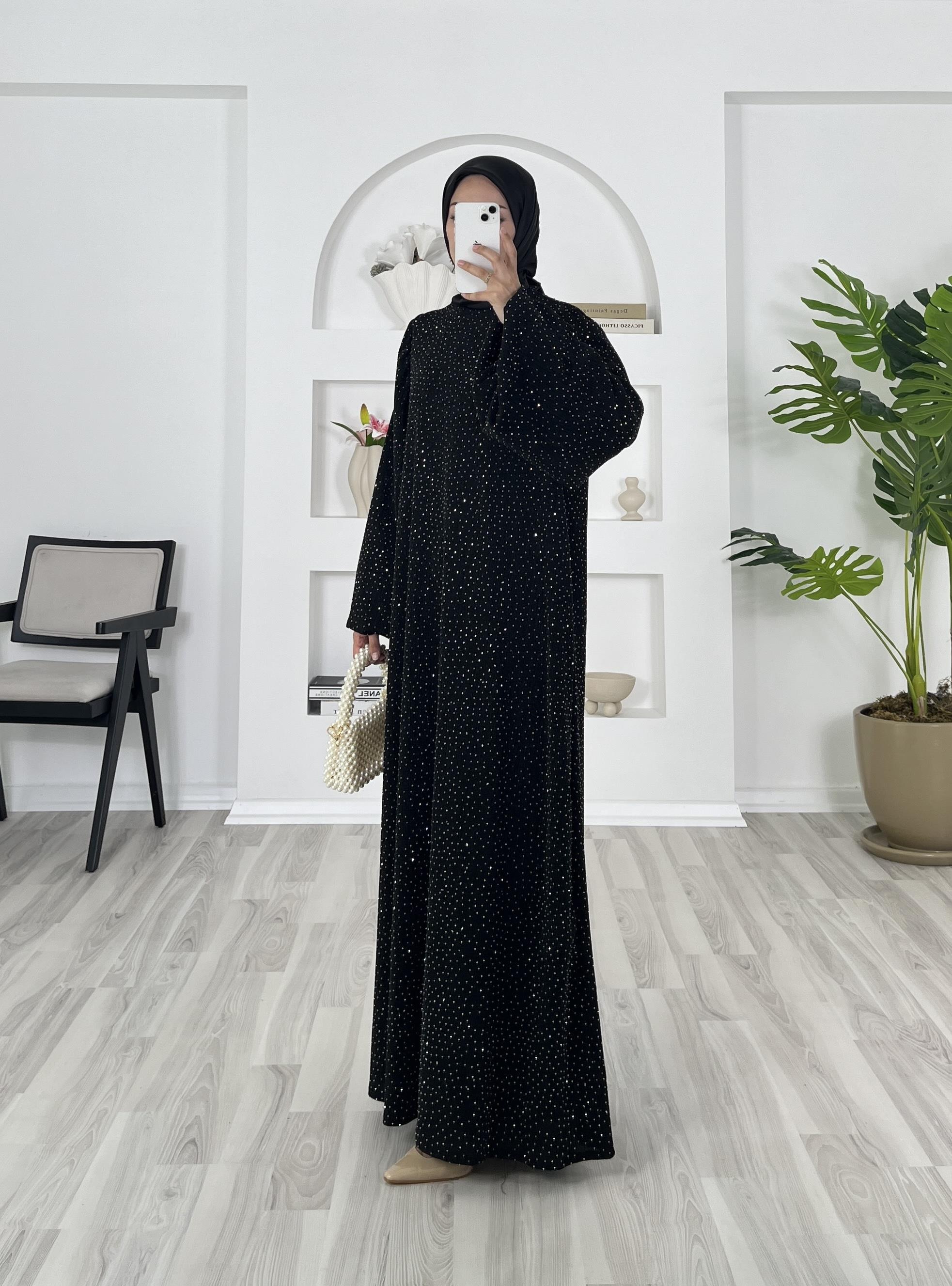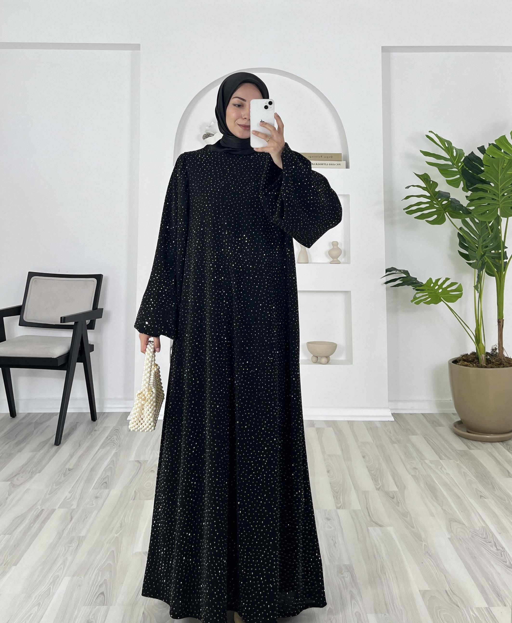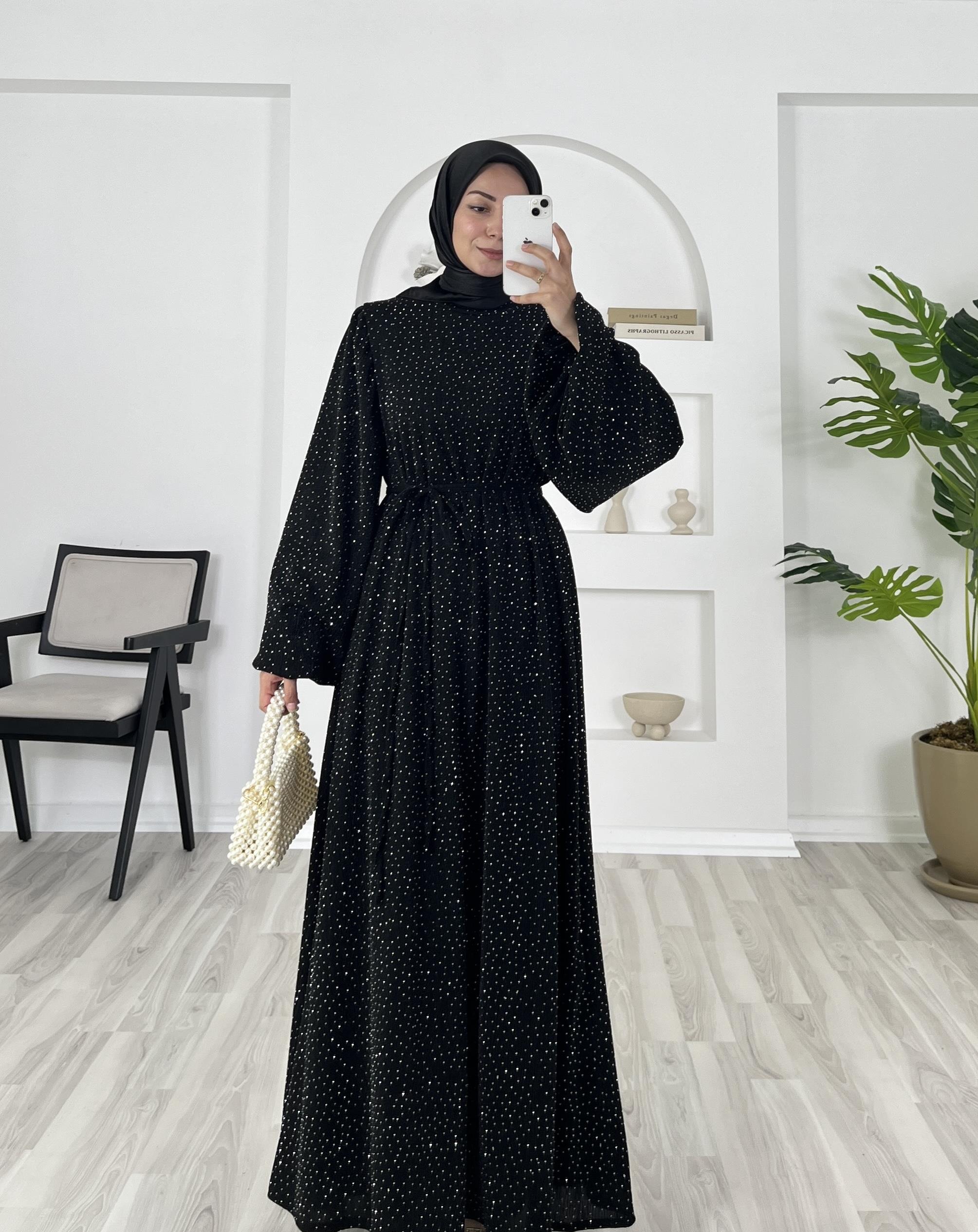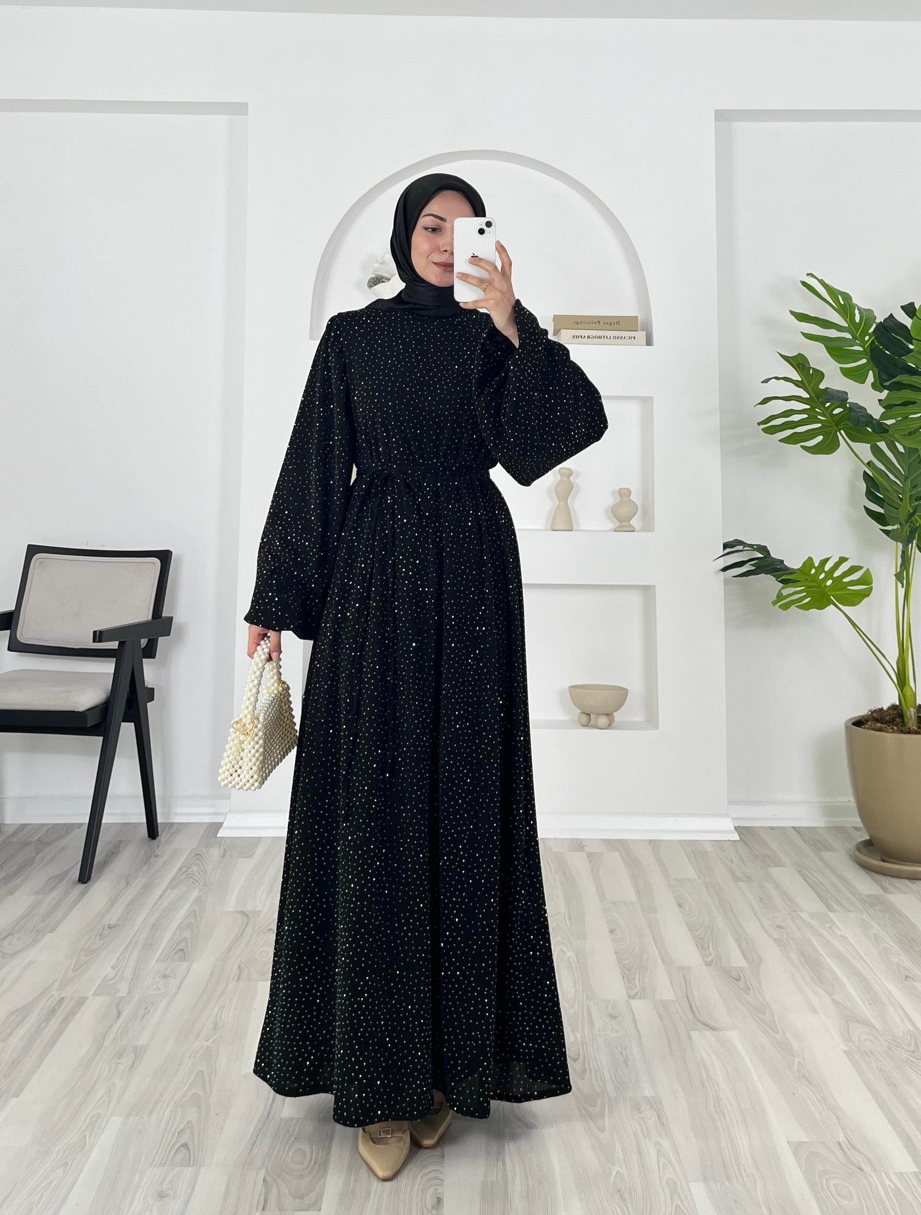 7315 -örme nobel kumaş balon kol hakim yaka kuşaklı taşlı elbise - siyah (7315)