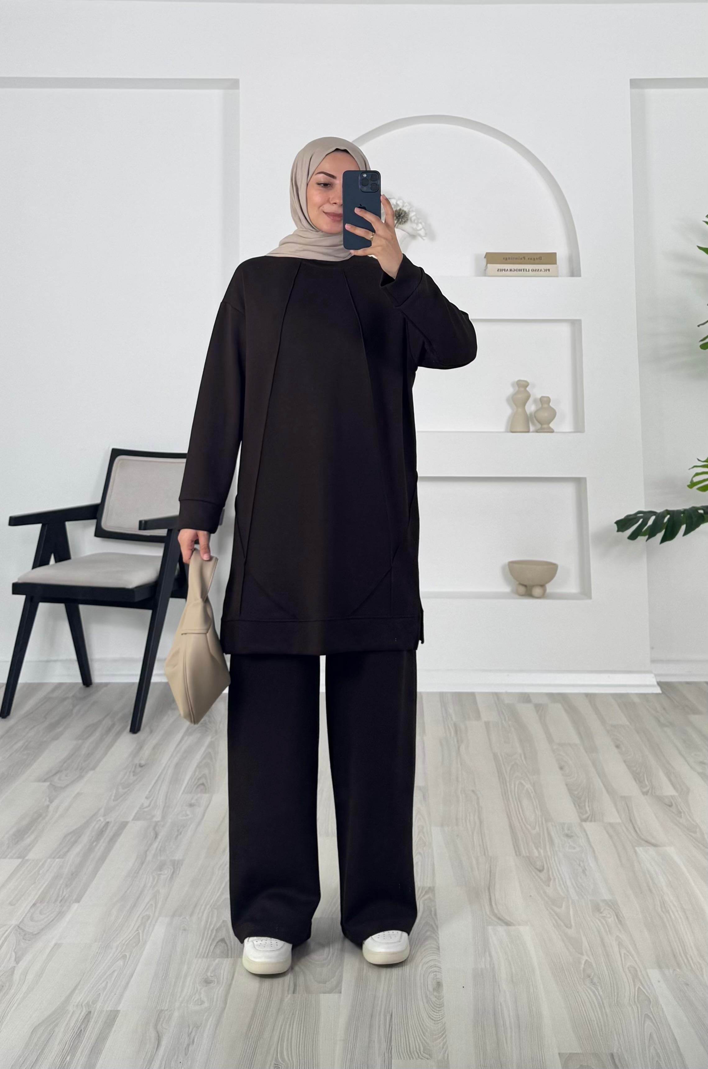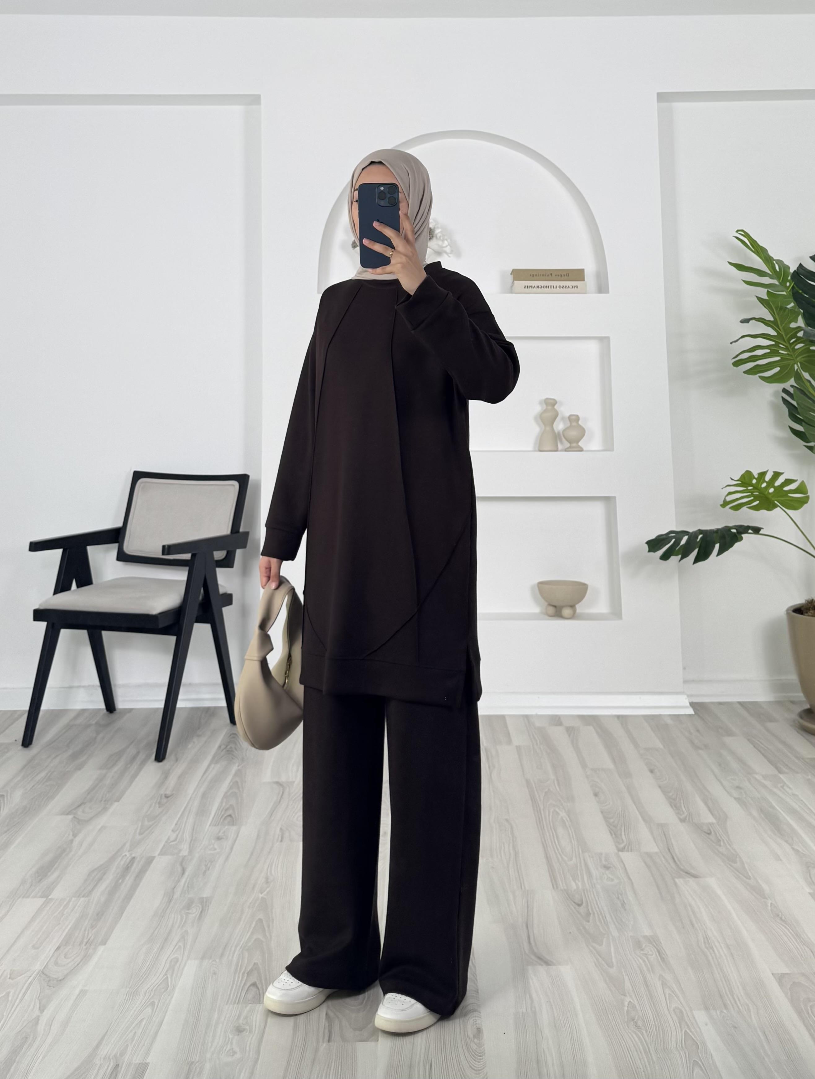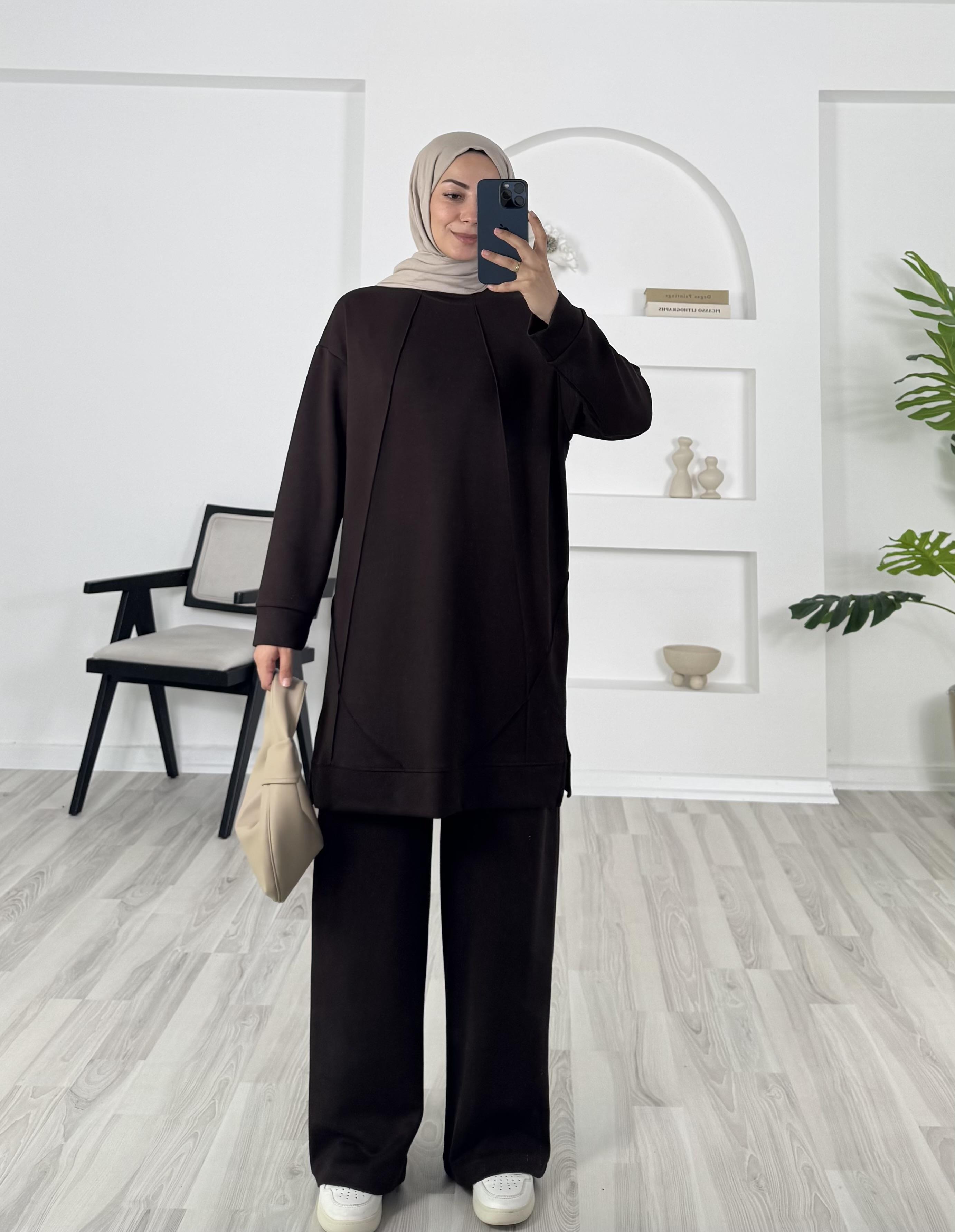 7321 -oysho kumaş önü çımalı bol paça pantolonlu takım - acı kahve (7321)