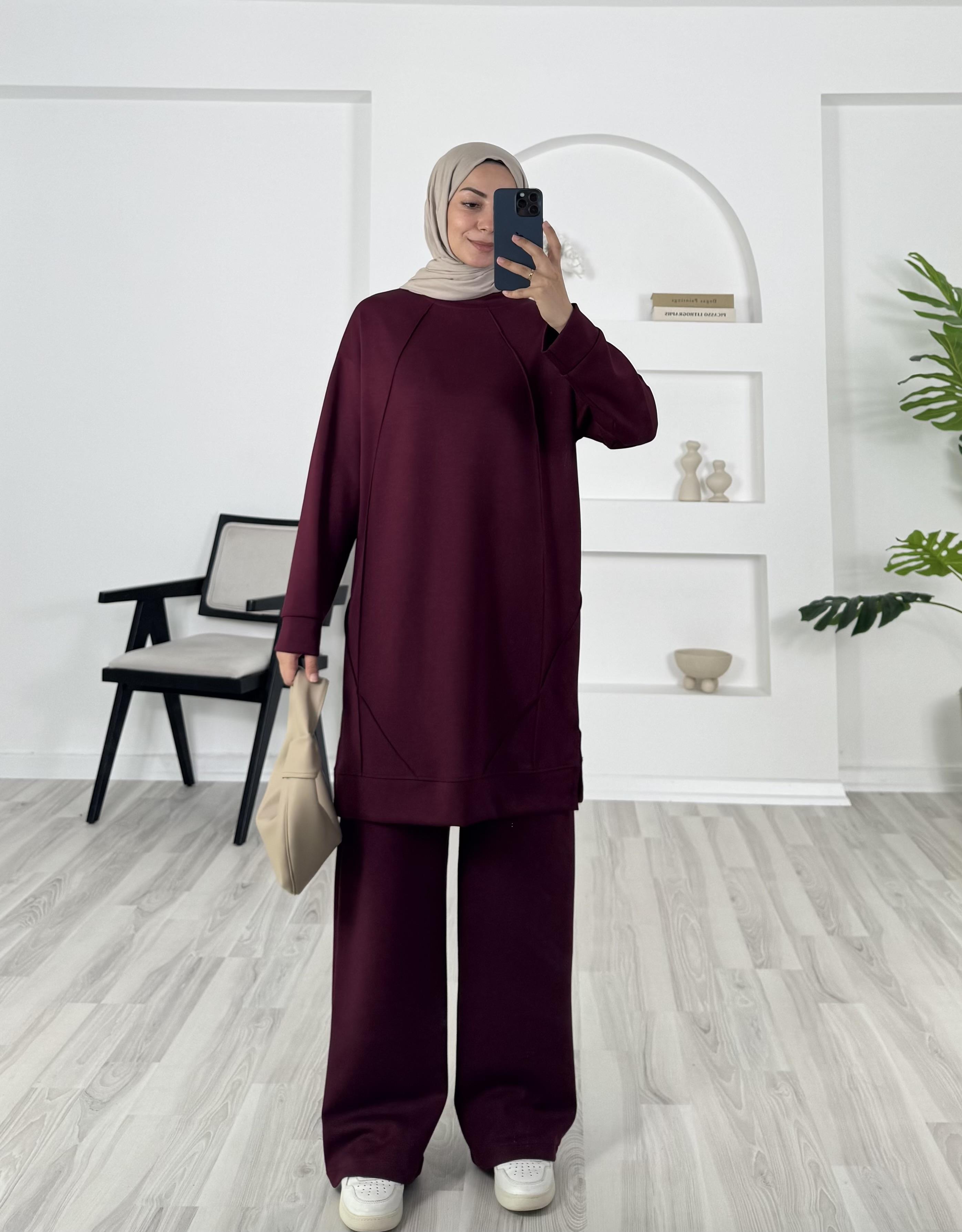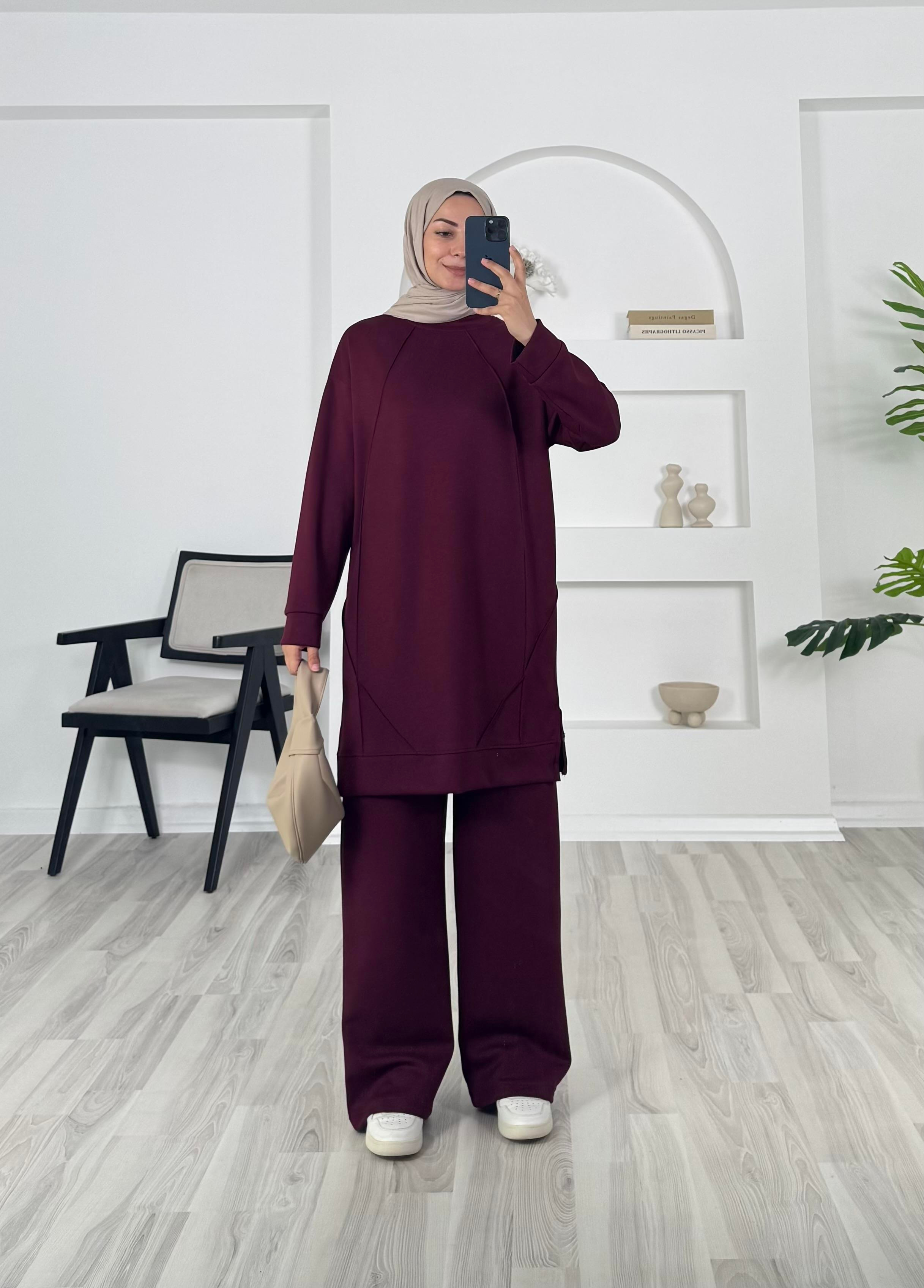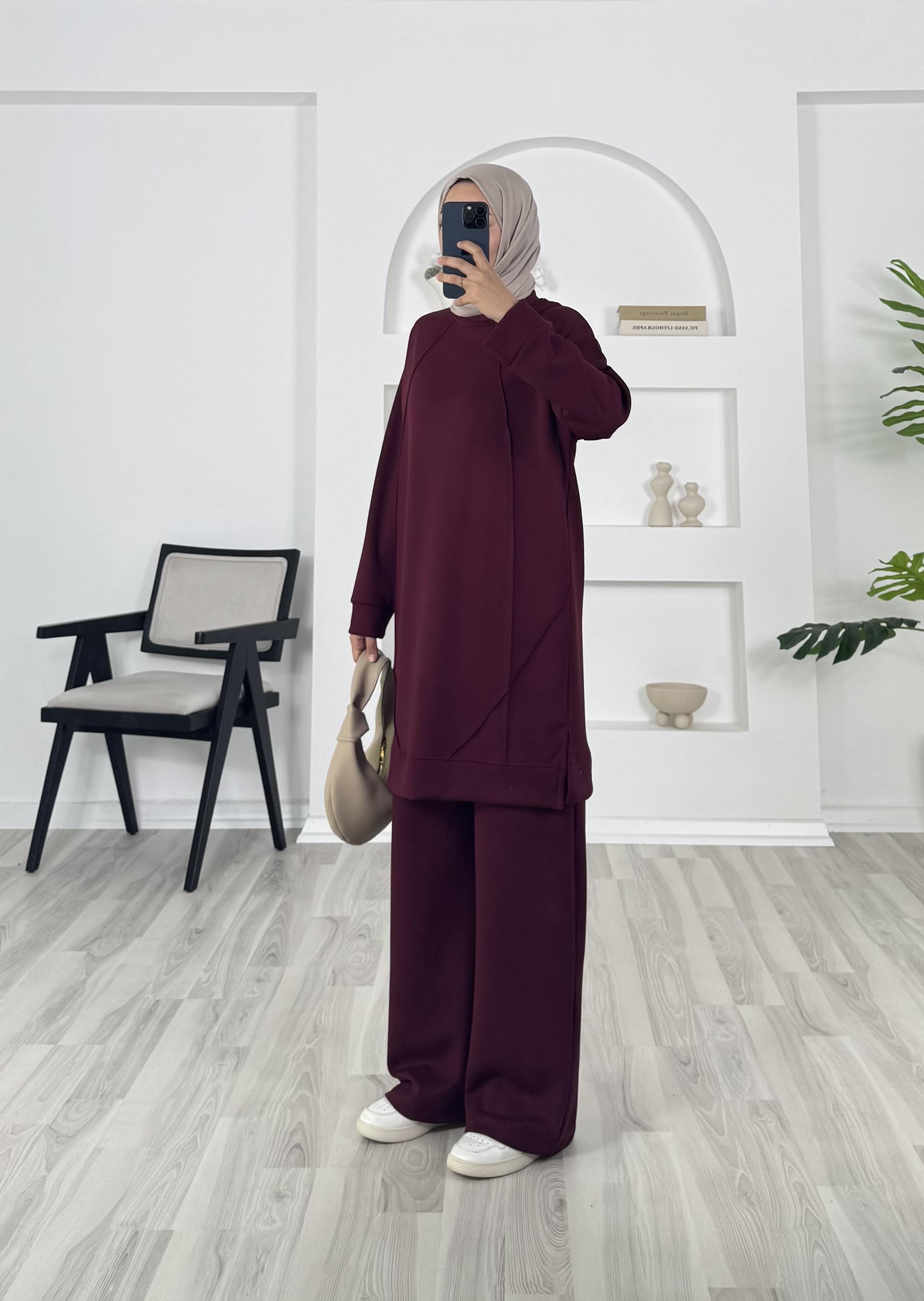 7321 -oysho kumaş önü çımalı bol paça pantolonlu takım - bordo (7321)