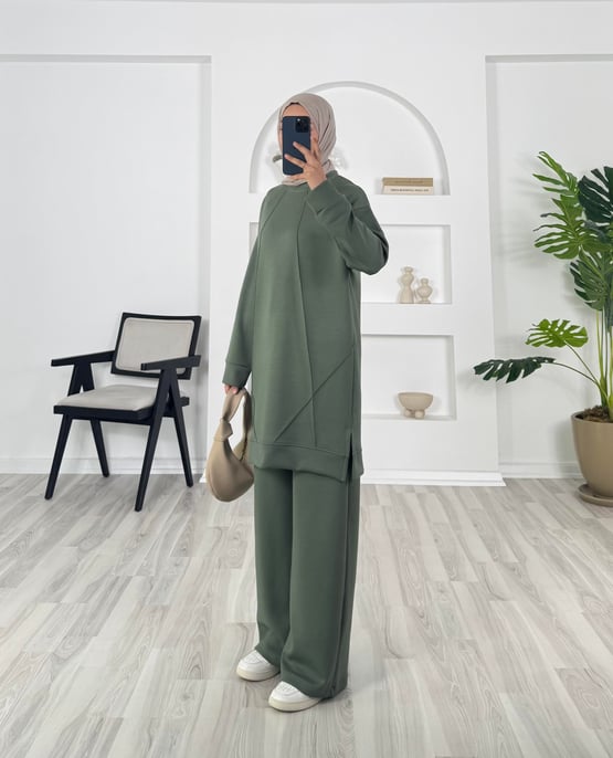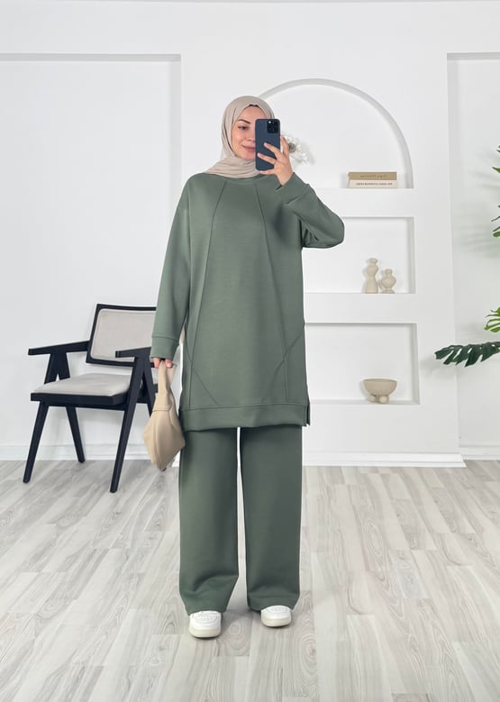 7321 -oysho kumaş önü çımalı bol paça pantolonlu takım - yeşil (7321)