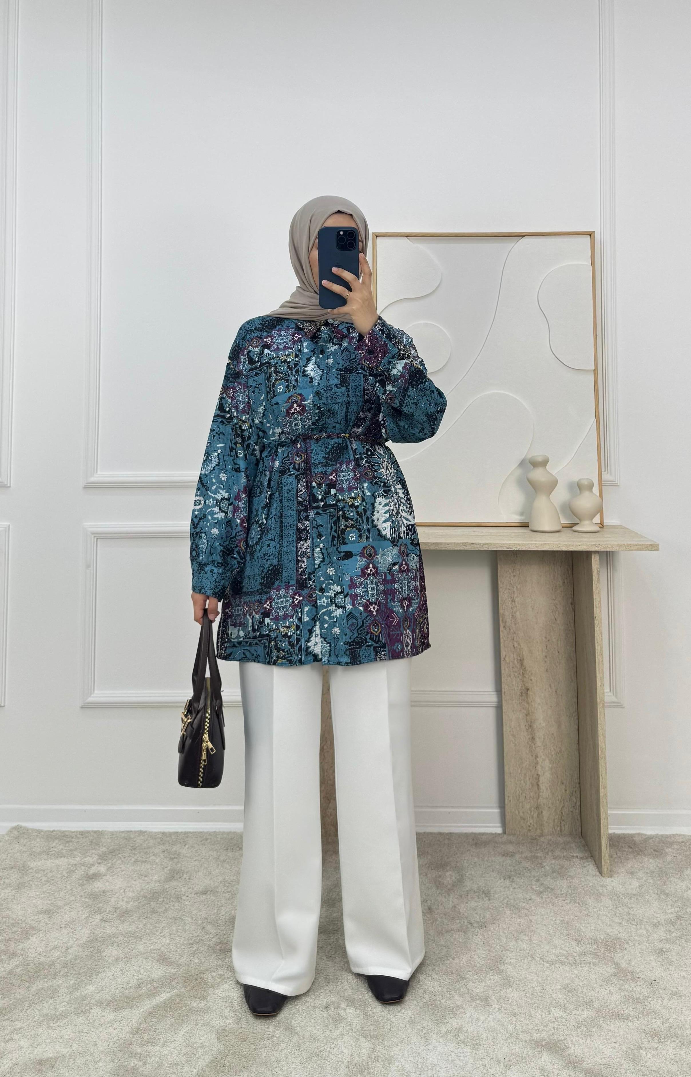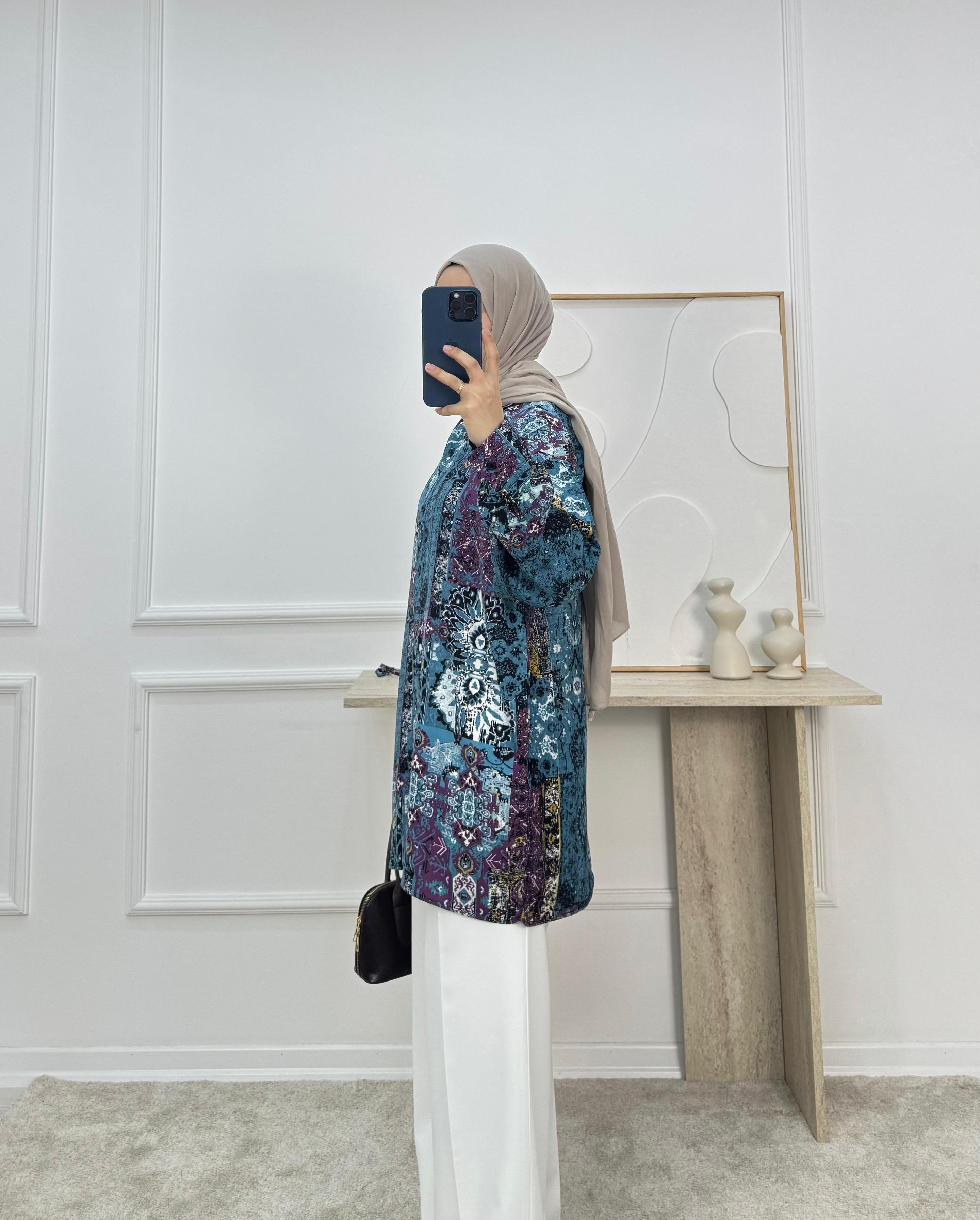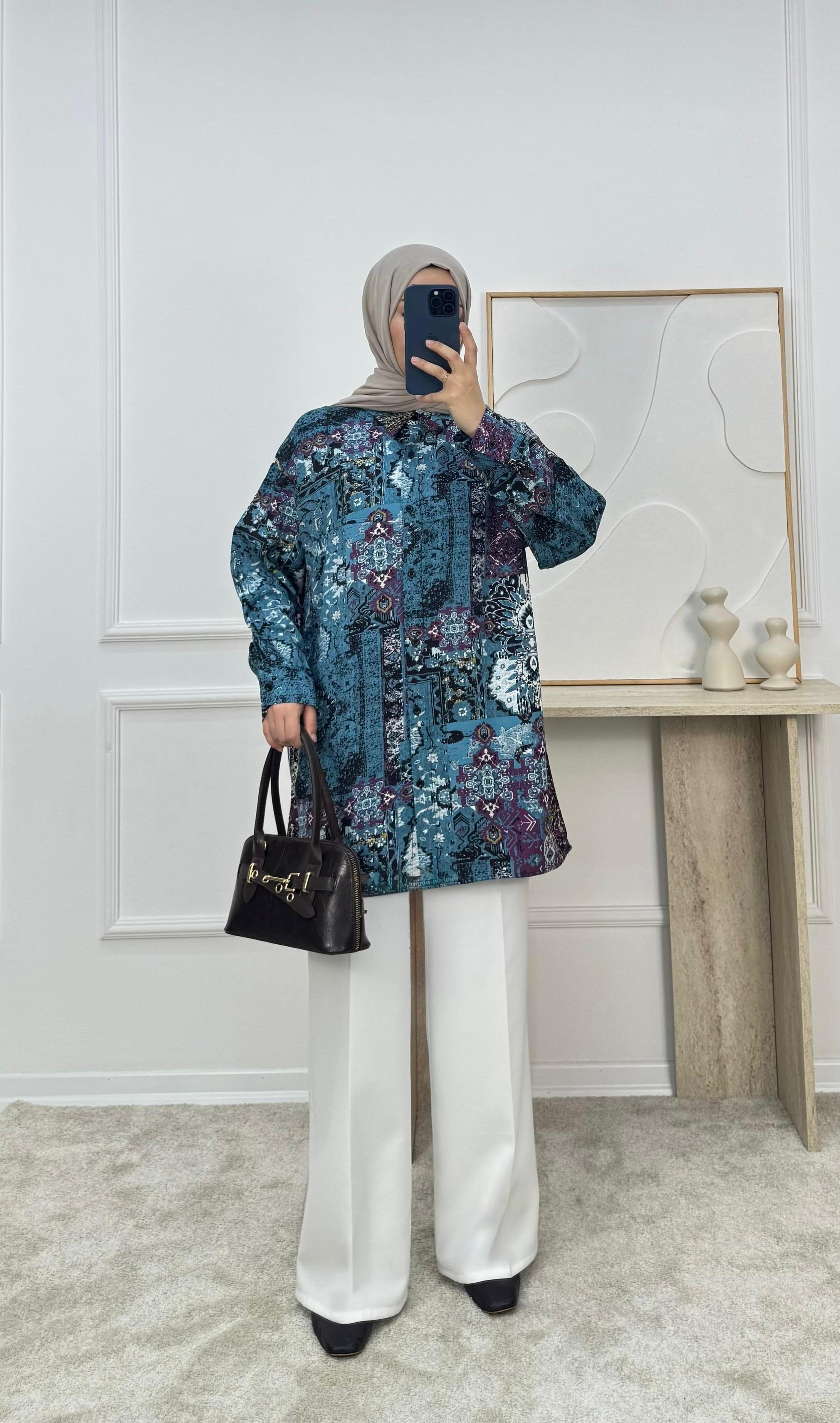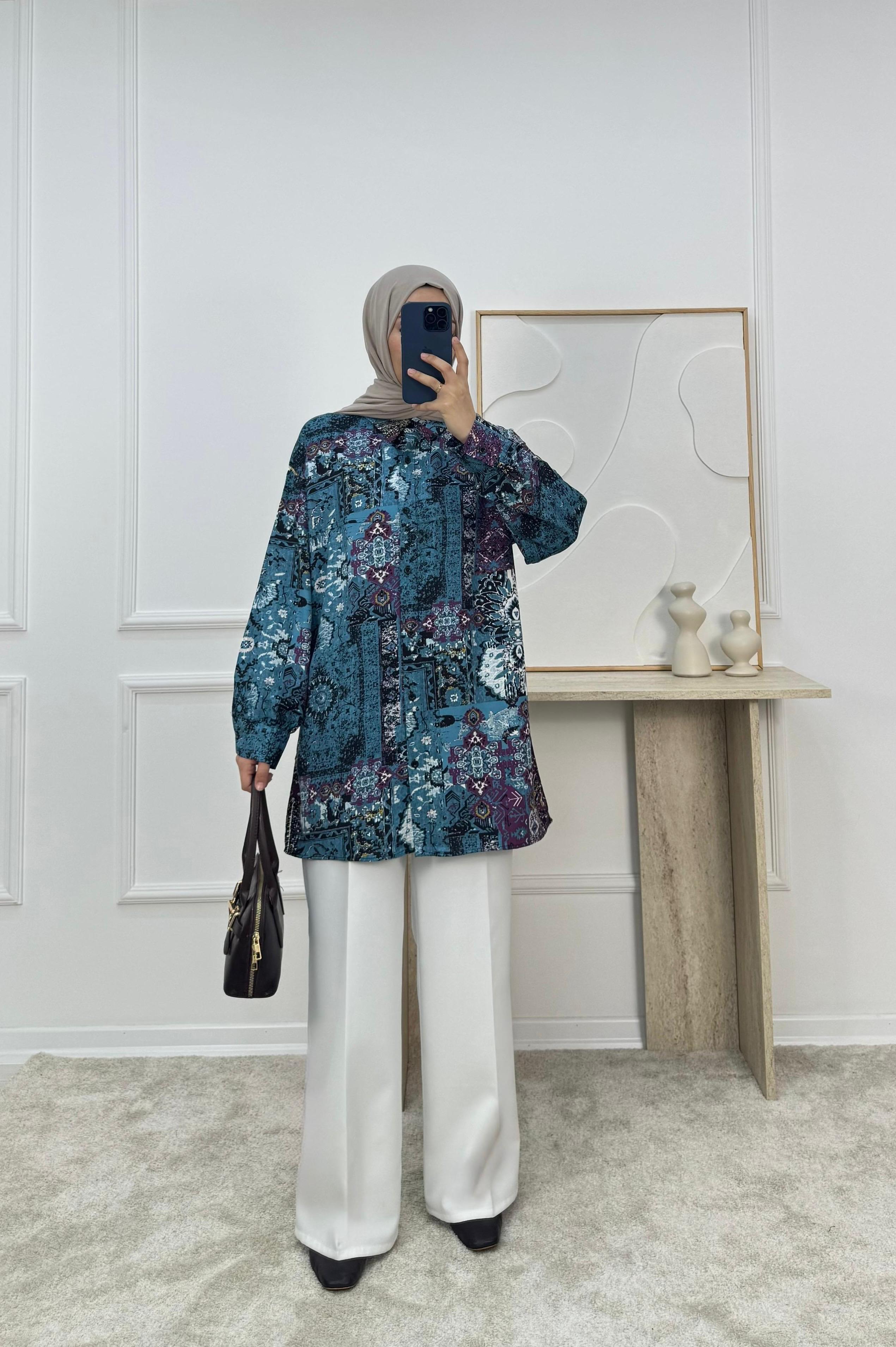 7355-viskon kumaş etnik desen tunik-mavi (7355)