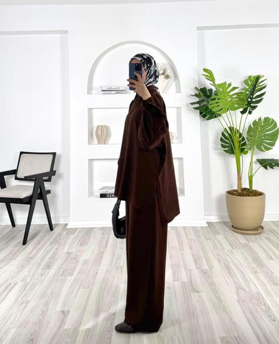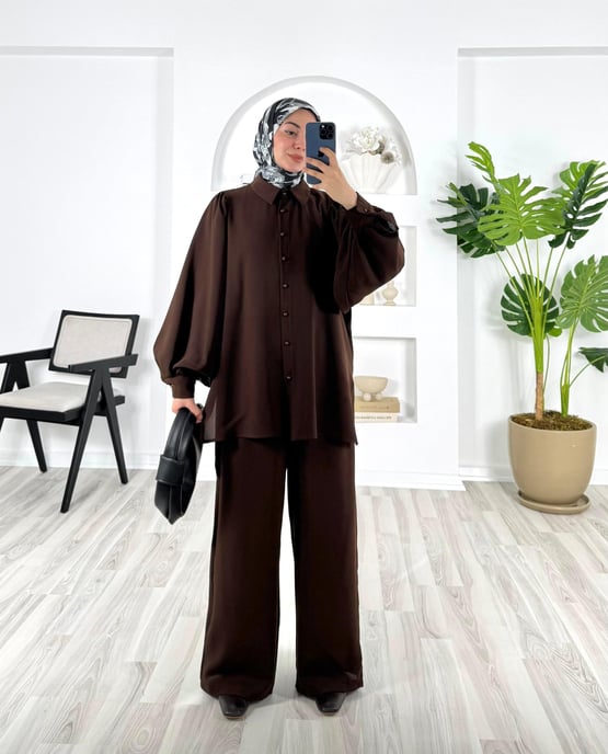 7559-asel zara kumaş-yanları yırtmaçlı pantolonlu takım-acı kahve (7559)