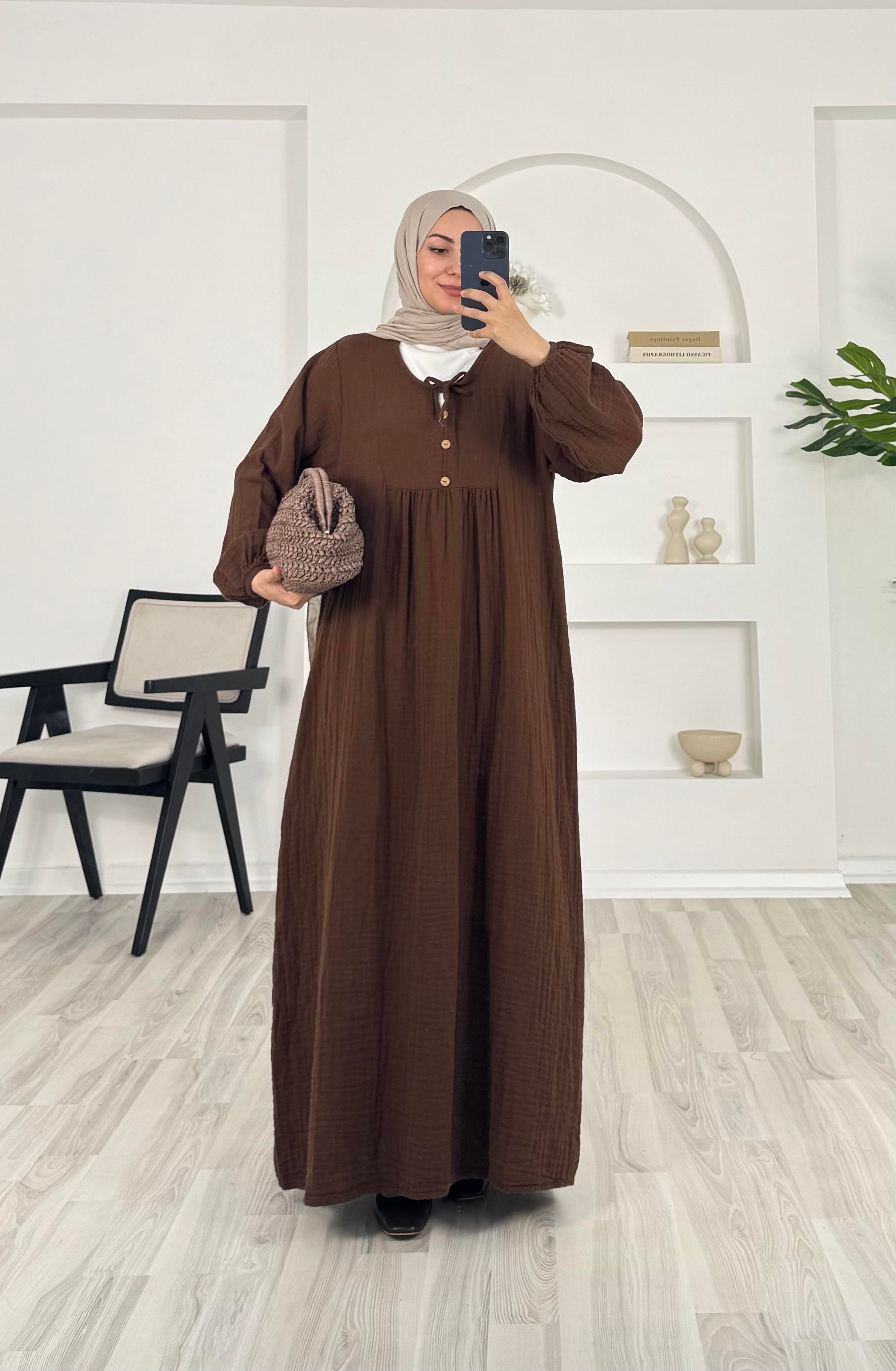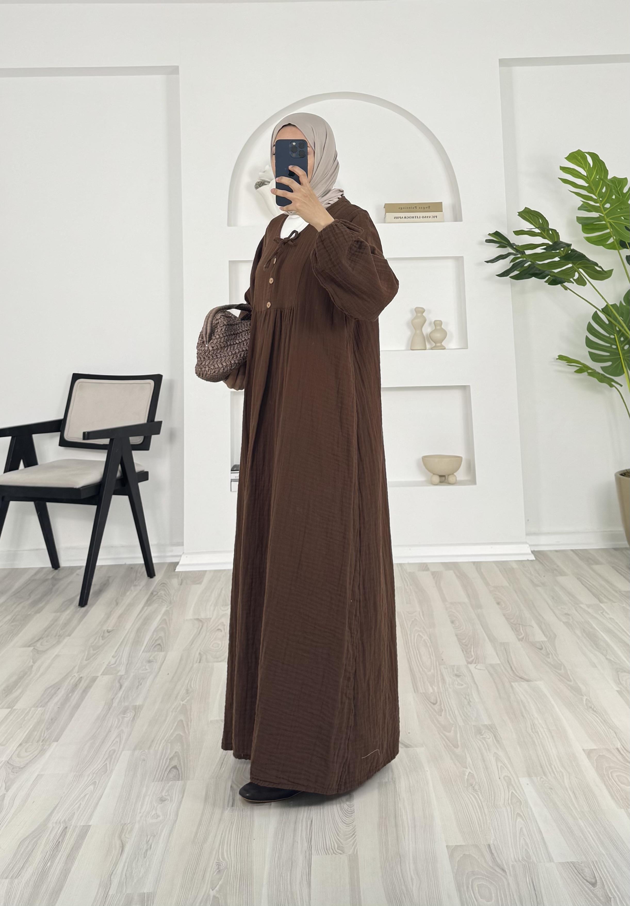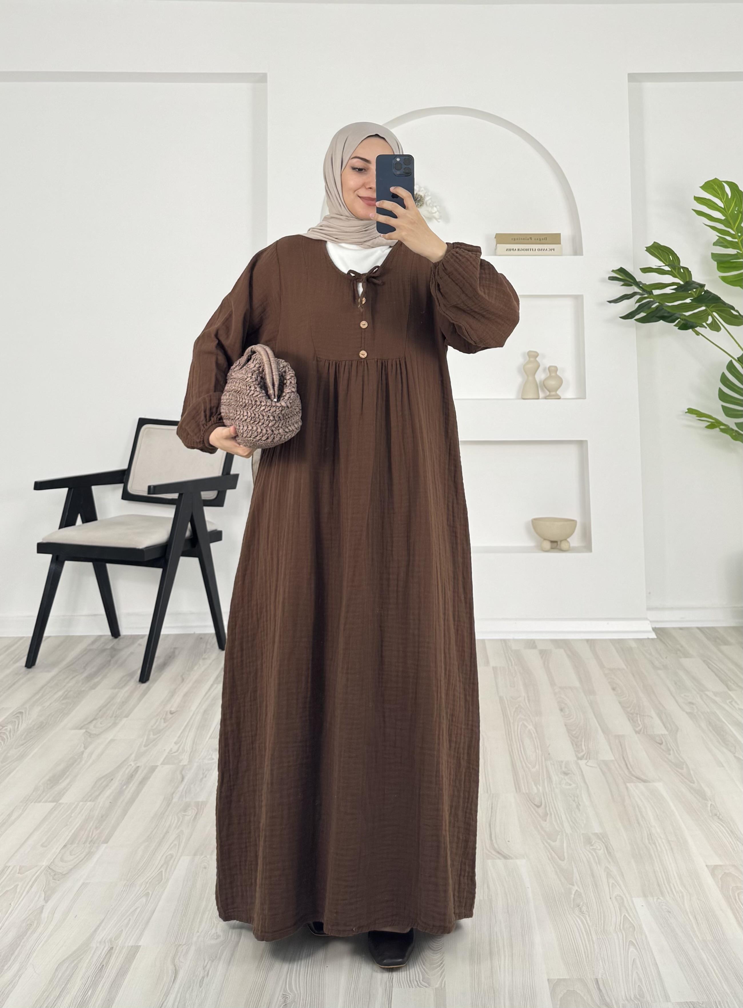 7611 - müslin kumaş önü dügmeli elbise - acı kahve (7611)