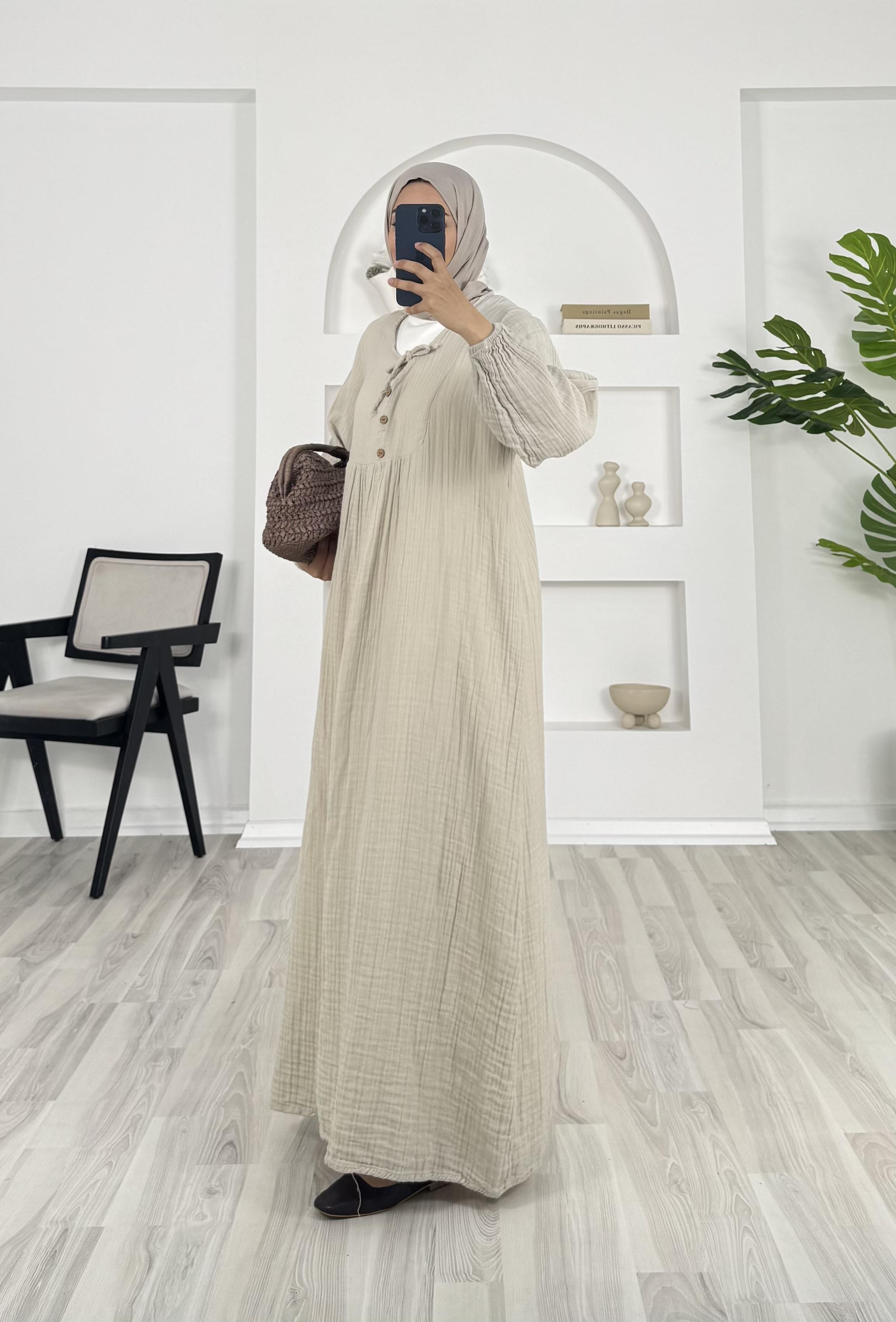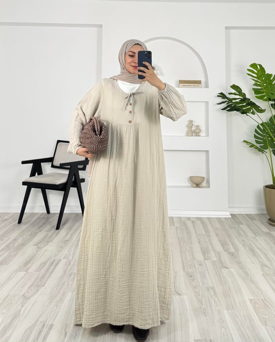 7611 - müslin kumaş önü dügmeli elbise - taş (7611)