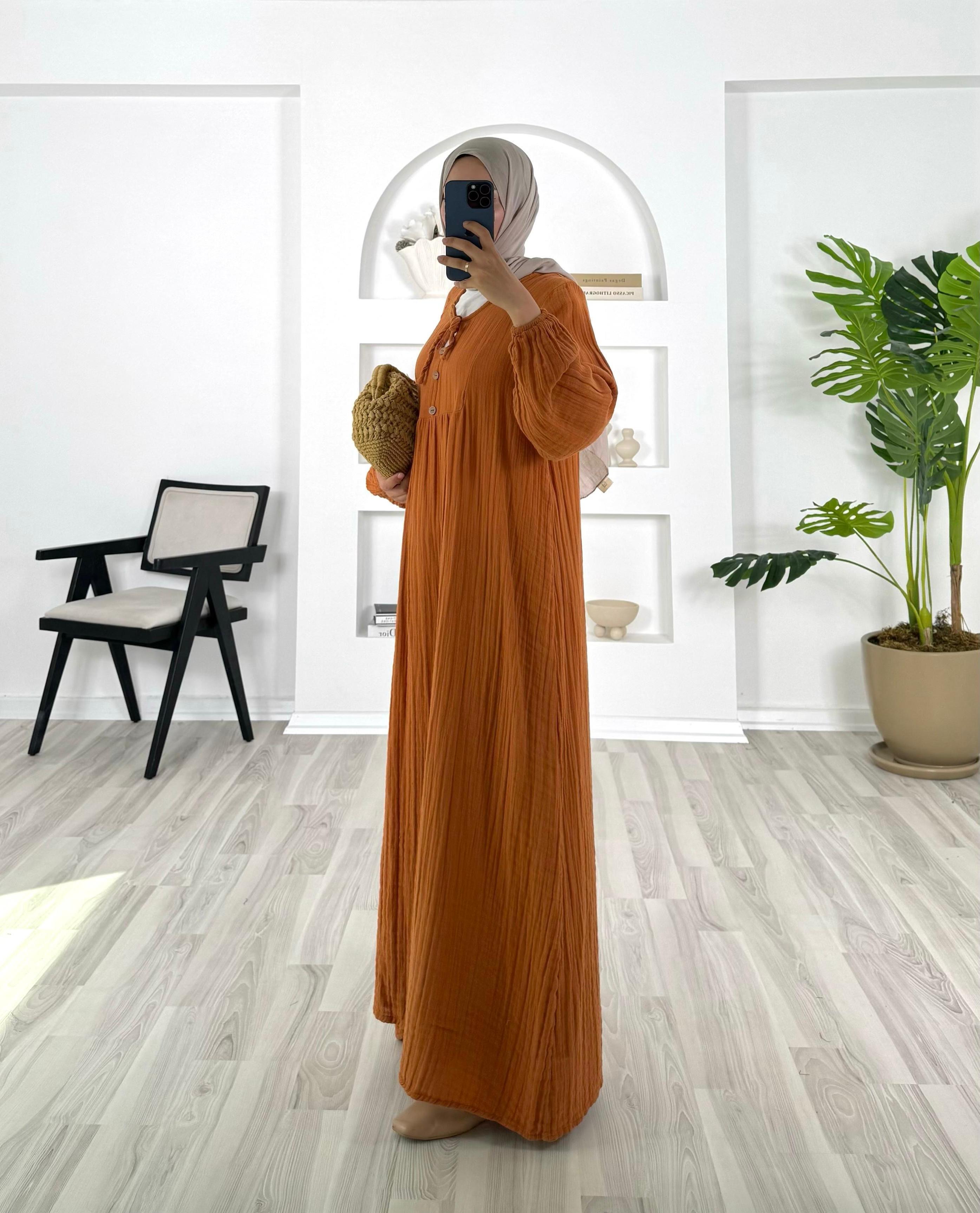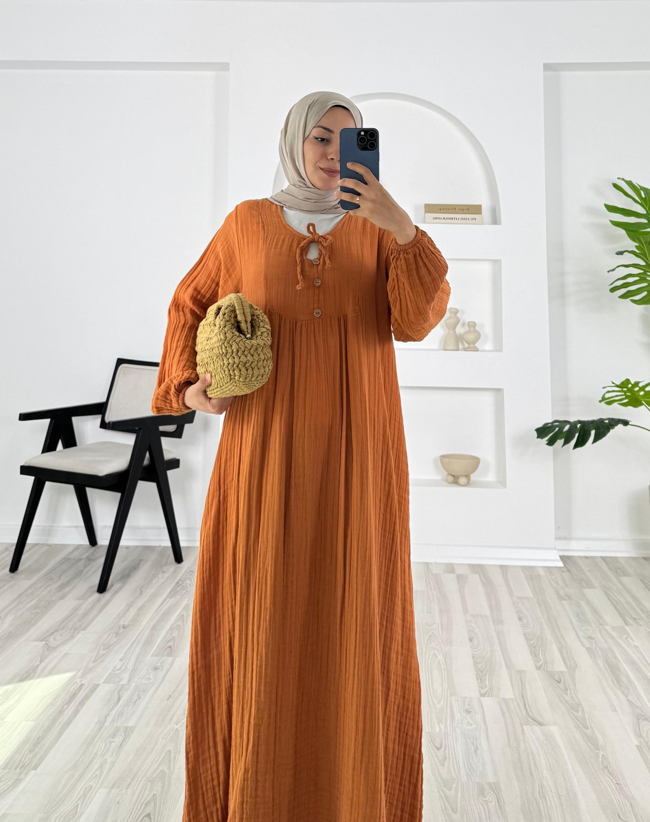 7611 - müslin kumaş önü dügmeli elbise - turuncu (7611)