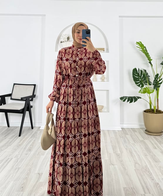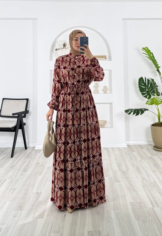 7647-pamuk viskon kumaş-beli büzülebilir elbise-bordo (7647)