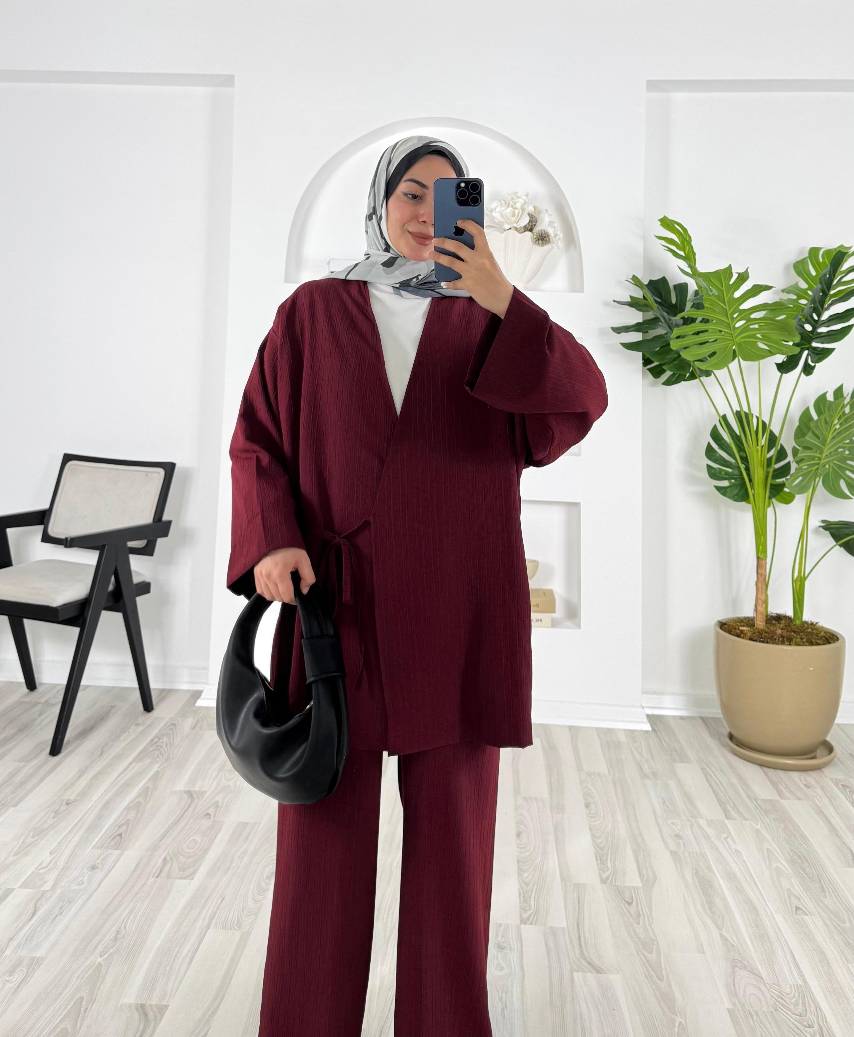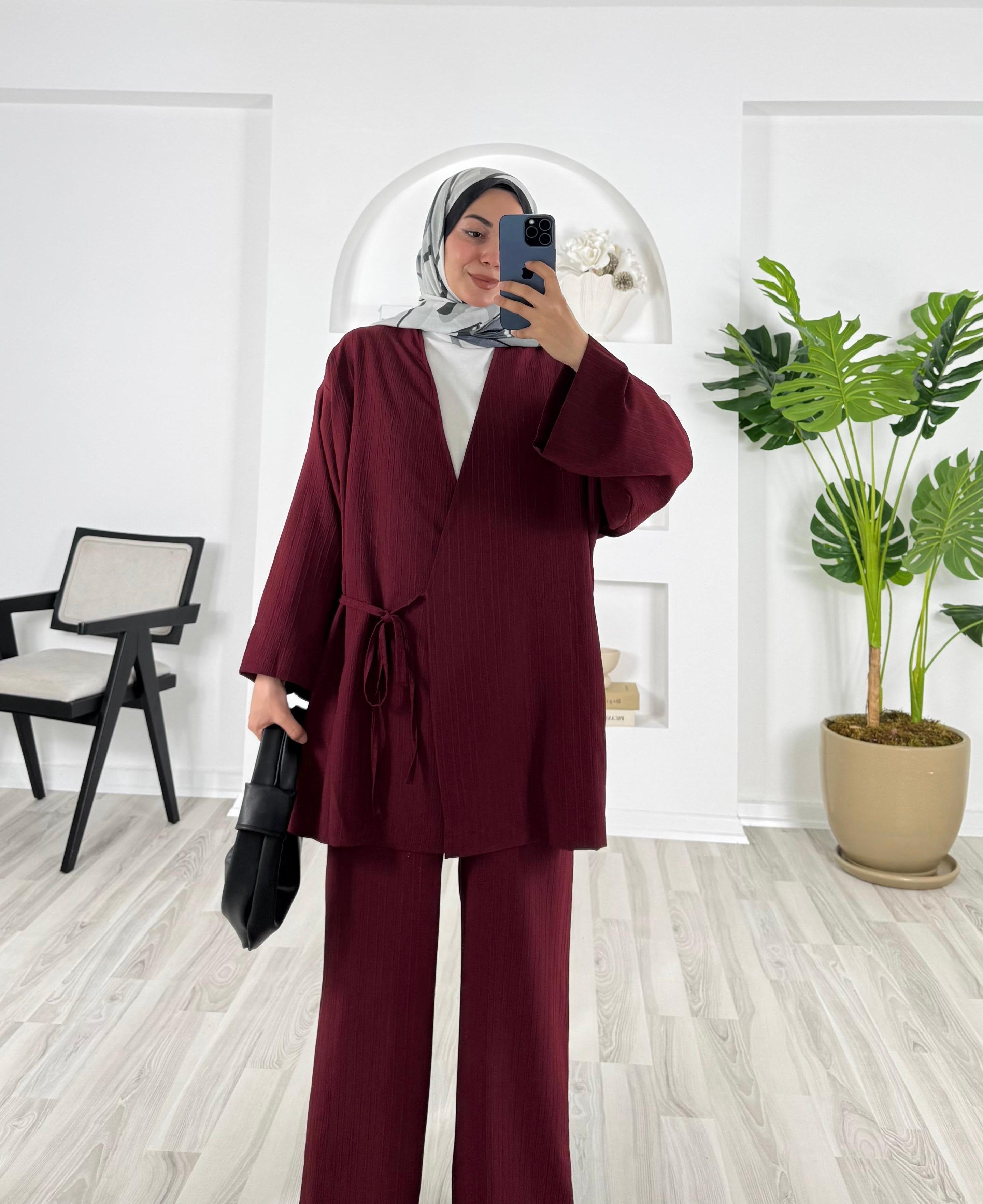 7700-dubai kumaş-önü bağlamalı pantolonlu takım-bordo (7700)