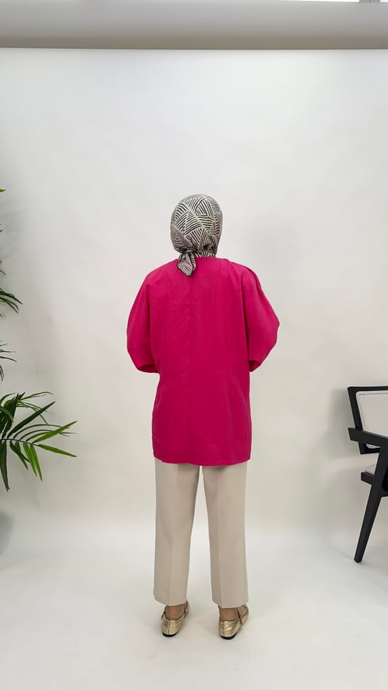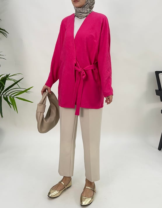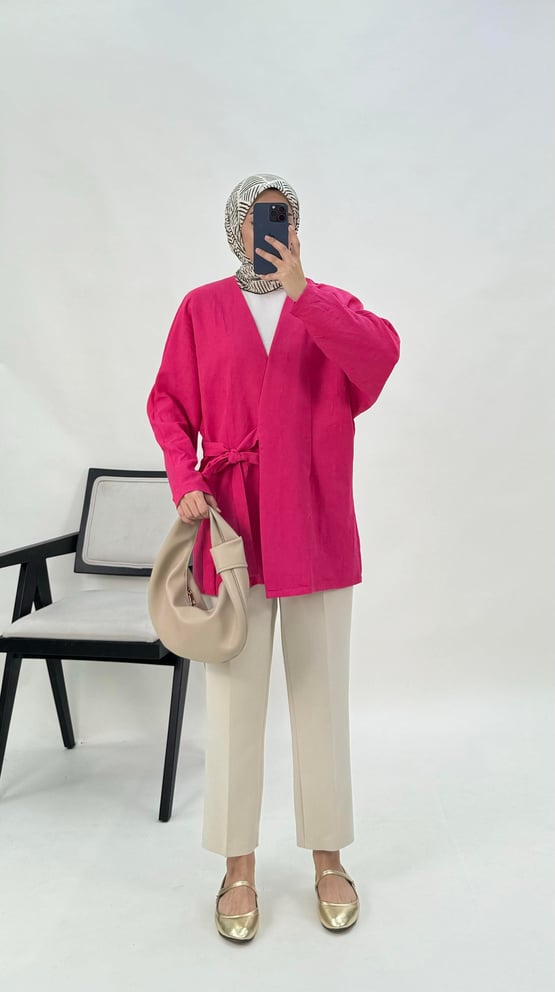 7854-kırışık kumaş-önden bağlamalı kimono-fuşya (7854)