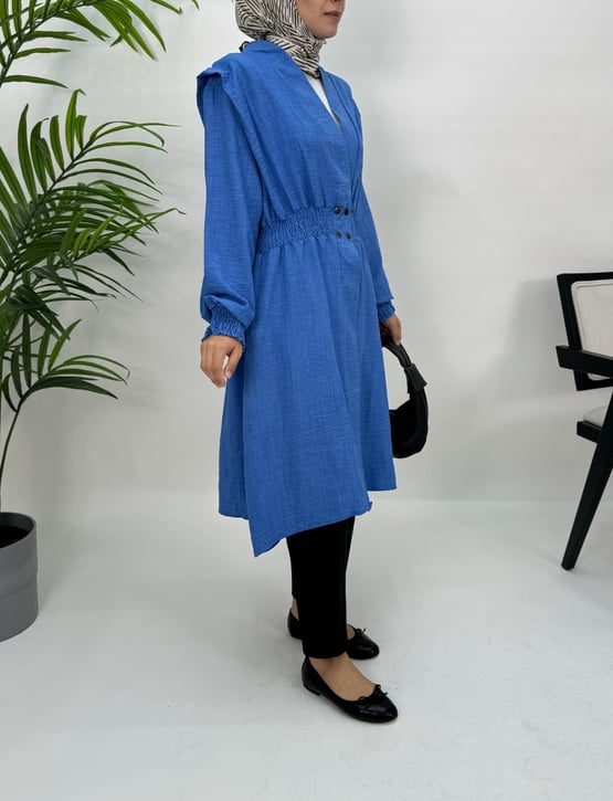 7855-melanj keten kumaş-bel ve bilek ucu büzgülü tunik-mavi (7855)