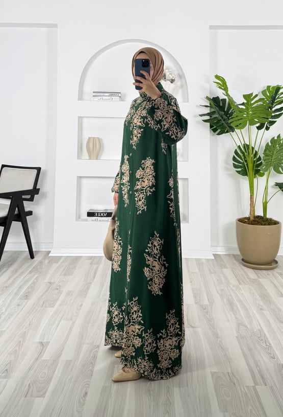 7857-pamuk viskon kumaş-boydan düğmeli etnik desenli elbise-yeşil (7857)