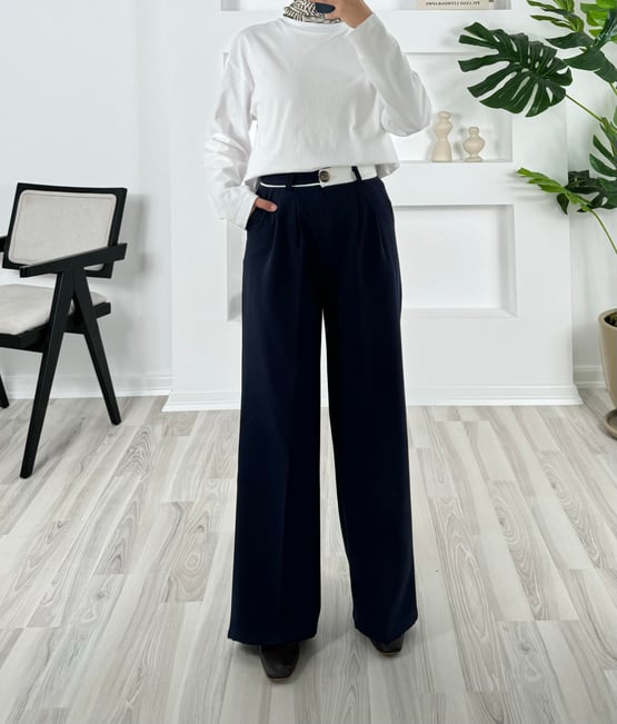 7861-dabıl krep kumaş-bel kısmı şerit detaylı pantolon-lacivert (7861)