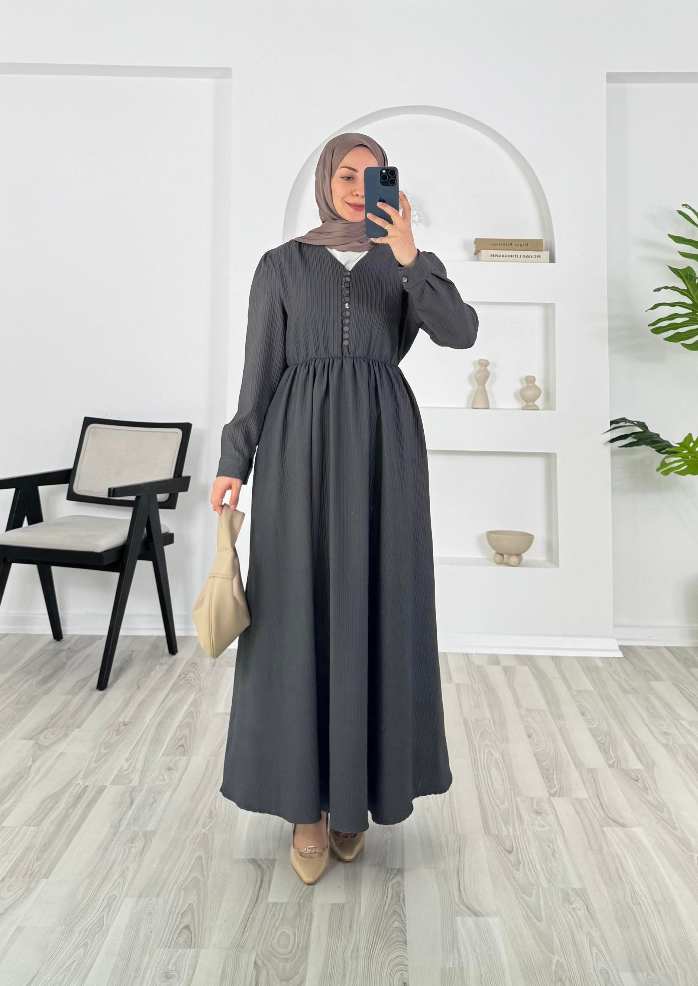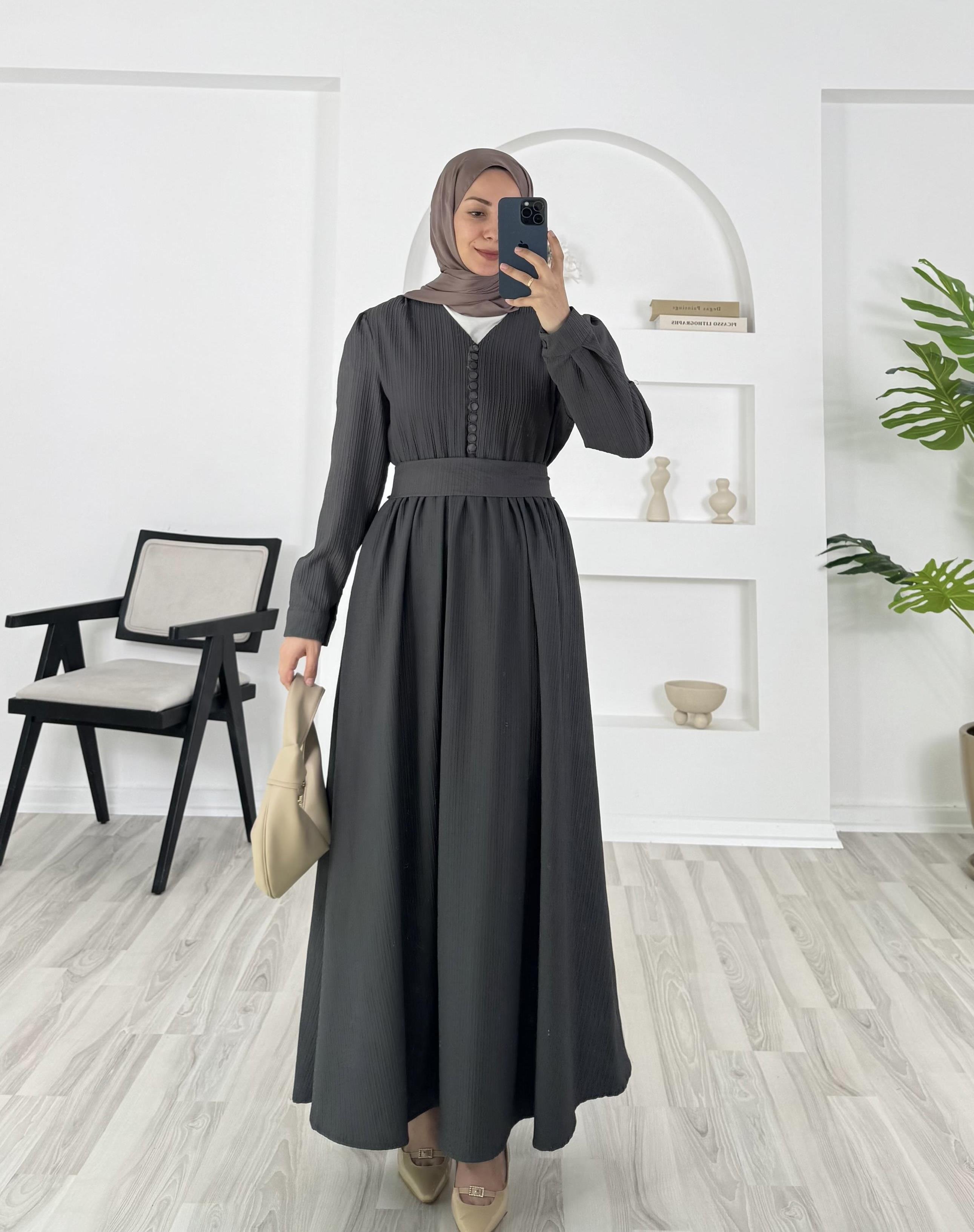 8095 -fitilli helena kumaş önü top dügmeli elbise - füme (8095)