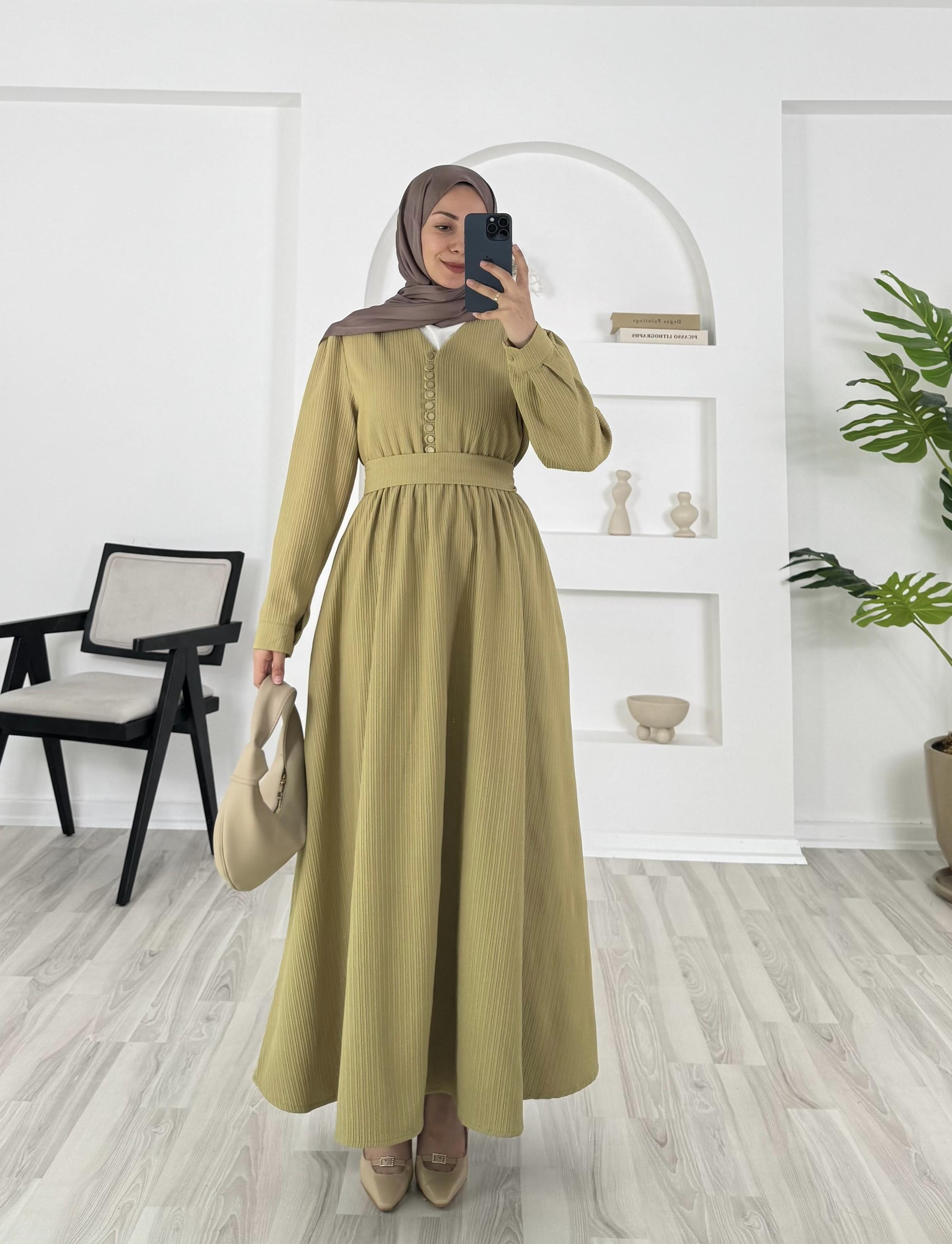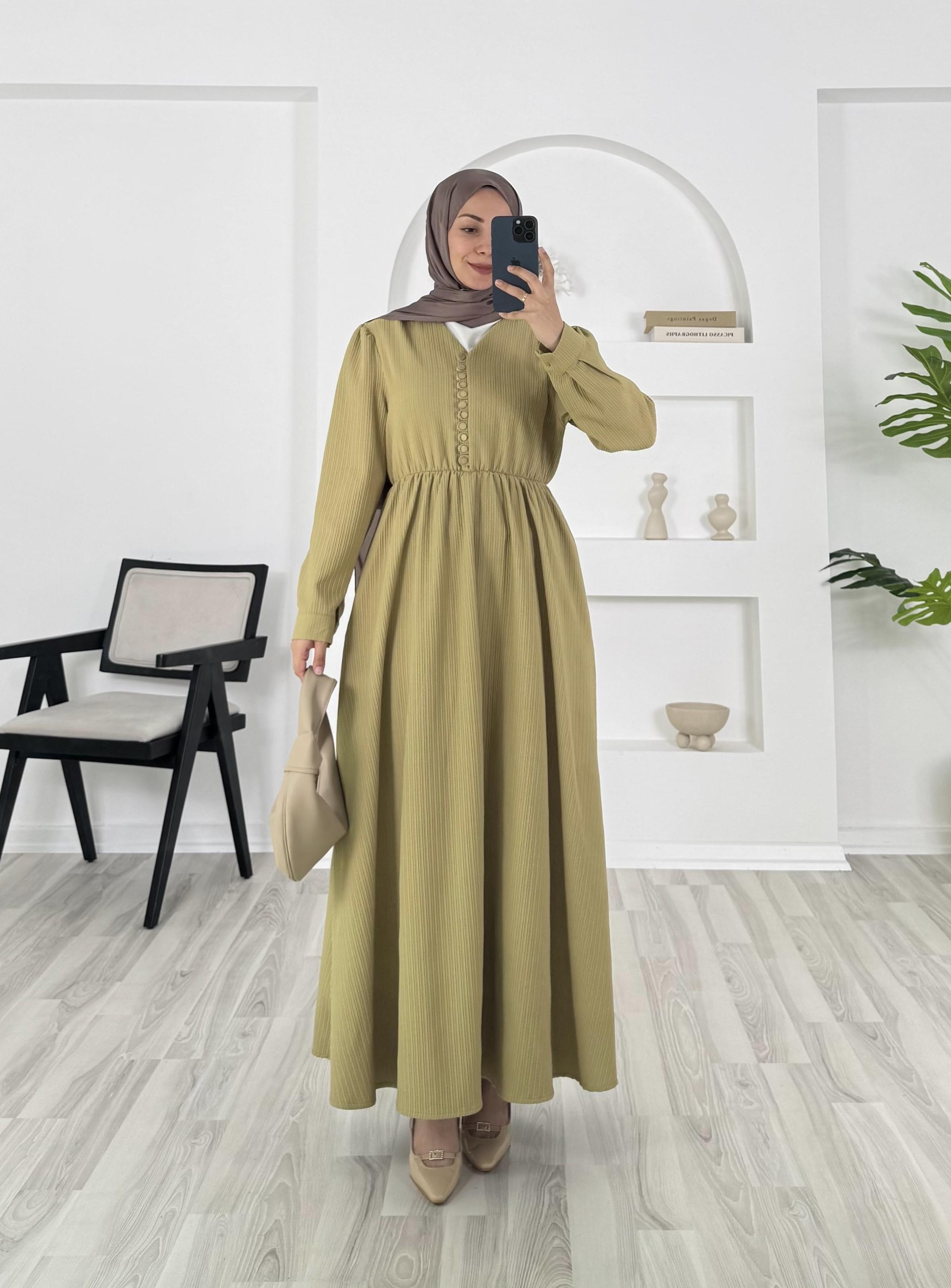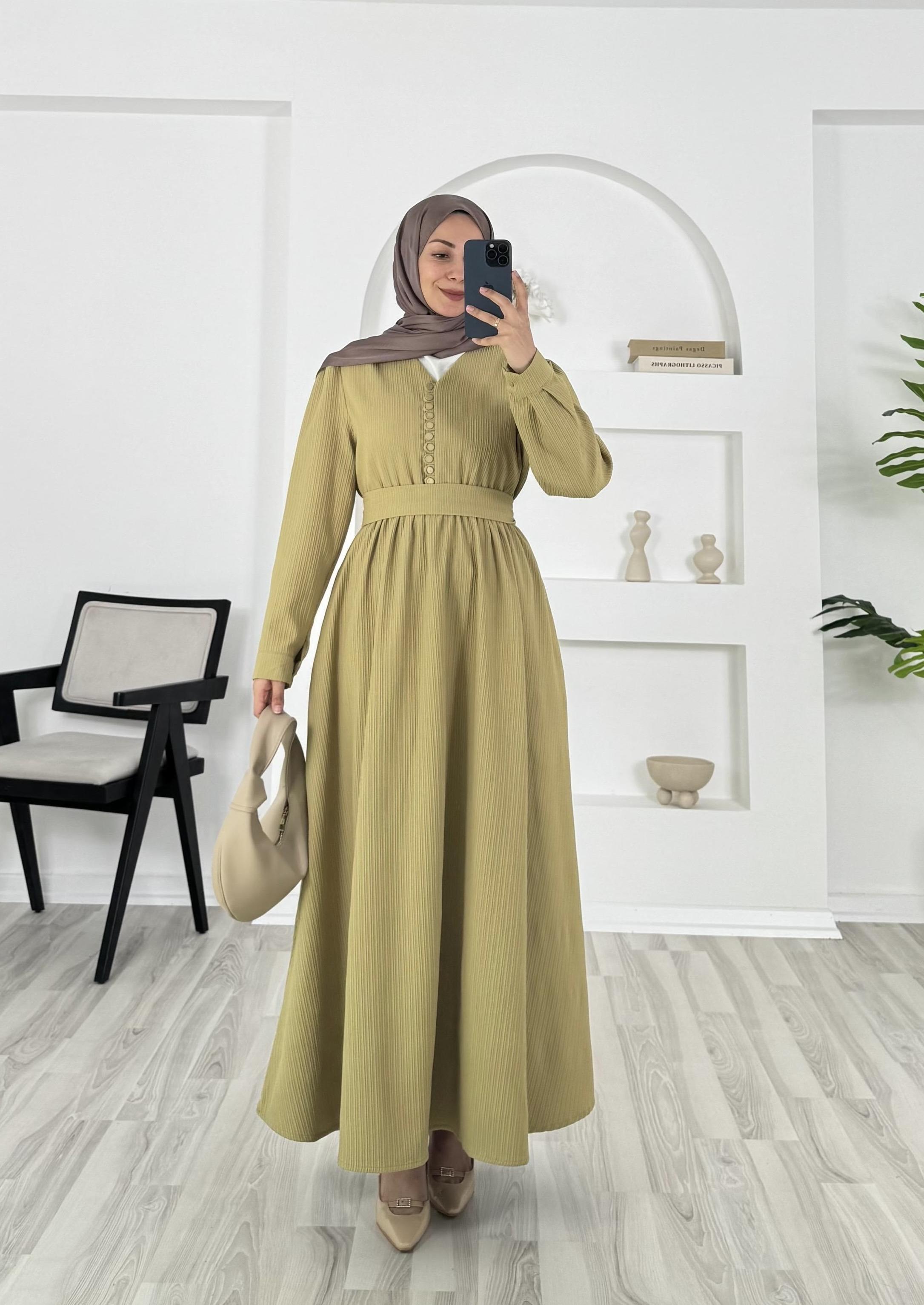 8095 -fitilli helena kumaş önü top dügmeli elbise - yag yeşili (8095)