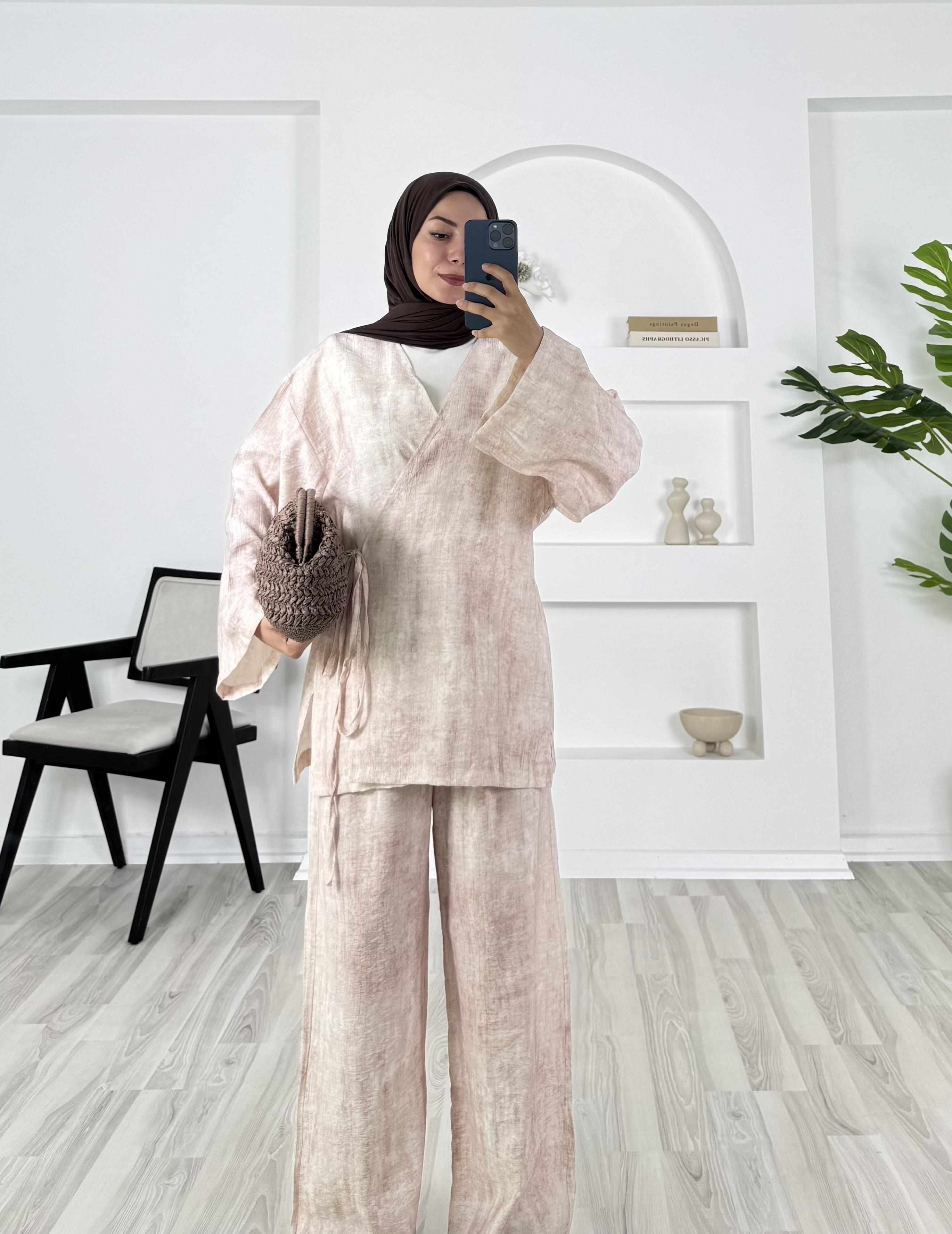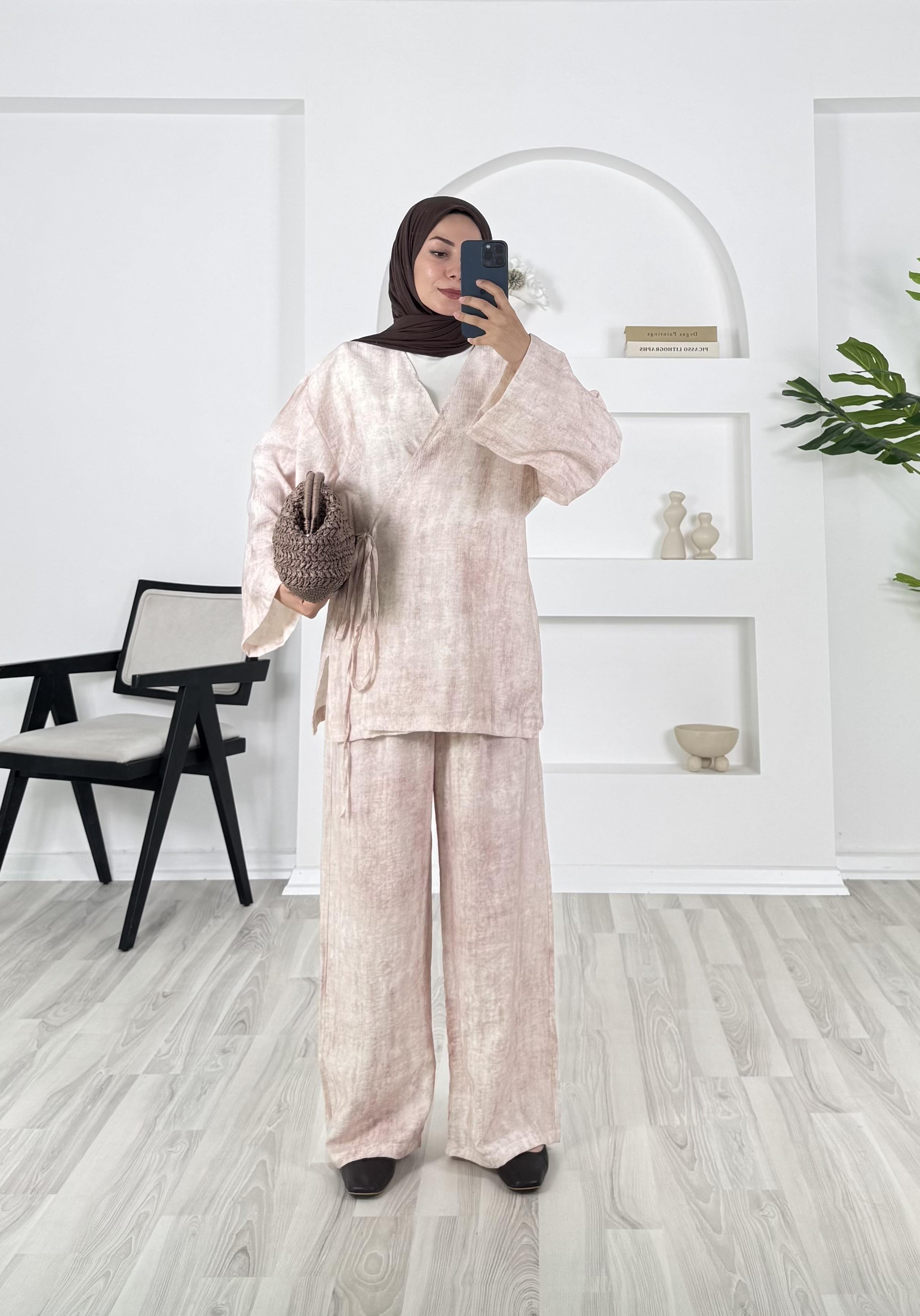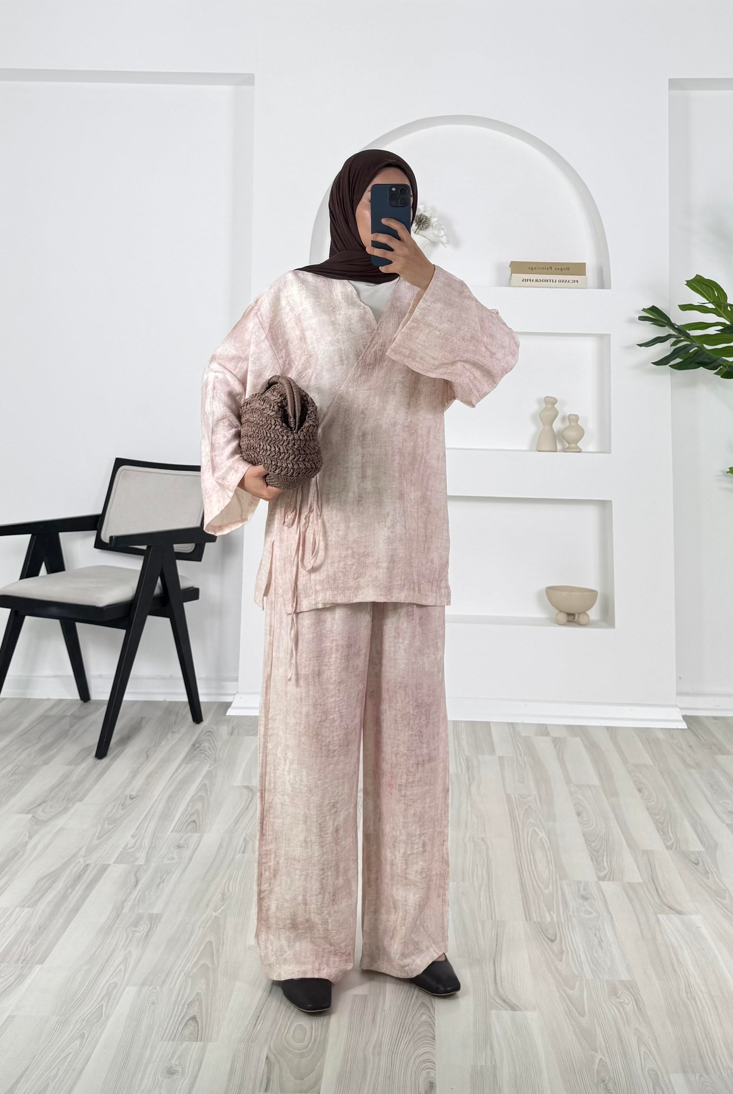 8136 - çilek kumaş batik desenli pantolonlu kimona takım - pudra (8136)