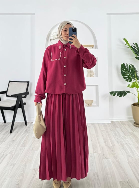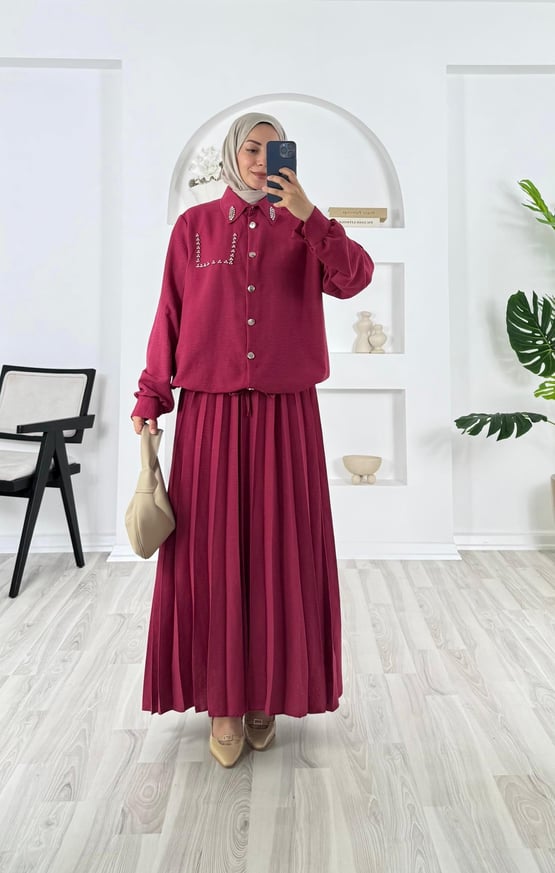 yaka ve göğüs boncuk işlemeli alttan büzülebilir etekli takım